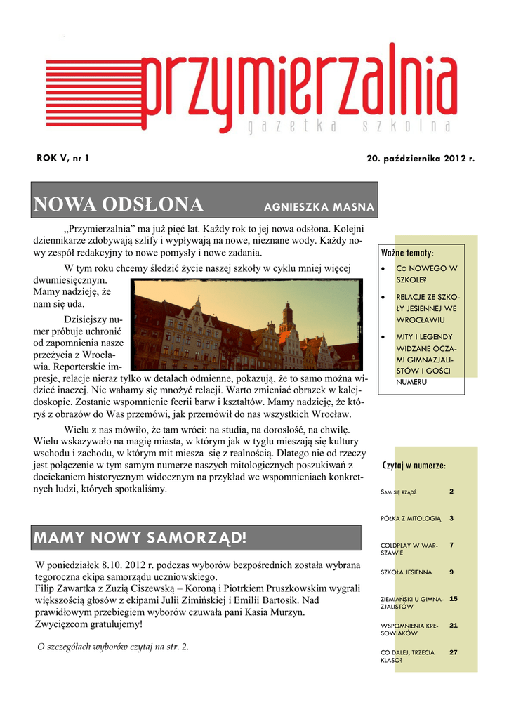 N A Z W A F I R M Y ROK V, nr 1 NOWA ODSŁONA 20. października 2012 r. AGNIESZKA MASNA „Przymierzalnia” ma już pięć lat. Każdy rok to jej nowa odsłona. Kolejni dziennikarze zdobywają szlify i wypływają na nowe, nieznane wody. Każdy nowy zespół redakcyjny to nowe pomysły i nowe zadania. W tym roku chcemy śledzić życie naszej szkoły w cyklu mniej więcej dwumiesięcznym. Mamy nadzieję, że nam się uda. Dzisiejszy numer próbuje uchronić od zapomnienia nasze przeżycia z Wrocławia. Reporterskie impresje, relacje nieraz tylko w detalach odmienne, pokazują, że to samo można widzieć inaczej. Nie wahamy się mnożyć relacji. Warto zmieniać obrazek w kalejdoskopie. Zostanie wspomnienie feerii barw i kształtów. Mamy nadzieję, że któryś z obrazów do Was przemówi, jak przemówił do nas wszystkich Wrocław. Wielu z nas mówiło, że tam wróci: na studia, na dorosłość, na chwilę. Wielu wskazywało na magię miasta, w którym jak w tyglu mieszają się kultury wschodu i zachodu, w którym mit miesza się z realnością. Dlatego nie od rzeczy jest połączenie w tym samym numerze naszych mitologicznych poszukiwań z dociekaniem historycznym widocznym na przykład we wspomnieniach konkretnych ludzi, których spotkaliśmy. MAMY NOWY SAMORZĄD! W poniedziałek 8.10. 2012 r. podczas wyborów bezpośrednich została wybrana tegoroczna ekipa samorządu uczniowskiego. Filip Zawartka z Zuzią Ciszewską – Koroną i Piotrkiem Pruszkowskim wygrali większością głosów z ekipami Julii Zimińskiej i Emilii Bartosik. Nad prawidłowym przebiegiem wyborów czuwała pani Kasia Murzyn. Zwycięzcom gratulujemy! szczegółach wyborów nana str.str…. 2. OO szczegółach wyborówczytaj czytaj Ważne tematy: CO NOWEGO W SZKOLE? RELACJE ZE SZKOŁY JESIENNEJ WE WROCŁAWIU MITY I LEGENDY WIDZANE OCZAMI GIMNAZJALISTÓW I GOŚCI NUMERU Czytaj w numerze: SAM SIĘ RZĄDŹ 2 PÓŁKA Z MITOLOGIĄ 3 COLDPLAY W WARSZAWIE 7 SZKOŁA JESIENNA 9 ZIEMIAŃSKI U GIMNA- 15 ZJALISTÓW WSPOMNIENIA KRESOWIAKÓW 21 CO DALEJ, TRZECIA KLASO? 27 Sam się rządź W gimnazjum został wybrany samorząd uczniowski. Po całkowitej ciszy wyborczej obejmującej nie tylko ostatni dzień przed wyborami, ale i cały czas kampanii wyborczej, na korytarzu gimnazjum pojawiła się urna wyborcza. Nauczycielka nadzorująca prawidłowość procedur przygotowała listy uczniów, karty do głosowania, a co najważniejsze- listę kandydatów. W wyborach samorządo- wych naszego gimnazjum obowiązuje system zbliżony do prezydenckiego. Prezydent Stanów Zjednoczonych Ameryki jest jednocześnie szefem rządu, nie posiada za to żadnej władzy ustawodawczej. „WŁADZA TO MOŻLIWOŚĆ SŁUŻENIA INNYM, A NIE FANFARY KU NASZEJ CZCI” J. DONALD WALTERS Przewodniczący samorządu szkolnego nie jest szefem rządu sensu stricto, a z pewnością nie posiada władzy ustawodawczej. W toku kampanii wybiera sobie jednak, podobnie jak w Ameryce, wiceprzewodniczących, z którymi chciałby współpracować, a obywatele uprawnieni do głosowania wybierają całe ekipy. Co prawda my nie potrzebujemy Kolegium Elektorów, bo stosujemy wybory bezpośrednie, ale, tak jak tam, zwycięzca zgarnia wszystko. Jeśli np. X dostanie 30 głosów, a Y 29, to Y nie stanie się wiceprzewodniczącym. Będzie po prostu wielkim przegranym. Przewodniczącym zostaje X, a zastępcami ci, których zaprosił do ekipy. Poprzedni przewodniczący- Józek zrobił na facebooku stronę samorządu. Na bieżąco wrzucał tam informacje o tym, co dzieW naszej małej szkole nigdy nie zdarzyło się, by je się w szkole. Teraz postartowało więcej niż dwie dobną stronę prowadzą nauczyciele. ekipy. W tym roku nie tylko kampania była nieNie wiadomo co planuje typowa. Okazało się, że w samorząd. Może coś fajszranki stanęły aż trzy nego. Pierwsza próba już ekipy. Wszyscy kandydaci podczas dnia nauczyciela. są kolegami z klasy. Może wreszcie uda się Ekipa Julki to dziewczyny zorganizować jakieś dyskoteki. A może nic. z III b, Emila chciała stworzyć zespół łączony z obu trzecich klas, Filip zaprosił do współpracy Zuzię i Piotrka ze swojej klasy. Atmosfera zrobiła się dziwna. Rozdrobienie polityczne sprzyja napięciom. Ale cukierki były pyszne. Redakcja Ponieważ nie było żadnej kampanii, wybory były co najwyżej rankingiem popularności. Wygrał Filip i docenił ten fakt, rozdzielając po ogłoszeniu zwycięstwa, pyszne cukierki. Niech wszyscy wiedzą, kogo lubią. Wywiad z Filipem Zawartką, nowym przewodniczącym REDAKCJA: Co chcecie osiągnąć będąc w samorządzie? FILIP ZAWARTKA: Chcemy żeby nasza szkoła była lepsza. Chcę żeby nasza szkoła dawała uczniom więcej możliwości, żeby mogli rozwijać swoje zainteresowania. R. A jakie są twoje zainteresowania? I jak wyobrażasz sobie ich Str. 2 rozwój na terenie szkoły? F.Z.: Filmy, czasami też sport, przede wszystkim teatr, no i oczywiście kino. Chciałbym rozpropagować Klub Łazików Teatralnych wśród uczniów. Planuję prowadzić stronę samorządu na facebook’u i tam informować o nadchodzących imprezach, zabawach etc. Może będziecie chcieli, żebym zorganizo- wał dyskotekę? Może wyjścia do Iluzjonu? Pewnie życie pokaże. R. A z drugiej strony na co wy liczycie? Czego się za tę pracę spodziewacie? F.Z. Na pewno punkty do liceum i z zachowania, ale to nie jest dla mnie najważniejsze, bo satysfakcja że robię coś dobrego na rzecz naszej szkoły jest tym czymś. PÓŁKA Z MITOLOGIĄ Baśń prawdę Ci powie Z Michałem Malinowskim, założycielem Muzeum Opowiadaczy Historii, rozmawia Marta Boj Redaktor: Dzień dobry Panie Michale. Czy mogłabym zadać Panu kilka pytań? Michał Malinowski: Tak, oczywiście! R: Dziękuję. Co skłoniło Pana do stworzenia „Muzeum opowiadaczy historii”? MM: To długa historia. Głównym powodem założenia muzeum była moja obserwacja, że w Polsce zanika zwyczaj ustnego opowiadania historii. Postarałem się więc