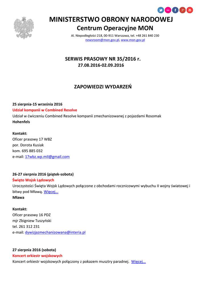 MINISTERSTWO OBRONY NARODOWEJ Centrum Operacyjne MON Al. Niepodległości 218, 00-911 Warszawa, tel. +48 261 840 230 [email protected], www.mon.gov.pl SERWIS PRASOWY NR 35/2016 r. 27.08.2016-02.09.2016 ZAPOWIEDZI WYDARZEŃ 25 sierpnia-15 września 2016 Udział kompanii w Combined Resolve Udział w ćwiczeniu Combined Resolve kompanii zmechanizowanej z pojazdami Rosomak Hohenfels Kontakt: Oficer prasowy 17 WBZ por. Dorota Kusiak kom. 695 885 032 e-mail: [email protected] 26-27 sierpnia 2016 (piątek-sobota) Święto Wojsk Lądowych Uroczystości Święta Wojsk Lądowych połączone z obchodami rocznicowymi wybuchu II wojny światowej i bitwy pod Mławą. Więcej... Mława Kontakt: Oficer prasowy 16 PDZ mjr Zbigniew Tuszyński tel. 261 312 231 e-mail: [email protected] 27 sierpnia 2016 (sobota) Koncert orkiestr wojskowych Koncert orkiestr wojskowych połączony z pokazem musztry paradnej. Więcej... Poznań (Plac Wolności) Kontakt: Oficer prasowy 2 SLT por. Grzegorz Jasianek tel. 261 572 262, kom. 519 038 210 e-mail: [email protected] 28 sierpnia 2016 (niedziela) Piknik Lotniczy XIII Międzynarodowy Piknik Lotniczy połączony z obchodami 80-lecia powstania Areoklubu BielskoBialskiego. W programie udział Zespołu Akrobatycznego PZL-130 „Orlik”. Bielsko-Biała (Lotnisko Areoklubu, ul. Cieszyńska 321) Kontakt: Oficer prasowy 4 SLSZ kpt. Magdalena Busz kom. 519 038 406 e-mail: [email protected] 28 sierpnia 2016 (niedziela) Promocja oficerska Promocja oficerska na pokładzie ORP „Błyskawica”. Gdynia Kontakt: Rzecznik prasowy Dowódcy 3 FO kmdr ppor. Radosław Pioch kom. 601 412 722 e-mail: [email protected] 28 sierpnia 2016 (niedziela) Bieg pamięci poległych żołnierzy Bieg „Ku Pamięci poległych żołnierzy 12 Brygady Zmechanizowanej”. Szczecin Kontakt: Oficer prasowy 12 BZ kpt. Janusz Błaszczak kom. 727 012 658 e-mail: [email protected] 28 sierpnia 2016 (poniedziałek) Szkolenie komponentu lotniczego Rozpoczęcie szkolenia komponentu lotniczego US w ramach Aviation Detachment 16/4. Łask/Krzesiny Kontakt: Oficer prasowy 32 BLT kpt. Joanna Motylińska-Szczych tel. 261 554 447; kom. 519 039 248 e-mail: [email protected] 28 sierpnia-17 września 2016 Szkolenie poligonowe Szkolenie poligonowe żołnierzy 21 Dywizjonu Artylerii Przeciwlotniczej i 21 Batalionu Logistycznego. Nowa Dęba (OSPWL Dęba) Kontakt: Oficer prasowy 21 BSP kpt. Konrad Radzik kom. 691 677 515 e-mail: [email protected] 29 sierpnia – 10 września 2016 Udział żołnierzy w XXIV MSPO Udział żołnierzy z jednostek logistycznych w XXIV Międzynarodowym Salonie Przemysłu Obronnego. Kielce Kontakt: Oficer prasowy 1 Blog por. Natalia Delińska kom. 605 738 499 e-mail: [email protected] Oficer prasowy CSLOG kpt. Daniel Chądzyński tel. 261 484 379, kom. 727 012 236 e-mail: [email protected] 01 września 2016 (czwartek) 77. ROCZNICA WYBUCHU II WOJNY ŚWIATOWEJ Uroczystości z okazji 77. rocznicy wybuchu II wojny światowej. Obchody odbędą się na terenie całego kraju. Polska Kontakt: Rzecznik prasowy DGRSZ ppłk Szczepan Głuszczak tel. 261 825 060; kom. 722 387 212 e-mail: [email protected] Bydgoszcz Oficer prasowy 1 Blog por. Natalia Delińska kom. 605 738 499 e-mail: [email protected] Opole Oficer prasowy 10 Blog por. Piotr Płuciennik tel. 261 625 611, kom. 669 924 221 e-mail: [email protected] Grupa Oficer prasowy CSLOG kpt. Daniel Chądzyński tel. 261 484 379, kom. 727 012 236 e-mail: [email protected] Elbląg Oficer prasowy 16 PDZ mjr Zbigniew Tuszyński tel. 261 312 231 e-mail: [email protected] Inowrocław, Dęblin, Nisko, Głogów Oficer prasowy 2 Pinż kpt. Sylwester Ludwiczak tel. 261 436 243 e-mail: [email protected] Szczecin, Cmentarz Centralny Oficer prasowy 12 SDZ por. Błażej Łukaszewski kom. 695 301 720 e-mail: [email protected] Słupsk, Plac Zwycięstwa Oficer prasowy 7 BOW kpt. Karolina Krzewina-Hyc kom. 721 890 408 e-mail: [email protected] Poznań, ul. Wojska Polskiego, Garnizon Poznań Oficer prasowy kpt. Piotr Wójcik tel. 261 575 227, kom. 785 402 919 e-mail: [email protected] Wrocław Oficer prasowy CSWIiChem kpt. Marek Gwóźdź tel. 261 657 283, kom. 723 694 403 e-mail: [email protected] 01-16 września 2016 Ćwiczenie „Northern Coast 2016” Udział ORP Kaszub w międzynarodowym ćwiczeniu „Northern Coast 2016”. Morze Bałtyckie, Morze Północne Kontakt: Oficer prasowy 3 FO kpt. Przemysław Płonecki tel. 261 266 971, kom. 695 404 979 e-mail: [email protected] 01-30 września 2016 Szkolenie poligonowe Szkolenie poligonowe pododdziałów 1 BPanc pk. „Lampart-16”. Nowa Dęba (OSPWL Dęba) Kontakt: Oficer prasowy 1 BPanc. kpt. Zbigniew Gierczak tel. 22/681 20 61 kom. 518 658 911 e-mail: [email protected] 01-30 września 2016 Szkolenie poligonowe Szkolenie poligonowe pododdziałów 1 BPanc. OSPWL Wędrzyn Kontakt: Oficer prasowy 1 BPanc. kpt. Zbigniew Gierczak tel. 22/681 20 61 kom. 518 658 911 e-mail: [email protected] KRONIKA 21 sierpnia 2016 (niedziela) Piknik lotniczy w Łososinie Dolnej Dzisiejsza uroczystość przypomina nam jak ważne było lotnictwo w całej historii Polski i w historii Wojska Polskiego – powiedział minister obrony narodowej Antoni Macierewicz w Łososinie Dolnej koło Nowego Sącza. Więcej... 21 sierpnia 2016 (niedziela) 96. rocznica bitwy pod Sarnową Górą W niedzielę w okolicach Sarnowej Góry odbyły się uroczystości Święta Wojska Polskiego połączone z obchodami 96. rocznicy Bitwy pod Sarnową Górą. W uroczystościach uczestniczył szef Gabinetu Politycznego Ministra Obrony Narodowej Bartłomiej Misiewicz. Więcej... 23 sierpnia 2016 (wtorek) Wizyta delegacji Kongresu USA w MON We wtorek podsekretarz stanu w MON Tomasz Szatkowski spotkał się z delegacją Kongresu USA. Rozmowy dotyczyły polsko-amerykańskiej współpracy obronnej, wyzwań dla bezpieczeństwa oraz zaangażowania Polski, USA i innych sojuszników na rzecz ich przeciwdziałania. Więcej... 24 sierpnia 2016 (środa) Nowe logo WBH Wybór tego wielkiego nazwisk