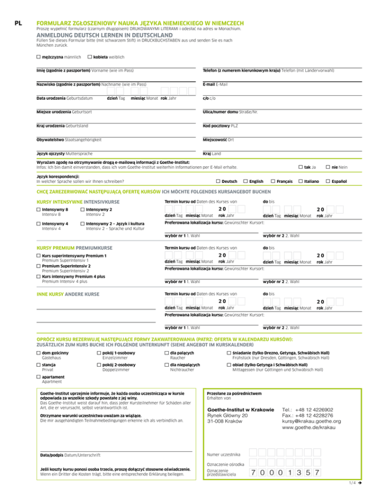 PL FORMULARZ ZGŁOSZENIOWY NAUKA JĘZYKA NIEMIECKIEGO W NIEMCZECH Proszę wypełnić formularz (czarnym długopisem) DRUKOWANYMI LITERAMI i odesłać na adres w Monachium. ANMELDUNG DEUTSCH LERNEN IN DEUTSCHLAND Füllen Sie dieses Formular bitte (mit schwarzem Stift) in DRUCKBUCHSTABEN aus und senden Sie es nach München zurück. mężczyzna männlich kobieta weiblich Imię (zgodnie z paszportem) Vorname (wie im Pass) Telefon (z numerem kierunkowym kraju) Telefon (mit Ländervorwahl) Nazwisko (zgodnie z paszportem) Nachname (wie im Pass) E-mail E-Mail Data urodzenia Geburtsdatum c/o c/o dzień Tag miesiąc Monat rok Jahr Miejsce urodzenia Geburtsort Ulica/numer domu Straße/Nr. Kraj urodzenia Geburtsland Kod pocztowy PLZ Obywatelstwo Staatsangehörigkeit Miejscowość Ort Język ojczysty Muttersprache Kraj Land Wyrażam zgodę na otrzymywanie drogą e-mailową informacji z Goethe-Institut: Infos: Ich bin damit einverstanden, dass ich vom Goethe-Institut weiterhin Informationen per E-Mail erhalte. Język korespondencji: In welcher Sprache sollen wir Ihnen schreiben? Deutsch English Français tak Ja nie Nein Italiano Español CHCĘ ZAREZERWOWAĆ NASTĘPUJĄCĄ OFERTĘ KURSÓW ICH MÖCHTE FOLGENDES KURSANGEBOT BUCHEN KURSY INTENSYWNE INTENSIVKURSE Intensywny 8 Intensywny 2 Intensiv 8 Intensiv 2 Intensywny 4 Intensywny 2 – Język i kultura Intensiv 4 Intensiv 2 – Sprache und Kultur Termin kursu od Daten des Kurses von do bis 20 dzień Tag miesiąc Monat 20 rok Jahr dzień Tag miesiąc Monat Preferowana lokalizacja kursu: Gewünschter Kursort: wybór nr 1 1. Wahl KURSY PREMIUM PREMIUMKURSE Kurs superintensywny Premium 1 Premium SuperIntensiv 1 Premium SuperIntensiv 2 Premium SuperIntensiv 2 Kurs intensywny Premium 4 plus Premium Intensiv 4 plus INNE KURSY ANDERE KURSE wybór nr 2 2. Wahl Termin kursu od Daten des Kurses von do bis 20 dzień Tag miesiąc Monat 20 rok Jahr dzień Tag miesiąc Monat rok Jahr Preferowana lokalizacja kursu: Gewünschter Kursort: wybór nr 1 1. Wahl wybór nr 2 2. Wahl Termin kursu od Daten des Kurses von do bis 20 dzień Tag miesiąc Monat rok Jahr 20 rok Jahr dzień Tag miesiąc Monat rok Jahr Preferowana lokalizacja kursu: Gewünschter Kursort: wybór nr 1 1. Wahl wybór nr 2 2. Wahl OPRÓCZ KURSU REZERWUJĘ NASTĘPUJĄCE FORMY ZAKWATEROWANIA (PATRZ: OFERTA W KALENDARZU KURSÓW): ZUSÄTZLICH ZUM KURS BUCHE ICH FOLGENDE UNTERKUNFT (SIEHE ANGEBOT IM KURSKALENDER) dom gościnny pokój 1-osobowy dla palących śniadanie (tylko Drezno, Getynga, Schwäbisch Hall) Gästehaus Einzelzimmer Raucher Frühstück (nur Dresden, Göttingen, Schwäbisch Hall) stancja pokój 2-osobowy dla niepalących obiad (tylko Getynga i Schwäbisch Hall) Privat Doppelzimmer Nichtraucher Mittagessen (nur Göttingen und Schwäbisch Hall) apartament Apartment Goethe-Institut uprzejmie informuje, że każda osoba uczestnicząca w kursie odpowiada za wszelkie szkody powstałe z jej winy. Das Goethe-Institut weist darauf hin, dass jeder Kursteilnehmer für Schäden aller Art, die er verursacht, selbst verantwortlich ist. Przesłane za pośrednictwem Erhalten von Otrzymane warunki uczestnictwa uważam za wiążące. Die mir ausgehändigten Teilnahmebedingungen erkenne ich als verbindlich an. Goethe-Institut w Krakowie Rynek Główny 20 31-008 Kraków Data/podpis Datum/Unterschrift Numer uczestnika Oznaczenie ośrodka Jeśli koszty kursu ponosi osoba trzecia, proszę dołączyć stosowne oświadczenie. Wenn ein Dritter die Kosten trägt, bitte eine entsprechende Erklärung beilegen. Oznaczenie przedstawiciela Tel.: +48 12 4226902 Fax.:+48 12 4228276 [email protected] www.goethe.de/krakau 7 0 0 0 1 3 5 7 1 / 4 è PL OKREŚLENIE ZNAJOMOŚCI JĘZYKA NIEMIECKIEGO Ponieważ chcemy skierować Cię na właściwy kurs, prosimy o udzielenie odpowiedzi na następujace pytania: EINSCHÄTZUNG DEUTSCHKENNTNISSE Damit wir Sie in den für Sie geeigneten Kurs einschreiben können, bitten wir Sie, die folgenden Fragen vollständig zu beantworten: Czy w jakimkolwiek stopniu znasz język niemiecki? Haben Sie Vorkenntnisse? tak Ja nie Nein Jeśli Twoja odpowiedź to „tak”, przejdź do dalszych pytań. Fahren Sie bitte fort, wenn Sie „Ja“ angekreuzt haben. Wie lange haben Sie Deutsch gelernt? Monate Jahre Stunde/n pro Woche durchschnittlich Haben Sie eine der folgenden Prüfungen abgelegt? Goethe-Zertifikat A1: Start Deutsch 1 Goethe-Zertifikat B1 Goethe-Zertifikat A2: Goethe-Zertifikat B2 Goethe-Zertifikat C2: Start Deutsch 2 Großes Deutsches Sprachdiplom Andere Prüfung Goethe-Zertifikat C1 TestDaF Mit welchem Lehrbuch haben Sie zuletzt gelernt? A1 Auf welcher Niveaustufe war Ihr letzter Kurs? A2 B1 B2 C1 C2 Wenn Sie an einem Goethe-Institut im In- oder Ausland Deutsch lernen oder gelernt haben, werden Ihnen unsere dortigen Kolleginnen und Kollegen gern eine Einstufungsempfehlung geben: Frau / Herr hat vom bis im GI die Kursstufe mit Wir empfehlen einen Folgekurs im Niveaubereich: A1 A2 B1 B2 UE besucht. Pieczątka (ośrodka) Stempel (Institut) C1 C2 Całkowicie wypełniony i podpisany formularz zgłoszenia należy odesłać pocztą elektroniczną (zeskanowany dokument) na adres [email protected] 2 / 4 è PL WARUNKI UCZESTNICTWA 1. Ogólny warunek uczestnictwa 7. Zakwaterowanie Kursant musi mieć przynajmniej 18 lat. 7.1. 2. Uczestnictwo w kursie i potwierdzenie zgłoszenia GI oferuje na życzenie zakwaterowanie za opłatą czynszową. Rezerwację zakwaterowania należy podać w zgłoszeniu. Nie istnieje możliwość obejrzenia miejsca zakwaterowania przed rozpoczęciem kursu. 2.1. Po dokonaniu zgłoszenia kursant otrzyma od Goethe-Institut e. V. (dalej zwanego GI) potwierdzenie zgłoszenia (zwane dalej potwierdzeniem zgłoszenia) na wybrane zajęcia, zakwaterowanie oraz wyżywienie (zwane łącznie kursem). Umowa zyskuje moc obowiązującą wraz z otrzymaniem potwierdzenia zgłoszenia przez kursanta. 2.2. 2.3. Wraz z potwierdzeniem zgłoszenia przesłana zostanie faktura, zawierająca należną opłatę 