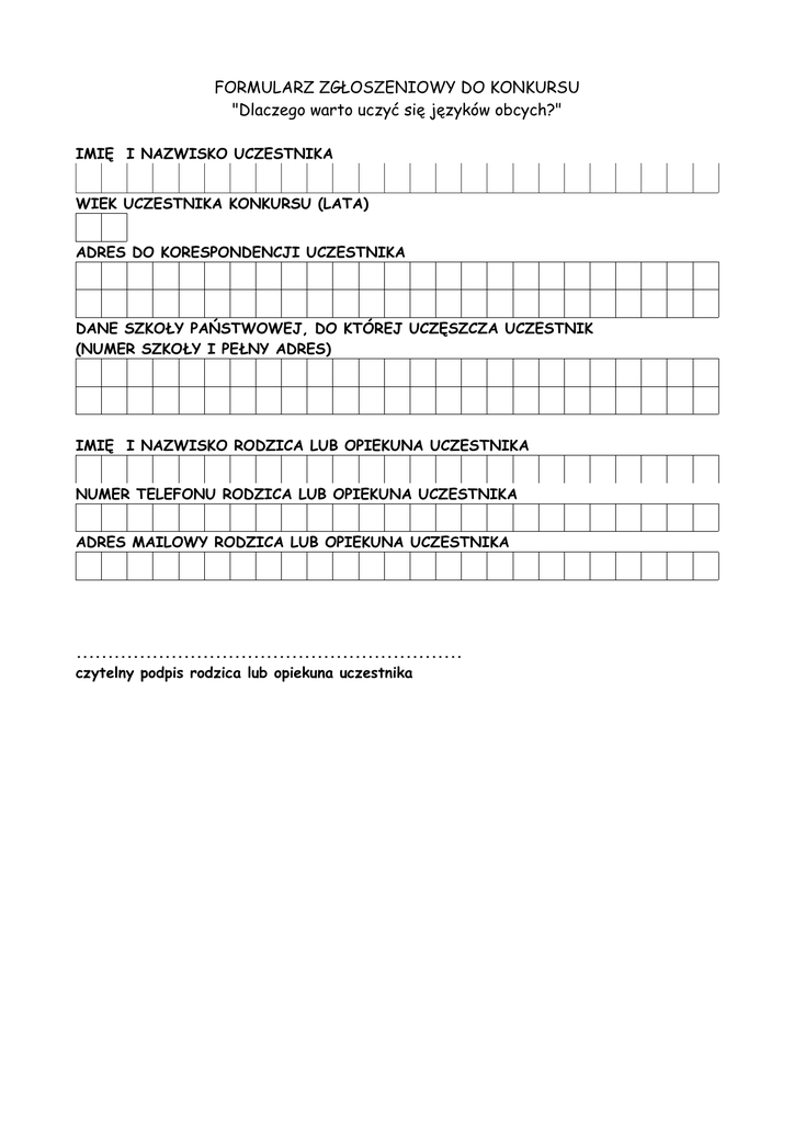 FORMULARZ ZGŁOSZENIOWY DO KONKURSU "Dlaczego warto uczyć się języków obcych?" IMIĘ I NAZWISKO UCZESTNIKA WIEK UCZESTNIKA KONKURSU (LATA) ADRES DO KORESPONDENCJI UCZESTNIKA DANE SZKOŁY PAŃSTWOWEJ, DO KTÓREJ UCZĘSZCZA UCZESTNIK (NUMER SZKOŁY I PEŁNY ADRES) IMIĘ I NAZWISKO RODZICA LUB OPIEKUNA UCZESTNIKA NUMER TELEFONU RODZICA LUB OPIEKUNA UCZESTNIKA ADRES MAILOWY RODZICA LUB OPIEKUNA UCZESTNIKA ............................................................. czytelny podpis rodzica lub opiekuna uczestnika REGULAMIN KONKURSU §1 POSTANOWIENIA OGÓLNE 1. Konkurs jest organizowany pod nazwą "Dlaczego warto uczyć się języków obcych?" i zwany dalej "Konkursem". 2. Organizatorem konkursu jest Szkoła Językowa Gold Fish, ul. Fabryczna 11, 05270 Marki, zwana dalej "Organizatorem". 3. Fundatorem nagród jest Szkoła Językowa Gold Fish, ul. Fabryczna 11, 05-270 Marki. 4. Regulamin Konkursu zostanie udostępniony na stronie internetowej www.gold-fish.pl oraz w siedzibie Organizatora. §2 WARUNKI I ZASADY UCZESTNICTWA W KONKURSIE 1. Uczestnikiem konkursu może być każda osoba, która a. uczęszcza do szkoły państwowej w mieście Marki, b. ma od 6 do 16 lat, c. zrealizuje zadanie konkursowe. 2. Warunkiem uczestnictwa w konkursie jest łączne spełnienie następujących warunków: a. osoba biorąca udział w konkursie musi posiadać status uczestnika zgodnie z § 2 pkt.1 b. osoba biorąca udział w konkursie musi dostarczyć wypełniony formularz zgłoszeniowy wraz ze zrealizowanym zadaniem konkursowym. 3. Zadanie konkursowe: odpowiedz na pytanie: "Dlaczego warto uczyć się języków obcych?", realizując projekt w postaci: plakatu, książki, komiksu, filmu, nagrania dźwiękowego lub prezentacji komputerowej. Projekt może być wykonany w języku polskim, angielskim, niemieckim, włoskim lub hiszpańskim. 4. Oceniana będzie staranność wykonania projektu, kreatywność i pomysłowość. 5. Prace konkursowe należy dostarczyć osobiście lub listownie do siedziby Szkoły Językowej Gold Fish przy ul. Fabrycznej 11, Marki do dnia 27, września 2013r. W przypadku listu liczy się data odbioru przesyłki przez Organizatora. §3 NAGRODY 1. Nagrodą główną w konkursie jest semestr nauki języka angielskiego w grupie w Szkole Językowej Gold Fish trwający od początku października 2013r. do 15 lutego 2014r. 2. Nagrodą za II i III miejsce są nagrody książkowe. 3. Ogłoszenie wyników konkursu nastąpi do dnia 4, października 2013r. i zostanie zamieszczone na stronie internetowej www.gold-fish.pl w zakładce Aktualności oraz na portalu Facebook. §4 DANE OSOBOWE UCZESTNIKÓW KONKURSU 1. Warunkiem udziału w Konkursie jest podanie przez Uczestnika Konkursu prawdziwych danych osobowych w Formularzu zgłoszeniowym. 2. Przystąpienie Uczestnika do Konkursu jest równoznaczne z akceptacją niniejszego Regulaminu oraz zgodą na przetwarzanie podanych przez niego danych osobowych przez Organizatora. Dane będą przetwarzane w celu przeprowadzenia niniejszego Konkursu oraz w związku z ogłoszeniem wyników Konkursu i zamieszczeniem artykułów promujących działalność Organizatora.