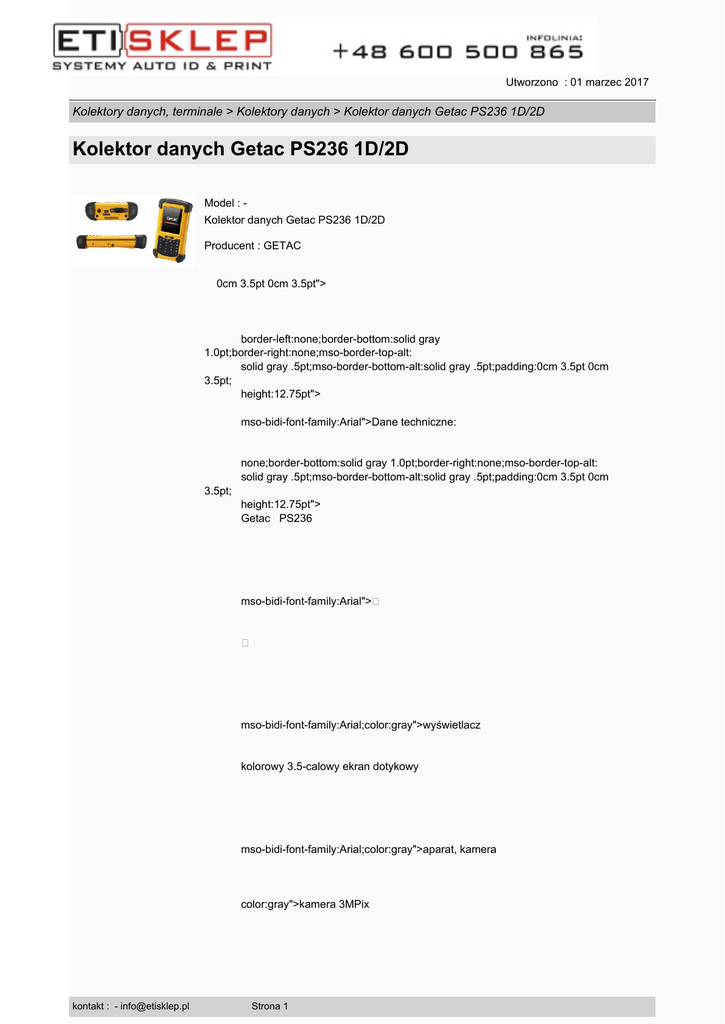 Utworzono : 01 marzec 2017 Kolektory danych, terminale > Kolektory danych > Kolektor danych Getac PS236 1D/2D Kolektor danych Getac PS236 1D/2D Model : Kolektor danych Getac PS236 1D/2D Producent : GETAC 0cm 3.5pt 0cm 3.5pt"> border-left:none;border-bottom:solid gray 1.0pt;border-right:none;mso-border-top-alt: solid gray .5pt;mso-border-bottom-alt:solid gray .5pt;padding:0cm 3.5pt 0cm 3.5pt; height:12.75pt"> mso-bidi-font-family:Arial">Dane techniczne: none;border-bottom:solid gray 1.0pt;border-right:none;mso-border-top-alt: solid gray .5pt;mso-border-bottom-alt:solid gray .5pt;padding:0cm 3.5pt 0cm 3.5pt; height:12.75pt"> Getac PS236 mso-bidi-font-family:Arial">� � mso-bidi-font-family:Arial;color:gray">wyświetlacz kolorowy 3.5-calowy ekran dotykowy mso-bidi-font-family:Arial;color:gray">aparat, kamera color:gray">kamera 3MPix kontakt : - [email protected] Strona 1 Utworzono : 01 marzec 2017 Kolektory danych, terminale > Kolektory danych > Kolektor danych Getac PS236 1D/2D Kolektor danych Getac PS236 1D/2D mso-bidi-font-family:Arial;color:gray">ekran dotykowy color:gray">VGA (480 x 640 pikseli) mso-bidi-font-family:Arial;color:gray">procesor color:gray">Marvell XScale PXA310� 806MHz mso-bidi-font-family:Arial;color:gray">system operacyjny color:gray">Microsoft� Windows Mobile 6.5 Pro mso-bidi-font-family:Arial;color:gray">pamięć: color:gray">128 lub 256MB MDDR RA/2GB NAND Flash (możliwość rozszerzenia o max 16GB) mso-bidi-font-family:Arial;color:gray">klawiatura color:gray">numeryczna lub nawigacyjna PDA mso-bidi-font-family:Arial;color:gray">odczytywane kody kontakt : - [email protected] Strona 2 Utworzono : 01 marzec 2017 Kolektory danych, terminale > Kolektory danych > Kolektor danych Getac PS236 1D/2D Kolektor danych Getac PS236 1D/2D mso-bidi-font-family:Arial;color:gray">1D:�wszystkie standardowe kody jednowymiarowe��������������������������������� 2D:�wszystki mso-bidi-font-family:Arial;color:gray">� color:gray">� mso-bidi-font-family:Arial;color:gray">oprogramowanie color:gray">� mso-bidi-font-family:Arial;color:gray">temperatura pracy mso-bidi-font-family:Arial;color:gray">-20�C color:gray"> do 50�C mso-bidi-font-family:Arial;color:gray">odporność na upadek color:gray">wielokrotny upadek z wys. 1.8m mso-bidi-font-family:Arial;color:gray">norma szczelności color:gray">IP67 kontakt : - [email protected] Strona 3 Utworzono : 01 marzec 2017 Kolektory danych, terminale > Kolektory danych > Kolektor danych Getac PS236 1D/2D Kolektor danych Getac PS236 1D/2D height:12.75pt" x:str="wilgotność "> mso-bidi-font-family:Arial;color:gray">wilgotność height:12.75pt"> color:gray">95% bez kondensacji� height:12.75pt"> mso-bidi-font-family:Arial;color:gray">� height:12.75pt"> color:gray">� border-left:none;border-bottom:solid gray 1.0pt;border-right:none;mso-border-top-alt: solid gray .5pt;mso-border-bottom-alt:solid gray .5pt;padding:0cm 3.5pt 0cm 3.5pt; height:12.75pt"> mso-bidi-font-family:Arial;color:gray">interfejsy border-left:none;border-bottom:solid gray 1.0pt;border-right:none;mso-border-top-alt: solid gray .5pt;mso-border-bottom-alt:solid gray .5pt;padding:0cm 3.5pt 0cm 3.5pt; height:12.75pt"> color:gray">�USB, RS232 mso-bidi-font-family:Arial;color:gray">komunikacja Arial;color:gray;mso-ansi-language:EN-US">WLAN, Bluetooth, GPS, GSM/GPRS/EDGE/UMTS/WCDMA/HSDPA kontakt : - [email protected] Strona 4 Utworzono : 01 marzec 2017 Kolektory danych, terminale > Kolektory danych > Kolektor danych Getac PS236 1D/2D Kolektor danych Getac PS236 1D/2D mso-bidi-font-family:Arial;color:gray">wymiary (gł/szer/wys) color:gray">89 x 30 x 178mm mso-bidi-font-family:Arial;color:gray">zasilanie color:gray">Li-Ion smart 5600mAh mso-bidi-font-family:Arial;color:gray">� color:gray">� mso-bidi-font-family:Arial;color:gray">waga mso-bidi-font-family:Arial;color:gray">500 g color:gray"> mso-bidi-font-family:Arial;color:gray">gwarancja color:gray">36 miesięcy kontakt : - [email protected] Strona 5 Utworzono : 01 marzec 2017 Kolektory danych, terminale > Kolektory danych > Kolektor danych Getac PS236 1D/2D Kolektor danych Getac PS236 1D/2D Cena : 7.761,30 zł Brutto ( 6.310,00 zł Netto) Dostępne opcje Kolektor danych Getac PS236 1D/2D : Kolor szary, złoty. klawiatura PDA, numeryczna. Dostępność: Produkt dostępny w naszym sklepie od 17 październik 2011 kontakt : - [email protected] Strona 6