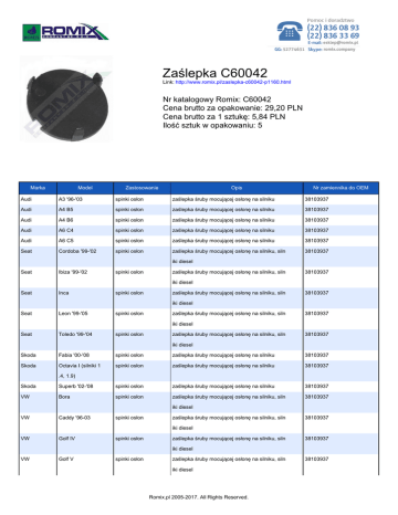 Zaślepka C60042 Link: http://www.romix.pl/zaslepka-c60042-p1160.html Nr katalogowy Romix: C60042 Cena brutto za opakowanie: 29,20 PLN Cena brutto za 1 sztukę: 5,84 PLN Ilość sztuk w opakowaniu: 5 Marka Model Zastosowanie Opis Nr zamiennika do OEM Audi A3 '96-'03 spinki osłon zaślepka śruby mocującej osłonę na silniku 38103937 Audi A4 B5 spinki osłon zaślepka śruby mocującej osłonę na silniku 38103937 Audi A4 B6 spinki osłon zaślepka śruby mocującej osłonę na silniku 38103937 Audi A6 C4 spinki osłon zaślepka śruby mocującej osłonę na silniku 38103937 Audi A6 C5 spinki osłon zaślepka śruby mocującej osłonę na silniku 38103937 Seat Cordoba '99-'02 spinki osłon zaślepka śruby mocującej osłonę na silniku, siln 38103937 iki diesel Seat Ibiza '99-'02 spinki osłon zaślepka śruby mocującej osłonę na silniku, siln 38103937 iki diesel Seat Inca spinki osłon zaślepka śruby mocującej osłonę na silniku, siln 38103937 iki diesel Seat Leon '99-'05 spinki osłon zaślepka śruby mocującej osłonę na silniku, siln 38103937 iki diesel Seat Toledo '99-'04 spinki osłon zaślepka śruby mocującej osłonę na silniku, siln 38103937 iki diesel Skoda Fabia '00-'08 spinki osłon zaślepka śruby mocującej osłonę na silniku 38103937 Skoda Octavia I (silniki 1 spinki osłon zaślepka śruby mocującej osłonę na silniku 38103937 .4, 1.9) Skoda Superb '02-'08 spinki osłon zaślepka śruby mocującej osłonę na silniku 38103937 VW Bora spinki osłon zaślepka śruby mocującej osłonę na silniku, siln 38103937 iki diesel VW Caddy '96-03 spinki osłon zaślepka śruby mocującej osłonę na silniku, siln 38103937 iki diesel VW Golf IV spinki osłon zaślepka śruby mocującej osłonę na silniku, siln 38103937 iki diesel VW Golf V spinki osłon zaślepka śruby mocującej osłonę na silniku, siln iki diesel Romix.pl 2005-2017. All Rights Reserved. 38103937 VW New Beetle spinki osłon zaślepka śruby mocującej osłonę na silniku, siln 38103937 iki diesel VW Passat B5 spinki osłon zaślepka śruby mocującej osłonę na silniku, siln 38103937 iki diesel VW Passat B6 spinki osłon zaślepka śruby mocującej osłonę na silniku, siln iki diesel Romix.pl 2005-2017. All Rights Reserved. 38103937