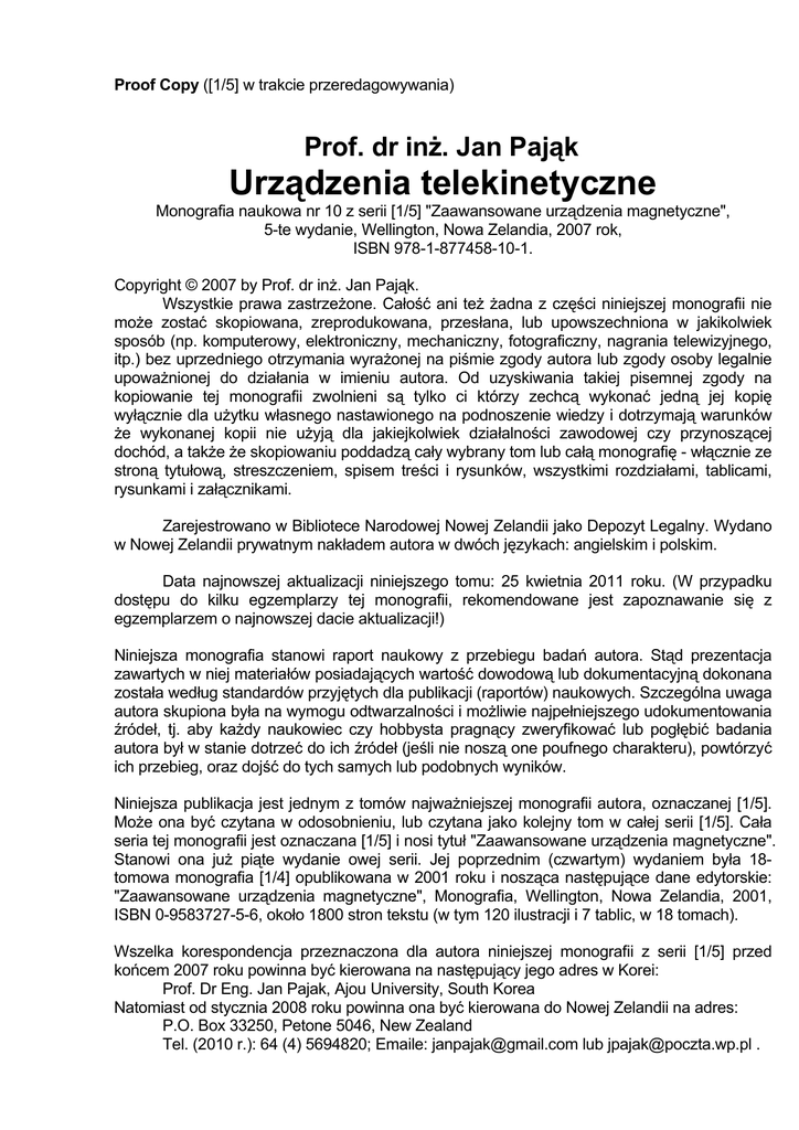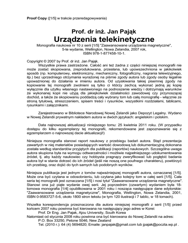 Proof Copy ([1/5] w trakcie przeredagowywania) Prof. dr inż. Jan Pająk Urządzenia telekinetyczne Monografia naukowa nr 10 z serii [1/5] "Zaawansowane urządzenia magnetyczne", 5-te wydanie, Wellington, Nowa Zelandia, 2007 rok, ISBN 978-1-877458-10-1. Copyright © 2007 by Prof. dr inż. Jan Pająk. Wszystkie prawa zastrzeżone. Całość ani też żadna z części niniejszej monografii nie może zostać skopiowana, zreprodukowana, przesłana, lub upowszechniona w jakikolwiek sposób (np. komputerowy, elektroniczny, mechaniczny, fotograficzny, nagrania telewizyjnego, itp.) bez uprzedniego otrzymania wyrażonej na piśmie zgody autora lub zgody osoby legalnie upoważnionej do działania w imieniu autora. Od uzyskiwania takiej pisemnej zgody na kopiowanie tej monografii zwolnieni są tylko ci którzy zechcą wykonać jedną jej kopię wyłącznie dla użytku własnego nastawionego na podnoszenie wiedzy i dotrzymają warunków że wykonanej kopii nie użyją dla jakiejkolwiek działalności zawodowej czy przynoszącej dochód, a także że skopiowaniu poddadzą cały wybrany tom lub całą monografię - włącznie ze stroną tytułową, streszczeniem, spisem treści i rysunków, wszystkimi rozdziałami, tablicami, rysunkami i załącznikami. Zarejestrowano w Bibliotece Narodowej Nowej Zelandii jako Depozyt Legalny. Wydano w Nowej Zelandii prywatnym nakładem autora w dwóch językach: angielskim i polskim. Data najnowszej aktualizacji niniejszego tomu: 25 kwietnia 2011 roku. (W przypadku dostępu do kilku egzemplarzy tej monografii, rekomendowane jest zapoznawanie się z egzemplarzem o najnowszej dacie aktualizacji!) Niniejsza monografia stanowi raport naukowy z przebiegu badań autora. Stąd prezentacja zawartych w niej materiałów posiadających wartość dowodową lub dokumentacyjną dokonana została według standardów przyjętych dla publikacji (raportów) naukowych. Szczególna uwaga autora skupiona była na wymogu odtwarzalności i możliwie najpełniejszego udokumentowania źródeł, tj. aby każdy naukowiec czy hobbysta pragnący zweryfikować lub pogłębić badania autora był w stanie dotrzeć do ich źródeł (jeśli nie noszą one poufnego charakteru), powtórzyć ich przebieg, oraz dojść do tych samych lub podobnych wyników. Niniejsza publikacja jest jednym z tomów najważniejszej monografii autora, oznaczanej [1/5]. Może ona być czytana w odosobnieniu, lub czytana jako kolejny tom w całej serii [1/5]. Cała seria tej monografii jest oznaczana [1/5] i nosi tytuł "Zaawansowane urządzenia magnetyczne". Stanowi ona już piąte wydanie owej serii. Jej poprzednim (czwartym) wydaniem była 18tomowa monografia [1/4] opublikowana w 2001 roku i nosząca następujące dane edytorskie: "Zaawansowane urządzenia magnetyczne", Monografia, Wellington, Nowa Zelandia, 2001, ISBN 0-9583727-5-6, około 1800 stron tekstu (w tym 120 ilustracji i 7 tablic, w 18 tomach). Wszelka korespondencja przeznaczona dla autora niniejszej monografii z serii [1/5] przed końcem 2007 roku powinna być kierowana na następujący jego adres w Korei: Prof. Dr Eng. Jan Pajak, Ajou University, South Korea Natomiast od stycznia 2008 roku powinna ona być kierowana do Nowej Zelandii na adres: P.O. Box 33250, Petone 5046, New Zealand Tel. (2010 r.): 64 (4) 5694820; Emaile: [email protected] lub [email protected] . 2 STRESZCZENIE tej monografii nr 10 z serii [1/5] "Zaawansowane urządzenia magnetyczne", ISBN 978-1-877458-10-1 Na wysoko zaawansowanych zjawiskach magnetycznych, takich jak telekineza i Efekt Telekinetyczny, oparte będzie działanie różnorodnych urządzeń technicznych i statków międzygwiezdnych budowanych w przyszłości na Ziemi. Urządzenia te i statki czyniły będą praktyczny użytek z takich nieznanych dotychczas naszej nauce zjawisk jak techniczna telekineza, a także fale telepatyczne, czy zmiany w szybkości i kierunku upływu czasu. Niniejszy tom prezentuje także kilka najważniejszych z owych wysoko zaawansowanych urządzeń, włączając w to siłownie telekinetyczne, ogniwa telekinetyczne, oraz magnokrafty telekinetyczne. Czym są magnokrafty telekinetyczne (tj. magnokrafty drugiej generacji)? Wyobraźmy sobie wehikuły które na życzenie załogi są w stanie przelatywać przez mury budynków i przez szyby okienne, nie czyniąc u nich ani u siebie żadnego uszkodzenia, a nawet nie będąc przy tym odnotowywane. Wehikuły do których można strzelać lub które można próbować dotknąć, zaś pociski i nasza ręka przenikną przez nie i przez ich załogę jakby byli powietrzem lub mgłą. Wehikuły, które - jeśli ich piloci sobie tego zażyczą, mogą stać się całkowicie niewidzialne dla ludzkich oczu i kamer. Wehikuły które są w stanie podróżować z nieskończenie dużą szybkością, tak że u celu pojawiają się niemal natychmiast po tym jak zniknęły z punktu startowego. To są właśnie magnokrafty drugiej generacji. Magnokrafty trzeciej generacji na dodatek do wszystkiego powyższego są jeszcze w stanie cofać czas do tyłu, przestawiać go do przodu, lub zwalniać albo niemal całkowicie zatrzymywać w miejscu jego upływ. Magnokrafty drugiej i trzeciej generacji w sensie wyglądu i zagospodarowania swego wnętrza będą niemal identyczne do magnokraftów pierwszej generacji opisanych w rozdziale F tej monografii. Różnice pomiędzy nimi sprowadzać się będą jedynie do kilku drobnych szczegółów, takich jak kształt wylotu z pędników czy istnienie lub brak drzwi w powłoce. Stąd obserwator nieobznajomiony z teoriami zaprezentowanymi w niniejszej monografii, po wyglądzie nie będzie potrafił ich odróżnić wzajemnie od siebie ani też od magnokraftów pierwszej generacji. Magnokrafty drugiej generacji mogą pracować aż w dwóch różnych konwencjach lotu, tj. magnetycznej i telekinetycznej, zaś magnokrafty trzeciej generacji dodatkowo jeszcze w trzeciej konwencji wehikułów czasu. W konwencji magnetycznej ich pędniki wytwarzają jedynie 