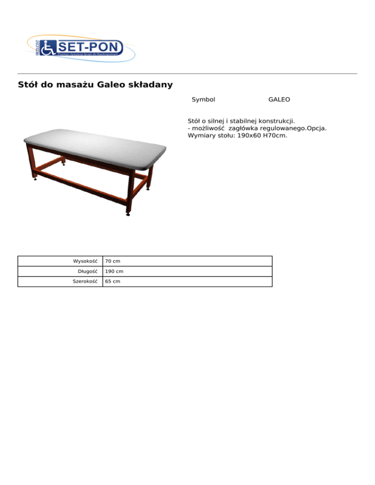 Stół do masażu Galeo składany Symbol GALEO Stół o silnej i stabilnej konstrukcji. - możliwość zagłówka regulowanego.Opcja. Wymiary stołu: 190x60 H70cm. Wysokość Długość Szerokość Powered by TCPDF (www.tcpdf.org) 70 cm 190 cm 65 cm
