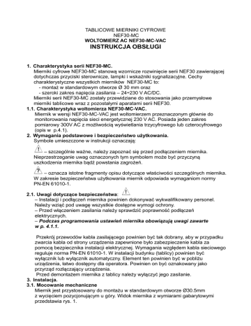 TABLICOWE MIERNIKI CYFROWE NEF30-MC WOLTOMIERZ AC NEF30-MC-VAC INSTRUKCJA OBSŁUGI 1. Charakterystyka serii NEF30-MC. Mierniki cyfrowe NEF30-MC stanową wzornicze rozwinięcie serii NEF30 zawierającej dotychczas przyciski sterownicze, lampki i wskaźniki sygnalizacyjne. Cechy charakterystyczne wszystkich mierników NEF30-MC to: - montaż w standardowym otworze Ø 30 mm oraz - szeroki zakres napięcia zasilania – 24÷230 V AC/DC. Mierniki serii NEF30-MC zostały przewidziane do stosowania jako przemysłowe mierniki tablicowe wraz z pozostałymi aparatami serii NEF30. 1.1. Charakterystyka woltomierza NEF30-MC-VAC. Miernik w wersji NEF30-MC-VAC jest woltomierzem przeznaczonym głównie do monitorowania napięcia sieci energetycznej 230 V AC. Posiada jeden zakres pomiarowy 300V AC z możliwością wyświetlania trzycyfrowego lub czterocyfrowego (opis w p.4.1). 2. Wymagania podstawowe i bezpieczeństwo użytkowania. Symbole umieszczone w instrukcji oznaczają: ! – szczególnie ważne, należy zapoznać się przed podłączeniem miernika. Nieprzestrzeganie uwag oznaczonych tym symbolem może być przyczyną uszkodzenia miernika bądź powstania zagrożeń. ? – oznacza istotne fragmenty opisu dotyczące właściwości szczególnych miernika. W zakresie bezpieczeństwa użytkowania miernik odpowiada wymaganiom normy PN-EN 61010-1. 2.1. Uwagi dotyczące bezpieczeństwa: ! – Instalacji i podłączeń miernika powinien dokonywać wykwalifikowany personel. Należy wziąć pod uwagę wszystkie dostępne wymogi ochrony. – Przed włączeniem zasilania należy sprawdzić poprawność podłączeń elektrycznych. – Podczas programowania ustawień miernika obowiązują uwagi zawarte w p. 4.1.1. Przekrój przewodów kabla zasilającego powinien być tak dobrany, aby w przypadku zwarcia kabla od strony urządzenia zapewnione było zabezpieczenie kabla za pomocą bezpiecznika instalacji elektrycznej. Wymagania względem kabla sieciowego reguluje norma PN-EN 61010-1. W instalacji budynku (tablicy) powinien być wyłącznik lub wyłącznik automatyczny. Element ten powinien być w pobliżu urządzenia, łatwo dostępny dla operatora. Powinien on być oznakowany jako przyrząd rozłączający urządzenia. Przed demontażem miernika z tablicy należy wyłączyć jego zasilanie. 3. Instalacja. 3.1. Mocowanie mechaniczne Miernik jest przystosowany do montażu w standardowym otworze Ø30.5mm z wycięciem pozycjonującym u góry. Widok miernika z wymiarami gabarytowymi przedstawia rys. 1. Zamocowanie miernika do tablicy sprowadza się do wsunięcia korpusu w przygotowany otwór i przykręcenia od tyłu nakrętką mocującą. Rys.1 ! 3.2. Podłączenia elektryczne 3.3. Miernik jest wyposażony w cztery zaciski przyłączowe śrubowe. Maksymalny przekrój przewodu – 1.5mm2. Końcówki przewodów linkowych zaleca się oblutować lub zastosować końcówki tulejkowe. Zasilanie należy podłączyć przewodem dwużyłowym, o średnicy przewodów zapewniającej jego zabezpieczenie za pomocą bezpiecznika instalacyjnego. Oznaczenia zacisków i połączenia elektryczne przedstawiono na rys.2. Rys.2 Biegunowość zasilania DC – dowolna. 4. Obsługa ? Po podłączeniu i podaniu zasilania miernik rozpoczyna normalną pracę. Możliwe jest wyświetlanie czterocyfrowe z jedną cyfrą po kropce dziesiętnej lub trzycyfrowe. Sposób przeprogramowania opisano w p. 4.1. Maksymalne wskazanie to 301V (301.0V). Dla wartości wyższych wyświetla się symbol przeciążenia OL--. Wartości wskazań poniżej 2V (2.0V) są zerowane. 4.1. Zmiana trybu wyświetlania. ? Ze względu na 10-bitową rozdzielczość przetwarzania A/C (ok. 1000 aktywnych punktów) dla wyświetlania czterocyfrowego wartość czwartej cyfry (po kropce dziesiętnej) pochodzi z interpolacji – obliczana jest średnia z 64-ech pomiarów z dokładnością większą, niż dokładność pojedynczego pomiaru. Istnieje możliwość rezygnacji z wyświetlania cyfry po kropce dziesiętnej przez przełączenie miernika na tryb trzycyfrowy. Przeprogramowania trybu wyświetlania dokonuje się po zdjęciu maskownicy przedniej przez podważenie jej za pomocą specjalnego narzędzia wchodzącego w komplet miernika. Narzędzie pasuje do wgłębień na bokach maskownicy. Widok miernika od strony czołowej po zdjęciu maskownicy pokazano na rys. 3. Rys. 3 Uzyskujemy dostęp do dwóch przycisków typu TACT, znajdujących się pod wyświetlaczem. Przyciski nie są oznakowane symbolami (w różnych odmianach miernika mają różne funkcje). Miernik należy zasilić z uwzględnieniem uwag dotyczących bezpieczeństwa p. 4.1.1. Tryb wyświetlania zmieniamy wciśnięciem przycisku lewego (ustawienie zachowuje się w pamięci nieulotnej po wyłączeniu zasilania). Przycisk prawy jest w tej wersji miernika niewykorzystany – nie działa. 4.1.1. Bezpieczeństwo podczas zmiany ustawień ! Dane dotyczące bezpieczeństwa podane w p. 7 dotyczą miernika kompletnego i zamontowanego w tablicy jak do normalnej pracy. Uzyskanie dostępu do przycisków programujących wymaga zdjęcia maskownicy przedniej. Zasilanie z sieci 230V AC jest dopuszczalne z zachowaniem wszelkich niezbędnych środków ostrożności. Przeprogramowania powinien dokonywać wyłącznie wykwalifikowany personel. 5. Konserwacja Miernik nie wymaga czynności konserwacyjnych. 6. Utylizacja mierników po zużyciu Zużyte mierniki, jako urządzenia elektroniczne, powinny zostać zutylizowane zgodnie z obowiązującymi na danym obszarze przepisami o zużytym sprzęcie elektrycznym i elektronicznym. Nie należy ich spalać ani wyrzucać do pojemników wraz z innymi odpadkami. 7. Dane techniczne. Użyteczny zakres pomiarowy Wyświetlanie Błąd podstawowy Rezystancja wejściowa Przeciążalność długotrwała Przeciążalność krótkotrwała Podstawowe zastosowanie Napięcie zasilające Pobór mocy Stopień ochrony Typ obudowy Pole odczytowe Temperatura pracy Wilgotność względna Wysokość Max. przekrój przewodów p