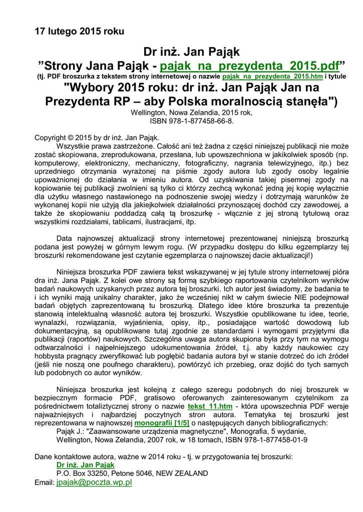 17 lutego 2015 roku Dr inż. Jan Pająk ”Strony Jana Pająk - pajak_na_prezydenta_2015.pdf” (tj. PDF broszurka z tekstem strony internetowej o nazwie pajak_na_prezydenta_2015.htm i tytule "Wybory 2015 roku: dr inż. Jan Pająk Jan na Prezydenta RP – aby Polska moralnoscią stanęła") Wellington, Nowa Zelandia, 2015 rok, ISBN 978-1-877458-66-8. Copyright © 2015 by dr inż. Jan Pająk. Wszystkie prawa zastrzeżone. Całość ani też żadna z części niniejszej publikacji nie może zostać skopiowana, zreprodukowana, przesłana, lub upowszechniona w jakikolwiek sposób (np. komputerowy, elektroniczny, mechaniczny, fotograficzny, nagrania telewizyjnego, itp.) bez uprzedniego otrzymania wyrażonej na piśmie zgody autora lub zgody osoby legalnie upoważnionej do działania w imieniu autora. Od uzyskiwania takiej pisemnej zgody na kopiowanie tej publikacji zwolnieni są tylko ci którzy zechcą wykonać jedną jej kopię wyłącznie dla użytku własnego nastawionego na podnoszenie swojej wiedzy i dotrzymają warunków że wykonanej kopii nie użyją dla jakiejkolwiek działalności przynoszącej dochód czy zawodowej, a także że skopiowaniu poddadzą całą tą broszurkę - włącznie z jej stroną tytułową oraz wszystkimi rozdziałami, tablicami, ilustracjami, itp. Data najnowszej aktualizacji strony internetowej prezentowanej niniejszą broszurką podana jest powyżej w górnym lewym rogu. (W przypadku dostępu do kilku egzemplarzy tej broszurki rekomendowane jest czytanie egzemplarza o najnowszej dacie aktualizacji!) Niniejsza broszurka PDF zawiera tekst wskazywanej w jej tytule strony internetowej pióra dra inż. Jana Pająk. Z kolei owe strony są formą szybkiego raportowania czytelnikom wyników badań naukowych uzyskanych przez autora tej broszurki. Ich autor jest świadomy, że badania te i ich wyniki mają unikalny charakter, jako że wcześniej nikt w całym świecie NIE podejmował badań objętych zaprezentowaną tu broszurką. Dlatego idee które broszurka ta prezentuje stanowią intelektualną własność autora tej broszurki. Wszystkie opublikowane tu idee, teorie, wynalazki, rozwiązania, wyjaśnienia, opisy, itp., posiadające wartość dowodową lub dokumentacyjną, są opublikowane tutaj zgodnie ze standardami i wymogami przyjętymi dla publikacji (raportów) naukowych. Szczególna uwaga autora skupiona była przy tym na wymogu odtwarzalności i najpełniejszego udokumentowania źródeł, t.j. aby każdy naukowiec czy hobbysta pragnący zweryfikować lub pogłębić badania autora był w stanie dotrzeć do ich źródeł (jeśli nie noszą one poufnego charakteru), powtórzyć ich przebieg, oraz dojść do tych samych lub podobnych co autor wyników. Niniejsza broszurka jest kolejną z całego szeregu podobnych do niej broszurek w bezpiecznym formacie PDF, gratisowo oferowanych zainteresowanym czytelnikom za pośrednictwem totaliztycznej strony o nazwie tekst_11.htm - która upowszechnia PDF wersje najważniejsych i najbardziej poczytnych stron autora. Tematyka tej broszurki jest reprezentowana w najnowszej monografii [1/5] o następujących danych bibliograficznych: Pająk J.: "Zaawansowane urządzenia magnetyczne", Monografia, 5 wydanie, Wellington, Nowa Zelandia, 2007 rok, w 18 tomach, ISBN 978-1-877458-01-9 Dane kontaktowe autora, ważne w 2014 roku - tj. w przygotowania tej broszurki: Dr inż. Jan Pająk P.O. Box 33250, Petone 5046, NEW ZEALAND Email: [email protected] Niniejszą stronę przygotowywałem w okresie od 1 stycznia do 7 lutego 2015 roku. Służyła mi ona do informacyjnego wspierania swych sprawdzeń, czy jest realistyczne abym w 2015 roku wystawił swoją kandydaturę w polskich wyborach prezydenckich. Cele tego wystawienia mojej kandydatury m.in. obejmowały uświadomienie Polakom, że wszystko co czynią może być dokonywane albo na moralny, albo też na niemoralny sposób, naoczne zilustrowanie, że nawet w dzisiejszych czasach istnieje sposób przeprowadzenia kampanii wyborczej, która bazowałaby niemal wyłącznie na wkładzie pracy ochotników, a NIE na dotacjach finasowych jakie później zobowiązują wybranego polityka do oddawania najróżniejszych przysług (zwykle łamiących kryteria moralne), oraz potwierdzenie działania w rzeczywistym życiu ostrzeżenia z Biblii stwierdzającego iż "każde dobre drzewo wydaje dobre owoce, a złe drzewo wydaje złe owoce" a wyjaśnionego dokładniej w punkcie #C4.7 mojej odmiennej strony o nazwie morals_pl.htm. W dniu 7 lutego 2015 roku 2 podjąłem ostateczną decyzję w sprawie swego stanięcia do owych wyborów. Decyzję tę podaję i wyjaśniam w punkcie #N4 niniejszej strony. Jednocześnie zaprzestałem dalszego rozwijania tej strony. Jednakże dla naukowej ścisłości oraz dla udokumentowania wysiłków swoich i ochotników którzy zgłosili się do pomocy, począwszy od poniższych trzech gwiazdek stronę tę nadal udostępniam do wglądu zainteresowanych czytelników w niezmienionym stanie do jakiego została wtedy doprowadzona. *** Jak wykazały badania filozofii totalizmu oraz nowej nauki zwanej "totaliztyczna nauka", Bóg z iście "żelazną ręką" jeszcze w tym naszym życiu fizycznym wymierza sprawiedliwość wszystkim ludziom którzy uczynili cokolwiek w sposób zgodny w boskimi wymaganiami moralnymi, czyli w sposób "moralny", lub też w sposób łamiący boskie wymogi moralności, czyli w sposób "niemoralny". W przypadku ludzi, instytucji i państw postępujących niemoralnie, sprowadza się to do wymierzenia kary jaka jest proporcjonalna 3 do popełnionej niemoralności i jaka przychodzi po upływie czasu przez totalizm nazywanego "czasem zwrotu" (przybliżone wartości owych "czasów zwrotu" podane są w punktach #A4 i #C4.2 z mojej strony o nazwie morals_pl.htm). Pierwszorzędną zaś częścią każdej kary za niemoralność jest unieważnienie wszelkich korzyści które określona osoba, społeczność, instytucja, państwo, itp., uzyskały poprzez owo karane niemo
