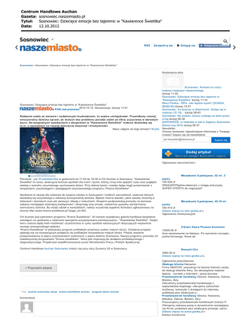 Centrum Handlowe Auchan Gazeta: sosnowiec.naszemiasto.pl Tytu³: Sosnowiec: Dzieciêce emocje bez tajemnic w "Kawiarence wietlika" Data: 12.10.2012 Wydarzenia RSS Rozrywka Katalog firm Zarejestruj się Ogłoszenia Zaloguj się Sport NM+ Zaloguj przez facebook KONKURSY SERWIS DOM Sosnowiec » Sosnowiec: Dziecięce emocje bez tajemnic w "Kawiarence Świetlika" Wydarzenia dnia Sosnowiec: Dziecięce emocje bez tajemnic w "Kawiarence Świetlika" 2012-10-12, Aktualizacja: dzisiaj 11:51 PAS.mat.prasowe Radzenie sobie ze stresem i codziennymi trudnościami, to ważne umiejętności. Prawidłowy rozwój emocjonalny dziecka sprawi, że maluch bez problemu poradzi sobie ze sferą uczuciową w dorosłym życiu. Na bezpłatnych spotkaniach z ekspertami w "Kawiarence Świetlika" rodzice dowiedzą się m.in. o sposobach na rozwój dziecięcej ekspresji i kreatywności. Masz zdjęcie do tego tematu? Wyślij Sosnowiec: Koncert na rzecz budowy hospicjum stacjonarnego dzisiaj 11:50 Sosnowiec: Dziecięce emocje bez tajemnic w "Kawiarence Świetlika" dzisiaj 11:33 Mecz Polska - RPA. Jaki będzie wynik? [SONDA, ZDJĘCIA] dzisiaj 10:37 Sosnowiec: Co piszczy w dzielnicach. Dzieje się w mieście (12.10)... dzisiaj 09:40 Sosnowiec: Na osiedlu Juliusz czekają na dach przed zimą dzisiaj 09:38 ZAPOWIEDŹ: w niedzielę w hali w Zagórzu Sosnowiec Dance Cup 2012 dzisiaj 08:47 Newsletter Chcesz dostawać najważniejsze informacje z Twojego miasta? Zapisz się do newslettera! [email protected] Zapisz się Dodaj artykuł Ogłoszenia nieruchomości Pierwsze - już 20 października w godzinach od 17.00 do 18.30 w CH Auchan w Sosnowcu. "Kawiarenka Świetlika" to nowa, atrakcyjna formuła spotkań dla mam i ojców, którzy chcą mile spędzić czas oraz pogłębić wiedzę z szeroko rozumianego wychowania dzieci. Przy dobrej kawie i ciastku będą mogli porozmawiać z terapeutami, psychologami i pedagogami sosnowieckiego programu "Kraina Świetlików". Spotkania to okazja dla rodziców do wzięcia udziału w dyskusjach i krótkich warsztatach, podczas których dowiedzą się wszystkiego o edukacji emocjonalnej dziecka. Będzie można zbadać, jakie zasoby drzemią w dzieciach i dorosłych oraz jak ulepszyć relację z maluchami. Eksperci podpowiedzą pomysły na domowe zabawy rozwijające dziecięcą kreatywność i ekspresję oraz proste, codzienne sposoby wzmacniania samooceny dziecka. By wziąć udział w warsztatach, należy wcześniej wypełnić formularz zgłoszeniowy na stronie http://www.kraina-swietlikow.pl/?page_id=363. CH Auchan jest partnerem programu "Kraina Świetlików". W ramach współpracy galeria handlowa bezpłatnie udostępni na spotkania z rodzicami specjalnie przystosowane pomieszczenie - "Kawiarenkę Świetlika". Dzięki temu rodzice będą mieli możliwość uczestnictwa w cyklu spotkań edukacyjnych dotyczących wspierania rozwoju emocjonalnego dziecka. "Kraina Świetlików" to pilotażowy program profilaktyki przemocy wobec małych dzieci. Działania projektu opierają się na innowacyjnym podejściu do profilaktyki krzywdzenia małych dzieci. Pilotaż zostanie przeprowadzony w pięciu przedszkolach wybranych z pięciu dzielnic Sosnowca. Nazwa programu pochodzi od metaforycznej przypowieści "Kraina świetlików", która jest inspiracją do działania profilaktycznego i diagnostycznego. Projekt jest współfinansowany przez Ministerstwo Pracy i Polityki Społecznej. Centrum Handlowe Auchan Sosnowiec mieści się przy ulicy Zuzanny 20 w Sosnowcu. Użyteczny | 0 Inspirujący | 0 Pobieżny | 0 Tagi: auchan sosnowiec akcja, kraina świetlików auchan, program dzieci auchan Komentarze Mieszkanie 2-pokojowe, 45,10 m2, parter 184 910 zł Zobacz więcej na dom.gratka.pl » Ogłoszenia motoryzacyjne Citroen Xsara Picasso Exclusive 13000.00 zł Auto serwisowane na bieżąco. Po wymianie rozrządu, paska klinowego. Nowe tar Renault Clio 3900.00 zł Zobacz więcej na moto.gratka.pl » < Poprzedni artykuł Ciekawy | 0 Mieszkanie 2-pokojowe, 52 m2, 3 piętro 155 000 zł OKAZJA!!!!!!!!pełna własność z księgą wieczystą SUPER OFERTA do negocjacji!! Słaby temat | 0 Ogłoszenia pracodawców Obsługa klienta Katowice Firma SEMTOP, poszukuje na terenie Katowic osoby do obsługi klientów firmy. Do obowiązków należeć będzie: - kontakt z klientami - prace biurowe Przedstawiciel handlowy Gliwice. Katowice, Zabrze, Bielsko, Żory Zatrudnimy przedstawiciela handlowego z województwa śląskiego, oferujemy samochód służbowy, komputer z dostępem do internetu, podstawę plus atrakcyjne p... Przedstawiciel handlowy Gliwice. Katowice, Mikołów, Zabrze, Bielsko, Żory Poszukujemy przedstawicieli handlowych branża IT. Oferujemy ciekawą pracę w dynamicznie rozwijającej się firmie, podstawa plus atrakcyjne prowizje, samo... Zobacz więcej na praca.gratka.pl » Zobacz koniecznie Centrum Handlowe Auchan Gazeta: sosnowiec.naszemiasto.pl Tytu³: Sosnowiec: Dzieciêce emocje bez tajemnic w "Kawiarence wietlika" Data: 12.10.2012 Dodając komentarz akceptujesz regulamin. Dodaj komentarz Brak komentarzy. Możesz być pierwszy! Wybierz swoje mieszkanie... Okiem recenzenta Junior Media... i tworzysz gazetę! Ściągnij aplikację Nowy rok szkolny z natablicy.pl Futbol na wesoło Spokojne mieszkanie w centrum miasta Zobacz, co warto przeczytać! Stwórz z nami gazetkę dla swojej szkoły Rozrywka NaszeMiasto.pl na Zobacz dlaczego bez szkoły jest nudno... Piłkarskie plotki, sportowe plotki, Serwisy branżowe: Ogłoszenia Mieszkania Sosnowiec Domy Sosnowiec Motoryzacja Samochody Sosnowiec Praca Praca Sosnowiec Ogłoszenia drobne Turystyka Serwisy partnerskie: Grupa wydawnicza Wiadomości Najnowsze Informacje Aktualności Samochody Program TV Piłka nożna Dziennik Polski Dzienniki regionalne: Wiadomości Trójmiasto Wiadomości Łódź Wiadomości Śląsk Wiadomości Kraków Wiadomości Wrocław Wiadomości Poznań Wiadomości Lublin Express Ilustrowany Serwisy tematyczne: Gazeta bezpłatna NM Deweloperzy Nekrologi Na