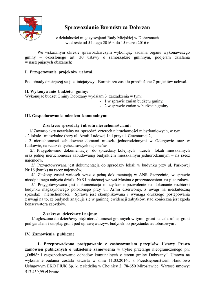 Sprawozdanie Burmistrza Dobrzan z działalności między sesjami Rady Miejskiej w Dobrzanach w okresie od 5 lutego 2016 r. do 15 marca 2016 r. We wskazanym okresie sprawozdawczym wykonując zadania organu wykonawczego gminy – określonego art. 30 ustawy o samorządzie gminnym, podjęłam działania w następujących obszarach: I. Przygotowanie projektów uchwał. Pod obrady dzisiejszej sesji z inicjatywy - Burmistrza zostało przedłożone 7 projektów uchwał. II. Wykonywanie budżetu gminy: Wykonując budżet Gminy Dobrzany wydałam 3 zarządzenia w tym: - 1 w sprawie zmian budżetu gminy, - 2 w sprawie zmian w budżecie gminy. III. Gospodarowanie mieniem komunalnym: Z zakresu sprzedaży i obrotu nieruchomościami: 1/.Zawarto akty notarialny na sprzedaż czterech nieruchomości mieszkaniowych, w tym: - 2 lokale mieszkalne (przy ul. Armii Ludowej 1a i przy ul. Cmentarnej 2, - 2 nieruchomości zabudowane domami mieszk. jednorodzinnymi w Odargowie oraz w Lutkowie, na rzecz dotychczasowych najemców. 2/. Przygotowano dokumentację do sprzedaży kolejnych trzech lokali mieszkalnych oraz jednej nieruchomości zabudowanej budynkiem mieszkalnym jednorodzinnym – na rzecz najemców. 3/. Przygotowywana jest dokumentacja do sprzedaży lokali w budynku przy ul. Parkowej Nr 16 (barak) na rzecz najemców, 4/. Złożony został wniosek wraz z pełną dokumentacją w ANR Szczecinie, w sprawie nieodpłatnego nabycia działki Nr 91 położonej we wsi Mosina z przeznaczeniem na plac zabaw. 5/. Przygotowywana jest dokumentacja o uzyskanie pozwolenie na dokonanie rozbiórki budynku magazynowego położonego przy ul. Armii Czerwonej, z uwagi na nieskuteczną sprzedaż nieruchomości. Sprawa jest skomplikowana i wymaga dłuższego postępowania z uwagi na to, że budynek znajduje się w gminnej ewidencji zabytków, stąd konieczna jest zgoda konserwatora zabytków. Z zakresu dzierżawy i najmu: 1/.ogłoszono do dzierżawy pięć nieruchomości gminnych w tym: grunt na cele rolne, grunt pod garażem i szopką, grunt pod uprawę warzyw, budynek po przystanku autobusowym . IV. Zamówienia publiczne 1. Przeprowadzono postępowanie z zastosowaniem przepisów Ustawy Prawo zamówień publicznych o udzielenie zamówienia w trybie przetargu nieograniczonego pn: „Odbiór i zagospodarowanie odpadów komunalnych z terenu gminy Dobrzany”. Umowa na wykonanie zadania została zawarta w dniu 11.03.2016r. z Przedsiębiorstwem Handlowo Usługowym EKO FIUK Sp. k. z siedzibą w Chojnicy 2, 78-650 Mirosławiec. Wartość umowy: 517.439,99 zł brutto. 2. Przeprowadzono postępowanie bez zastosowania przepisów Ustawy Prawo zamówień publicznych, zgodnie z Zarządzeniem Burmistrza Dobrzan nr 43/2015 z dnia 14 maja 2015 r. o udzielenie zamówienia publicznego na organizację „Dni Dobrzan 2016”. Wybrano ofertę najkorzystniejszą Domu Kultury Słowianin z siedzibą w Szczecinie, z którym zostanie zawarta umowa na kwotę 80.000,00 zł brutto. Ponadto Gmina Dobrzany we wskazanym okresie zawarła następujące umowy: 1) umowa nr 7/2016 z dnia 29.01.2016 r. na wywóz nieczystości płynnych ze Zbigniewem Daniłowicz prowadzącym działalność gospodarczą pod nazwą Zakład Ochrony Środowiska Zbigniew Daniłowicz z siedzibą w Dobrzanach, 2) umowa nr 8/2016 z dnia 1.02.2016r. na służbę BHP i p.poż. w Urzędzie z Piotrem Bylińskim prowadzącym działalność gospodarczą pod nazwą BHP Ekspert z siedzibą w Stargardzie, 3) umowa nr 9/2016 z dnia 2.02.2016 r. na wykonanie usług kominiarskich z Markiem Biniek prowadzącym działalność gospodarczą pod nazwą Marek Biniek Zakład Kominiarski z siedzibą w Stargardzie, 4) umowa nr 10/2016 z dnia 03.02.2016 r. na pełnienie funkcji gospodarza stadionu z Leszkiem Szymańskim zamieszkałym w Dobrzanach, 5) umowa nr 11/2016 z dnia opracowanie planu gospodarki niskoemisyjnej z ATMOTERM S.A. z siedzibą w Opolu, 6) umowa nr 12/2016 z dnia 05.02.2016r. na opracowanie studium wykonalności dla zadania „Budowa kanalizacji w rejonie ul. Mickiewicza w Dobrzanach” z Dariuszem Klityńskim prowadzącym działalność gospodarczą pod nazwą Europejskie Centrum Doradcze z siedzibą w Poznaniu, 7) umowa 13/2016 zawarta w dniu 11.02.2016r. na dostawę tonerów do Urzędu z firmą RODAN Sp. z o.o. z siedzibą w Poznaniu, 8) umowa 14/2016 zawarta w dniu 11.02.2016r. na dostawę artykułów biurowych do Urzędu z firmą RODAN Sp. z o.o. z siedzibą w Poznaniu, 9) umowa nr 15/2016 z dnia 15.022016 r. na dostawę tłucznia z Pawłem Drop prowadzącym działalność gospodarczą pod nazwą P.P.P.H.U. Drop z siedzibą w Kołowie, 10) umowa nr 16/2016 zawarta w dniu 22.02.2016r. na dostawę Internetu w ramach projektów POIG z Tomaszem Borys prowadzącym działalność gospodarczą pod nazwą Raster – ISP z siedzibą w Stargard, 11) umowa nr 17/2016 zawarta w dniu 23.02.2016r. na dostawę mebli do Urzędu ze spółką cywilną BOGMAR MEBLE z siedzibą w Szczecinie, 12) umowa nr 18/2016 z dnia 25.02.2016r. na realizację zadań sportowych z UKS ZNICZ, 13) umowa nr 19/2016 z dnia 29.02.2016r. na serwis i wynajem kabin sanitarnych z TOI TOI z siedzibą w Szczecinie, 14) umowa nr 20/2016 z dnia 01.03.2016r. na obsługę informatyczną Urzędu oraz serwis komputerów w ramach POIG z Tomaszem Bylewskim zamieszkałym w Dobrzanach, 15) umowa nr 21/2016 z dnia 01.03.2016r. na opracowanie dokumentacji budowy ul. Spacerowej z Anetą Bączkowską prowadzącą działalność gospodarczą pod nazwą „Usługi Budowlano – Rachunkowe Aneta Bączkowska” z siedzibą w Stargardzie, 16) umowa nr 22/2016 z dnia 10.03.2016 r. na konserwację boiska Orlik z Kacprem Prościak prowadzącym działalność gospodarczą pod nazwą „KACPEROS Konserwacja Sztucznej Trawy” z siedzibą w Dobrzanach, 17) umowa nr 23/2016 z dnia 11.03.2016 r. na odbiór i zagospodarowanie odpadów komunalnych z terenu Gminy Dobrzany z Przedsiębiorstwem Handlowo Usługowym EKO FIUK Sp.k. z siedzibą w Chojnicy. Sprawozdanie z dzi