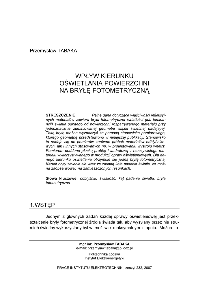Przemysław TABAKA WPŁYW KIERUNKU OŚWIETLANIA POWIERZCHNI NA BRYŁĘ FOTOMETRYCZNĄ STRESZCZENIE Pełne dane dotyczące właściwości refleksyjnych materiałów zawiera bryła fotometryczna światłości (lub luminancji) światła odbitego od powierzchni rozpatrywanego materiału przy jednoznacznie zdefiniowanej geometrii wiązki świetlnej padającej. Taką bryłę można wyznaczyć za pomocą stanowiska pomiarowego, którego geometrię przedstawiono w niniejszej publikacji. Stanowisko to nadaje się do pomiarów zarówno próbek materiałów odbłyśnikowych, jak i innych stosowanych np. w projektowaniu wystroju wnętrz. Pomiarom poddano płaską próbkę kwadratową z rzeczywistego materiału wykorzystywanego w produkcji opraw oświetleniowych. Dla danego kierunku oświetlania otrzymuje się jedną bryłę fotometryczną. Kształt bryły zmienia się wraz ze zmianą kąta padania światła, co można zaobserwować na zamieszczonych rysunkach. Słowa kluczowe: odbłyśnik, światłość, kąt padania światła, bryła fotometryczna 1. WSTĘP Jednym z głównych zadań każdej oprawy oświetleniowej jest przekształcenie bryły fotometrycznej źródła światła tak, aby wysyłany przez nie strumień świetlny wykorzystany był w możliwie maksymalnym stopniu. Można to mgr inż. Przemysław TABAKA e-mail: [email protected] Politechnika Łódzka Instytut Elektroenergetyki PRACE INSTYTUTU ELEKTROTECHNIKI, zeszyt 232, 2007 86 P. Tabaka osiągnąć przez zmianę biegu promieni świetlnych w wyniku interakcji ich z materią. Strumień świetlny padający na dowolny materiał, ogólnie rzecz biorąc może zostać odbity od jego powierzchni, przepuszczony lub pochłonięty przez nią. Na ogół w naturze występują równocześnie co najmniej dwa z wymienionych zjawisk – odbicie i pochłanianie w przypadku ciał nieprzeświecalnych. Nie ma bowiem w przyrodzie ciał doskonale odbijających, czy też ciał doskonale pochłaniających. Natomiast w przypadku materiałów przeświecalnych, czy też przezroczystych wystąpi dodatkowo trzecie zjawisko – przepuszczanie, a z nim związane odchylenie biegu promieni (załamanie). Załamanie światła jest podstawowym zjawiskiem na którym opiera się funkcjonowanie soczewek i pryzmatów. Dzięki odpowiednio zaprojektowanym kloszom pryzmatycznym można np. zmienić rozkład kątowy światłości źródła światła w wybranych strefach przestrzeni. Takie klosze można spotkać np. w oprawach oświetlenia zewnętrznego (starszej generacji), czy w reflektorach samochodowych. W obu tych przypadkach elementami wpływającymi na kształt bryły fotometrycznej jest odbłyśnik wraz z kloszem. Z uwagi jednak na to, że obecnie w procesie projektowania większości opraw oświetleniowych, głównym czynnikiem wpływającym na zmianę kierunku biegu promieni świetlnych (a co za tym idzie, formułowanie rozkładu przestrzennego światła) jest odbicie światła od odbłyśnika, główna uwaga zatem zostanie skupiona na tym zjawisku kontaktu światła z powierzchnią. 2. KLASYFIKACJA ODBICIA ŚWIATŁA OD POWIERZCHNI W technice świetlnej, wg przyjętego nazewnictwa wyróżnia się trzy podstawowe rodzaje odbić światła: kierunkowe, rozproszone i kierunkowo-rozproszone czyli mieszane. Kierunkowe tzn. teoretycznie – idealne. Każde inne to już będzie kierunkowo-rozproszone. Rozproszone natomiast tzn. równomiernie rozproszone. Występuje jeszcze czwarty rodzaj specyficznego odbicia, a mianowicie odbicie współdrożne. Teoretycznie rzecz biorąc podział odbicia światła na kierunkowe (idealne), rozproszone (idealne) i każde pośrednie – czyli kierunkowo-rozproszone jest najprostszym skutecznym rozwiązaniem. Rzeczywistość jednak nie jest idealna, bo ani kierunkowe (idealne), ani rozproszone (idealne) nie występuje. W praktyce (stosując się do przedstawionego podziału) oznaczałoby to, że mamy do czynienia wyłącznie z jednym rodzajem odbiciem – mieszanym, a więc takim jakie wykazują wszystkie rzeczywiste materiały, bo przecież nawet najle- Wpływ kierunku oświetlania powierzchni na bryłę fotometryczną 87 piej wypolerowane lustro rozprasza jednak pewną część strumienia świetlnego, natomiast powierzchnie matowe – odbijające w sposób dyfuzyjny, wykazują pewną kierunkowość. A zatem taki podział wydaje się być troszkę niepraktyczny. Można by zatem zrobić subpodział odbicia kierunkowo-rozproszonego na – z przewagą kierunkowego i na – z przewagą rozproszonego. Ale to z kolei wymagałoby ustalenia pewnej granicy podziału. Z uwagi jednak na brak jakichkolwiek przesłanek gdzie taką granicę postawić, taki podział wydaje się bezzasadny. W literaturze angielskojęzycznej można zaobserwować wyraźne rozróżnienie odbicia idealnego od rzeczywistego i tak np. w przypadku odbicia kierunkowego bez rozproszenia, odpowiadające prawom optyki geometrycznej, nazwano je „specular mirror” (z ang. odbicie lustrzane) – jako typ odbicia idealnego, natomiast w przypadku odbicia kierunkowego z pewnym rozproszeniem – – „specular glossy” co należy rozumieć jako odbicie z połyskiem (czyli przypadek odbicia kierunkowego rzeczywistego). Jeśli chodzi o odbicie rozproszone, to i w tym przypadku można by dokonać podziału na idealne i rzeczywiste, z uwagi na to, że odbicie rozproszone w polskiej normie wymienione jest dwa razy (raz jako rozproszone i drugi jako równomiernie rozproszone). 3. SPOSOBY OKREŚLANIA WŁAŚCIWOŚCI ŚWIATŁOTECHNICZNYCH MATERIAŁÓW Projektując układ optyczny oprawy oświetleniowej kluczowe znaczenie mają właściwości światłotechniczne danego materiału. W zależności od celu jaki się chce osiągnąć należy zastosować odpowiedni materiał. O właściwościach odbłyśnika decyduje nie tylko kształt ale właściwości materiału z jakiego został wykonany. Elementy optyczne w oprawach oświetleniowych wykonywane są z różnego rodzaju materiałów: z metali, szkła, twor