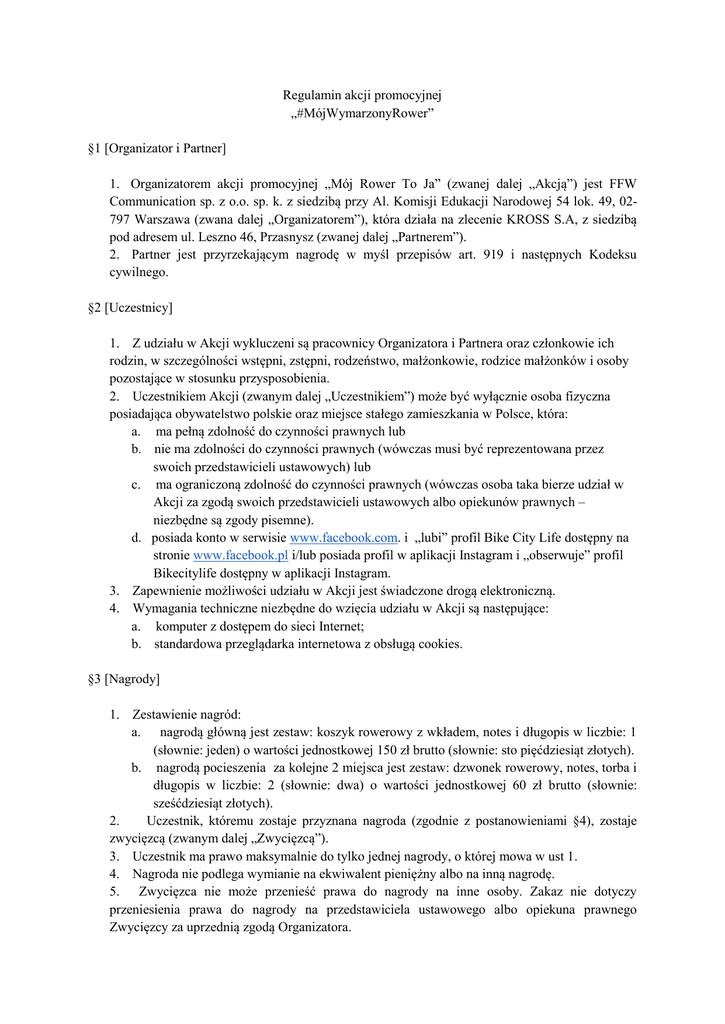 Regulamin akcji promocyjnej „#MójWymarzonyRower” §1 [Organizator i Partner] 1. Organizatorem akcji promocyjnej „Mój Rower To Ja” (zwanej dalej „Akcją”) jest FFW Communication sp. z o.o. sp. k. z siedzibą przy Al. Komisji Edukacji Narodowej 54 lok. 49, 02797 Warszawa (zwana dalej „Organizatorem”), która działa na zlecenie KROSS S.A, z siedzibą pod adresem ul. Leszno 46, Przasnysz (zwanej dalej „Partnerem”). 2. Partner jest przyrzekającym nagrodę w myśl przepisów art. 919 i następnych Kodeksu cywilnego. §2 [Uczestnicy] 1. Z udziału w Akcji wykluczeni są pracownicy Organizatora i Partnera oraz członkowie ich rodzin, w szczególności wstępni, zstępni, rodzeństwo, małżonkowie, rodzice małżonków i osoby pozostające w stosunku przysposobienia. 2. Uczestnikiem Akcji (zwanym dalej „Uczestnikiem”) może być wyłącznie osoba fizyczna posiadająca obywatelstwo polskie oraz miejsce stałego zamieszkania w Polsce, która: a. ma pełną zdolność do czynności prawnych lub b. nie ma zdolności do czynności prawnych (wówczas musi być reprezentowana przez swoich przedstawicieli ustawowych) lub c. ma ograniczoną zdolność do czynności prawnych (wówczas osoba taka bierze udział w Akcji za zgodą swoich przedstawicieli ustawowych albo opiekunów prawnych – niezbędne są zgody pisemne). d. posiada konto w serwisie www.facebook.com. i „lubi” profil Bike City Life dostępny na stronie www.facebook.pl i/lub posiada profil w aplikacji Instagram i „obserwuje” profil Bikecitylife dostępny w aplikacji Instagram. 3. Zapewnienie możliwości udziału w Akcji jest świadczone drogą elektroniczną. 4. Wymagania techniczne niezbędne do wzięcia udziału w Akcji są następujące: a. komputer z dostępem do sieci Internet; b. standardowa przeglądarka internetowa z obsługą cookies. §3 [Nagrody] 1. Zestawienie nagród: a. nagrodą główną jest zestaw: koszyk rowerowy z wkładem, notes i długopis w liczbie: 1 (słownie: jeden) o wartości jednostkowej 150 zł brutto (słownie: sto pięćdziesiąt złotych). b. nagrodą pocieszenia za kolejne 2 miejsca jest zestaw: dzwonek rowerowy, notes, torba i długopis w liczbie: 2 (słownie: dwa) o wartości jednostkowej 60 zł brutto (słownie: sześćdziesiąt złotych). 2. Uczestnik, któremu zostaje przyznana nagroda (zgodnie z postanowieniami §4), zostaje zwycięzcą (zwanym dalej „Zwycięzcą”). 3. Uczestnik ma prawo maksymalnie do tylko jednej nagrody, o której mowa w ust 1. 4. Nagroda nie podlega wymianie na ekwiwalent pieniężny albo na inną nagrodę. 5. Zwycięzca nie może przenieść prawa do nagrody na inne osoby. Zakaz nie dotyczy przeniesienia prawa do nagrody na przedstawiciela ustawowego albo opiekuna prawnego Zwycięzcy za uprzednią zgodą Organizatora. 6. Zwycięzca otrzymuje nagrodę z wszystkimi przynależnościami i dokumentami, jakie otrzymał Organizator od Partnera. Faktura i karta gwarancyjna lub serwisowa zostanie dołączona tylko i wyłącznie wtedy, gdy Organizator otrzymał je od Partnera. 7. Akcja nie stanowi konkursu w rozumieniu ustawy o podatku dochodowym od osób fizycznych. Przychód z nagrody (głównej i pocieszenia) jest opodatkowany na zasadach ogólnych. Organizator może uzależnić wydanie nagrody od uprzedniego podania przez Zwycięzcę danych niezbędnych do sporządzenia rocznej informacji o przychodach z innych źródeł, która zostanie przekazana Zwycięzcy oraz właściwemu dla Uczestnika urzędowi skarbowemu. Zgodnie z przepisami, Zwycięzca powinien wykazać przychód z tytułu nagród (nagrody głównej lub pocieszenia) w swoim rocznym zeznaniu podatkowym i odprowadzić stosowny podatek dochodowy z tego tytułu w przewidzianym w prawie podatkowym terminie. §4 [Mechanika Akcji] 1. Akcja prowadzona jest od 14.03 do 28.03 2016 roku lub do jednostronnego jej odwołania przez Organizatora lub Partnera i jest prowadzona za pośrednictwem strony internetowej www.facebook.pl oraz za pośrednictwem aplikacji mobilnej Instagram, na których może zostać zamieszczona informacja o odwołaniu Akcji. 2. Akcja polega wykonaniu przez Uczestnika następujących działań: a. dodaniu komentarza pod postem konkursowym na stronie www.facebook.pl oznaczonego hashtagiem (znacznikiem #) „#MójWymarzonyRower” oraz „#bikecitylife” lub dodaniu komentarza pod zdjęciem konkursowym w aplikacji Instagram oznaczonego hashtagiem (znacznikiem #) „#MójWymarzonyRower” oraz „#bikecitylife”. 3. Komisja powołana przez Organizatora (zwana dalej „Komisją”) wyłania Zwycięzców w terminie do 7 dni kalendarzowych od daty zakończenia Akcji kierując się subiektywną oceną zgłoszonej pracy. Zwycięzca jest zawiadamiany o wygraniu nagrody za pośrednictwem poczty elektronicznej (na podany w trakcie Akcji adres e-mail). 4. W skład Komisji wchodzą a. Katarzyna Wyroba – przedstawiciel Partnera; b. Ewa Latek – przedstawiciel Organizatora. 5. Zwycięzca traci prawo do nagrody, a Organizator jest zobowiązany do przyznania nagrody Uczestnikowi, którego odpowiedź jest kolejną najlepszą według Komisji, w przypadku: a. niepodania przez Zwycięzcę pełnych danych (o których mowa w §6) w terminie 3 dni kalendarzowych od dnia wysłania wiadomości, o której mowa w ust. 3; b. podania fałszywych danych; c. podania nieprawidłowego adresu e-mail. 6. Organizator wyśle nagrody w terminie 14 dni kalendarzowych od dnia wysłania wiadomości, o której mowa w ust. 3 z tym zastrzeżeniem, że Organizator nie ponosi odpowiedzialności za podanie przez Uczestnika niewłaściwych lub nieprawdziwych danych uniemożliwiających lub opóźniających doręczenie Nagrody. §5 [Reklamacje i wykluczenia] 1. Wszelkie reklamacje w związku z przeprowadzeniem Akcji powinny być: a. pisemne i zawierać: imię, nazwisko, adres e-mail, adres do korespondencji Uczestnika oraz uzasadnienie reklamacji; b. przesłane listem poleconym na adres Organizatora (ul. Podchorążych 71, 