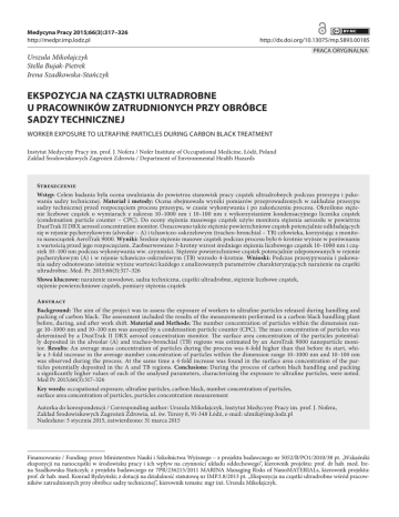 Medycyna Pracy 2015;66(3):317–326 http://medpr.imp.lodz.pl http://dx.doi.org/10.13075/mp.5893.00185 Urszula Mikołajczyk Stella Bujak-Pietrek Irena Szadkowska-Stańczyk PRACA ORYGINALNA EKSPOZYCJA NA CZĄSTKI ULTRADROBNE U PRACOWNIKÓW ZATRUDNIONYCH PRZY OBRÓBCE SADZY TECHNICZNEJ WORKER EXPOSURE TO ULTRAFINE PARTICLES DURING CARBON BLACK TREATMENT Instytut Medycyny Pracy im. prof. J. Nofera / Nofer Institute of Occupational Medicine, Łódź, Poland Zakład Środowiskowych Zagrożeń Zdrowia / Department of Environmental Health Hazards Streszczenie Wstęp: Celem badania była ocena uwalniania do powietrza stanowisk pracy cząstek ultradrobnych podczas przesypu i pakowania sadzy technicznej. Materiał i metody: Ocena obejmowała wyniki pomiarów przeprowadzonych w zakładzie przesypu sadzy technicznej przed rozpoczęciem procesu przesypu, w czasie wykonywania i po zakończeniu procesu. Określono stężenie liczbowe cząstek o wymiarach z zakresu 10–1000 nm i 10–100 nm z wykorzystaniem kondensacyjnego licznika cząstek (condensation particle counter – CPC). Do oceny stężenia masowego cząstek użyto monitora stężenia aerozolu w powietrzu DustTrak II DRX aerosol concentration monitor. Oszacowano także stężenie powierzchniowe cząstek potencjalnie odkładających się w rejonie pęcherzykowym (alveolar – A) i tchawiczo-oskrzelowym (tracheo-bronchial – TB) człowieka, korzystając z monitora nanocząstek AeroTrak 9000. Wyniki: Średnie stężenie masowe cząstek podczas procesu było 6-krotnie wyższe w porównaniu z wartością przed jego rozpoczęciem. Zaobserwowano 3-krotny wzrost średniego stężenia liczbowego cząstek 10–1000 nm i cząstek 10–100 nm podczas wykonywania ww. czynności. Stężenie powierzchniowe cząstek potencjalnie zdeponowanych w rejonie pęcherzykowym (A) i w rejonie tchawiczo-oskrzelowym (TB) wzrosło 4-krotnie. Wnioski: Podczas przesypywania i pakowania sadzy odnotowano istotnie wyższe wartości każdego z analizowanych parametrów charakteryzujących narażenie na cząstki ultradrobne. Med. Pr. 2015;66(3):317–326 Słowa kluczowe: narażenie zawodowe, sadza techniczna, cząstki ultradrobne, stężenie liczbowe cząstek, stężenie powierzchniowe cząstek, pomiary stężenia cząstek Abstract Background: The aim of the project was to assess the exposure of workers to ultrafine particles released during handling and packing of carbon black. The assessment included the results of the measurements performed in a carbon black handling plant before, during, and after work shift. Material and Methods: The number concentration of particles within the dimension range 10–1000 nm and 10–100 nm was assayed by a condensation particle counter (CPC). The mass concentration of particles was determined by a DustTrak II DRX aerosol concentration monitor. The surface area concentration of the particles potentially deposited in the alveolar (A) and tracheo-bronchial (TB) regions was estimated by an AeroTrak 9000 nanoparticle monitor. Results: An average mass concentration of particles during the process was 6-fold higher than that before its start, while a 3-fold increase in the average number concentration of particles within the dimension range 10–1000 nm and 10–100 nm was observed during the process. At the same time a 4-fold increase was found in the surface area concentration of the particles potentially deposited in the A and TB regions. Conclusions: During the process of carbon black handling and packing a significantly higher values of each of the analysed parameters, characterizing the exposure to ultrafine particles, were noted. Med Pr 2015;66(3):317–326 Key words: occupational exposure, ultrafine particles, carbon black, number concentration of particles, surface area concentration of particles, particles concentration measurement Autorka do korespondencji / Corresponding author: Urszula Mikołajczyk, Instytut Medycyny Pracy im. prof. J. Nofera, Zakład Środowiskowych Zagrożeń Zdrowia, ul. św. Teresy 8, 91-348 Łódź, e-mail: [email protected] Nadesłano: 5 stycznia 2015, zatwierdzono: 31 marca 2015 Finansowanie / Funding: przez Ministerstwo Nauki i Szkolnictwa Wyższego – z projektu badawczego nr 5052/B/PO1/2010/38 pt. „Wskaźniki ekspozycji na nanocząstki w środowisku pracy i ich wpływ na czynności układu oddechowego”, kierownik projektu: prof. dr hab. med. Irena Szadkowska-Stańczyk; z projektu badawczego nr 7PR/236215/2011 MARINA Managing Risks of NanoMATERIALs, kierownik projektu: prof. dr hab. med. Konrad Rydzyński; z dotacji na działalność statutową nr IMP.3.8/2013 pt. „Ekspozycja na cząstki ultradrobne wśród pracowników zatrudnionych przy obróbce sadzy technicznej”, kierownik tematu: mgr inż. Urszula Mikołajczyk. 318 U. Mikołajczyk i wsp. WSTĘP Sadza techniczna jest wysoce rozdrobnioną formą prawie czystego węgla. Produkowana jest w warunkach kontrolowanych, w procesie niepełnego spalania lub termicznego rozkładu węglowodorów gazowych lub płynnych. Sadza należy do produktów najbardziej stabilnych chemicznie. Ze względu na swoje właściwości elektrostatyczne stosowana jest przede wszystkim w produkcji wyrobów gumowych, głównie opon. Surowiec ten jest również wykorzystywany jako czarny pigment w tuszach, tonerach, farbach i tworzywach sztucznych. Biorąc pod uwagę zakresy wymiarowe cząstek sadzy technicznej, surowiec ten spełnia całkowicie kryteria nanomateriału [1]. Wielkość pojedynczych cząstek wynosi 20–100 nm w zależności od rodzaju sadzy, a średnica agregatów tworzonych przez cząstki sadzy – 50–600 nm [2]. Ocena toksyczności czystych (bez domieszek) cząstek sadzy przeprowadzona w kilku eksperymentach kontrolowanych, w których narażenie osób badanych wynosiło 10–50 mg/m3, nie wykazała istotnych efektów klinicznych [3–5]. W 2012 r. Światowa Organizacja Zdrowia (World Health Organization – WHO) opublikowała raport prezentujący m.in. skutki zd
