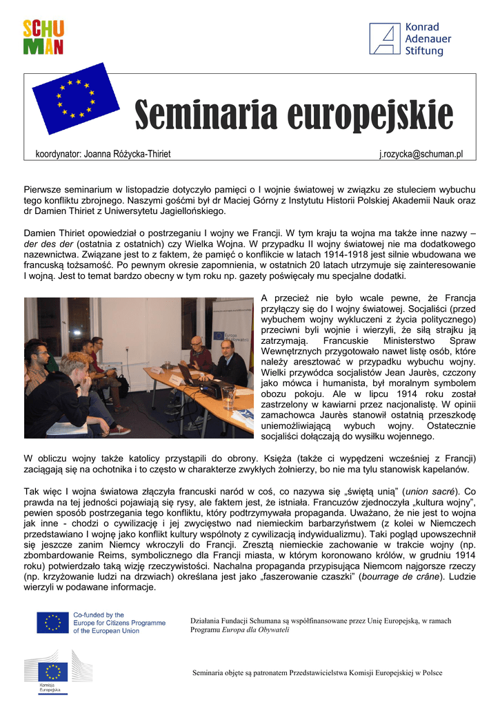 Seminaria europejskie koordynator: Joanna Różycka-Thiriet [email protected] Pierwsze seminarium w listopadzie dotyczyło pamięci o I wojnie światowej w związku ze stuleciem wybuchu tego konfliktu zbrojnego. Naszymi gośćmi był dr Maciej Górny z Instytutu Historii Polskiej Akademii Nauk oraz dr Damien Thiriet z Uniwersytetu Jagiellońskiego. Damien Thiriet opowiedział o postrzeganiu I wojny we Francji. W tym kraju ta wojna ma także inne nazwy – der des der (ostatnia z ostatnich) czy Wielka Wojna. W przypadku II wojny światowej nie ma dodatkowego nazewnictwa. Związane jest to z faktem, że pamięć o konflikcie w latach 1914-1918 jest silnie wbudowana we francuską tożsamość. Po pewnym okresie zapomnienia, w ostatnich 20 latach utrzymuje się zainteresowanie I wojną. Jest to temat bardzo obecny w tym roku np. gazety poświęcały mu specjalne dodatki. A przecież nie było wcale pewne, że Francja przyłączy się do I wojny światowej. Socjaliści (przed wybuchem wojny wykluczeni z życia politycznego) przeciwni byli wojnie i wierzyli, że siłą strajku ją zatrzymają. Francuskie Ministerstwo Spraw Wewnętrznych przygotowało nawet listę osób, które należy aresztować w przypadku wybuchu wojny. Wielki przywódca socjalistów Jean Jaurès, czczony jako mówca i humanista, był moralnym symbolem obozu pokoju. Ale w lipcu 1914 roku został zastrzelony w kawiarni przez nacjonalistę. W opinii zamachowca Jaurès stanowił ostatnią przeszkodę uniemożliwiającą wybuch wojny. Ostatecznie socjaliści dołączają do wysiłku wojennego. W obliczu wojny także katolicy przystąpili do obrony. Księża (także ci wypędzeni wcześniej z Francji) zaciągają się na ochotnika i to często w charakterze zwykłych żołnierzy, bo nie ma tylu stanowisk kapelanów. Tak więc I wojna światowa złączyła francuski naród w coś, co nazywa się „świętą unią” (union sacré). Co prawda na tej jedności pojawiają się rysy, ale faktem jest, że istniała. Francuzów zjednoczyła „kultura wojny”, pewien sposób postrzegania tego konfliktu, który podtrzymywała propaganda. Uważano, że nie jest to wojna jak inne - chodzi o cywilizację i jej zwycięstwo nad niemieckim barbarzyństwem (z kolei w Niemczech przedstawiano I wojnę jako konflikt kultury wspólnoty z cywilizacją indywidualizmu). Taki pogląd upowszechnił się jeszcze zanim Niemcy wkroczyli do Francji. Zresztą niemieckie zachowanie w trakcie wojny (np. zbombardowanie Reims, symbolicznego dla Francji miasta, w którym koronowano królów, w grudniu 1914 roku) potwierdzało taką wizję rzeczywistości. Nachalna propaganda przypisująca Niemcom najgorsze rzeczy (np. krzyżowanie ludzi na drzwiach) określana jest jako „faszerowanie czaszki” (bourrage de crâne). Ludzie wierzyli w podawane informacje. Działania Fundacji Schumana są współfinansowane przez Unię Europejską, w ramach Programu Europa dla Obywateli Seminaria objęte są patronatem Przedstawicielstwa Komisji Europejskiej w Polsce Ale z biegiem czasu zaczęło chodzić nie tylko o obronę cywilizacji. Żołnierze bronili też grobów poległych kolegów. Socjaliści chcieli walczyć do ostatniej kropli krwi, żeby ta wojna była ostatnią. Dla wielu katolików natomiast cierpienie wojenne było naśladowaniem cierpienia Jezusa, co nadawało wojnie niemal mistyczny wymiar. Uznawano, że żołnierze – bohaterowie – po śmierci nie idą do czyśćca, lecz od razu do nieba. Tak więc w związku z wojną we Francji zachwiała się wiara w czyściec. Z drugiej strony nastąpiła heroizacja wojny. Życie żołnierzy pokazuje się w sposób upiększony. Ludzie otrzymują taki obraz wojny, jaki chcą ją widzieć. Tymczasem Francuzi rozpoczęli wojnę bez hełmów (stąd dużo ran w głowę), w łatwo zauważalnych czerwonych spodniach (armia była rynkiem zbytu dla producentów z południa Francji), z niepraktycznymi bagnetami (w tamtej epoce żołnierze posługiwali się już karabinami, które w rzeczywistości ograniczały kontakt z przeciwnikiem). Osoby z terenów, które były we Francji okupowane przez Niemców (wschód i północ kraju), mają jeszcze inne doświadczenie. Przede wszystkim głodu wśród cywilów, który był dotkliwy do tego stopnia, że wypędzano miejscową ludność cywilną. Stąd podczas II wojny światowej mieszkańcy tamtych terenów sami wcześniej uciekali, bojąc się powtórki z historii. Po wojnie Francuzi mają traumę, przechodzą wielką żałobę. Liczbę zabitych szacuje się na 1 mln 300 tys., a kalek (bez rąk, bez nóg, osób z uszkodzonymi twarzami - tzw. złamanych gęb) na 400 000. Co prawda Niemcy mieli większe straty niż Francuzi, ale trzeba pamiętać, że przed I wojną światową Francja miała bardzo niski przyrost demograficzny (Francuzi umieli zapobiegać ciąży z pomocą stosunków przerywanych). W rodzinach było więc mniej dzieci. Do tej pory w miejscach bitew I wojny światowej krajobraz pokryty jest lejami po bombach. Pamięć o wojnie kultywują też różne środowiska. Po wojnie każda wieś sprawiła sobie pomnik poległych. Wystarczy popatrzeć na te pomniki i zapoznać się z wyrytymi na nich nazwiskami, żeby utwierdzić się w przekonaniu, ile ta wojna kosztowała żyć ludzkich. Pomniki były tak popularne, że niektóre firmy produkowały je taśmowo. Po drugie, w miejscu wielkich bitew powstały sanktuaria na kości poległych (ossuaria). Największe znajduje się w Douaumont, pod Verdun. Z cmentarzami wiąże się turystyka cmentarna, którą uprawiają nie tylko Francuzi, ale też Brytyjczycy czy Kanadyjczycy. Cmentarzy zarządzanych przez obcokrajowców jest kilkadziesiąt. Inną formą upamiętniania jest płomień ku czci nieznanego żołnierza, zapalony 14 lipca 1920 roku pod Łukiem Triumfalnym w Paryżu. Pomysł okazał się na tyle chwytliwy, że skopiowano go m.in. do Polski. Skutkiem wojny był pacyfizm wojska. Powojenna francuska doktryna obronna była defens