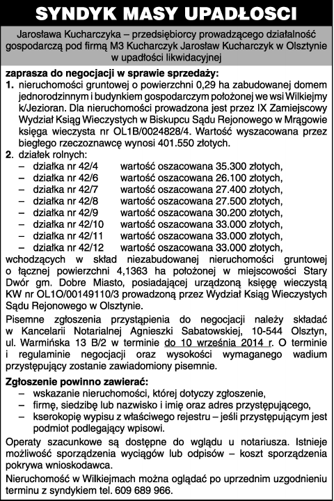 SYNDYK MASY UPADŁOSCI Jarosława Kucharczyka ̶ przedsiębiorcy prowadzącego działalność gospodarczą pod firmą M3 Kucharczyk Jarosław Kucharczyk w Olsztynie w upadłości likwidacyjnej zaprasza do negocjacji w sprawie sprzedaży: 1. nieruchomości gruntowej o powierzchni 0,29 ha zabudowanej domem jednorodzinnym i budynkiem gospodarczym położonej we wsi Wilkiejmy k/Jezioran. Dla nieruchomości prowadzona jest przez IX Zamiejscowy Wydział Ksiąg Wieczystych w Biskupcu Sądu Rejonowego w Mrągowie księga wieczysta nr OL1B/0024828/4. Wartość wyszacowana przez biegłego rzeczoznawcę wynosi 401.550 złotych. 2. działek rolnych : - działka nr 42/4 wartość oszacowana 35.300 złotych, - działka nr 42/6 wartość oszacowana 26.100 złotych, - działka nr 42/7 wartość oszacowana 27.400 złotych, - działka nr 42/8 wartość oszacowana 27.500 złotych, - działka nr 42/9 wartość oszacowana 30.200 złotych, - działka nr 42/10 wartość oszacowana 33.000 złotych, - działka nr 42/11 wartość oszacowana 33.000 złotych, - działka nr 42/12 wartość oszacowana 33.000 złotych, wchodzących w skład niezabudowanej nieruchomości gruntowej o łącznej powierzchni 4,1363 ha położonej w miejscowości Stary Dwór gm. Dobre Miasto, posiadającej urządzoną księgę wieczystą KW nr OL1O/00149110/3 prowadzoną przez Wydział Ksiąg Wieczystych Sądu Rejonowego w Olsztynie. Pisemne zgłoszenia przystąpienia do negocjacji należy składać w Kancelarii Notarialnej Agnieszki Sabatowskiej, 10-544 Olsztyn, ul. Warmińska 13 B/2 w terminie do 10 września 2014 r. O terminie i regulaminie negocjacji oraz wysokości wymaganego wadium przystępujący zostanie zawiadomiony pisemnie. Zgłoszenie powinno zawierać: - wskazanie nieruchomości, której dotyczy zgłoszenie, - firmę, siedzibę lub nazwisko i imię oraz adres przystępującego, - kserokopię wypisu z właściwego rejestru ̶ jeśli przystępującym jest podmiot podlegający wpisowi. Operaty szacunkowe są dostępne do wglądu u notariusza. Istnieje możliwość sporządzenia wyciągów lub odpisów ̶ koszt sporządzenia pokrywa wnioskodawca. Nieruchomość w Wilkiejmach można oglądać po uprzednim uzgodnieniu terminu z syndykiem tel. 609 689 966.