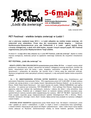 Łódź, kwiecień 2012 PET Festiwal – wielkie święto zwierząt w Łodzi ! JuŜ w pierwszy weekend maja 2012 r. w Łodzi odbędzie się wielkie święto zwierząt, ich właścicieli oraz miłośników. Przez dwa dni nowoczesny obiekt targowy Centrum Konferencyjno-Wystawiennicze przy alei Politechniki 2 w Łodzi – gościć będzie firmy z branŜy zoologicznej, a obok nich setki kotów, myszek i innych naszych pupili. PET Festiwal organizowany jest przez Międzynarodowe Targi Łódzkie. W dniach 5 - 6 maja 2012 roku odbędzie się w Łodzi PET Festiwal „Łódź dla zwierząt”. Będzie to wielka impreza zoologiczna, doskonały pomysł na spędzenie rodzinnego weekendu dla wszystkich mieszkańców Łodzi. PET FESTIWAL „Łódź dla zwierząt” to: - BOGATA OFERTA FIRM ZOOLOGICZNYCH prezentowana przez blisko 50 firm – w targach wezmą udział producenci i dystrybutorzy: sprzętu i akcesoriów do hodowli i pielęgnacji zwierząt domowych, Ŝwirków dla kotów, róŜnorodnych karm dla kotów i psów, drapaków, poŜywienia i zabawek dla zwierząt, ryb akwariowych i preparatów do akwariów, jak równieŜ firmy z ofertą usług dla właścicieli zwierząt. Wystawcy przygotowali wiele specjalnych promocji targowych, a cały asortyment będzie moŜna oczywiście zakupić. - 54. i 55. MIĘDZYNARODOWA WYSTAWA KOTÓW RASOWYCH imienia Anny Chodnikiewicz pod patronatem Federation Internationale Feline – FIFe organizowana przez CAT CLUB ŁÓDŹ. W skład wystawy wchodzi cały szereg atrakcji, w tym między innymi: Specjalistyczna Wystawa Hodowli - po raz pierwszy w Polsce, Wielki Pokaz Kotów Domowych - tym razem inaczej niŜ zwykle, WIELKA PARDUBICKA czyli agility dla kotów - im szybciej tym śmieszniej, TOP STEWARD*2011 - finał rankingu Felis Polonia. Organizatorzy zapewnią takŜe koci makijaŜ dla najmłodszych, konkursy i zabawy dla dzieci i miłą atmosferę, duŜo śmiechu i zabawy. Podobnie jak w ubiegłych latach na wystawie zostaną wyłonieni zwycięzcy grup, spośród których wybrany zostanie jeden najpiękniejszy kot wystawy – BEST OF THE BEST. Zaproszenie Cat Clubu przyjęła wspaniała grupa międzynarodowych sędziów felinologicznych FIFe z Ukrainy, Włoch, Finlandii, Szwajcarii, Norwegii, Czech, Danii i Izraela. Będą oceniać koty przybyłe na wystawę z odległych czasem krajów. - WYSTAWA MYSZY RASOWYCH organizowana przez Polish Mouse Club. Od białych i kremowych, przez rude i gołębie po czarne i czekoladowe, w paski, w ciapki a nawet o umaszczeniu kota syjamskiego, z włosem krótkim i błyszczącym jak satyna lub długim i pokarbowanym – takie i wiele innych myszy będzie moŜna zobaczyć na Wystawie. Zainteresowanym wiedzą na temat hodowli, genetyki, warunków utrzymania i wszystkich innych aspektów związanych z myszami rasowymi z miłą chęcią pomogą hodowcy. Najmłodsi, jak zawsze, będą rozpieszczeni wśród „mysiarzy” – czekają na nich kredki, flamastry i kartki będą mogli pokolorować szablon lub narysować własną, wymarzoną myszkę. KaŜde dziecko dostanie drobny upominek. Dla osób chcących poczuć się jak sędzia – konkurs na najpiękniejszą mysz publiczności – spośród wybranych do konkursu myszy, zwiedzający będą mogli wytypować tą, która najbardziej przypadła im do gustu. - POKAZ FRETEK zorganizowany przez Stowarzyszenie Przyjaciół Fretek zajmujące się szeroko rozumianą edukacją dotycząca opieki nad fretkami. Członkowie Stowarzyszenia będą udzielali fachowych porad dotyczących wychowania, utrzymania, Ŝywienia oraz opieki nad fretkami. Odbędzie się promocja Fretkowej Akcji Adopcyjnej, która zajmuje się znajdywaniem domów dla bezdomnych fretek będących pod opieką Stowarzyszenia. Stowarzyszenie wspierać będą zaprzyjaźnieni lekarze weterynarii oraz zwierzęcy rehabilitant, którzy słuŜyć będą swoją nieocenioną wiedzą. Na najmłodszych czekają konkursy z nagrodami na rysowanie zwierząt lub kolorowanie szablonów. - POKAZ ZAGANIANIA KACZEK PRZEZ PSY PASTERSKIE RASY BORDER COLIE - organizowany przez pana Piotra Polewskiego oraz Związek Kynologiczny Oddział w Łodzi. Na pokaz zapraszamy w sobotę i niedzielę o godzinie 14.00. - BEZPŁATNE CZIPOWANIE PSÓW - Akcja odbywać się będzie przez cały czas trwania Festiwalu, na stoisku gabinetu weterynaryjnego TROP. W ramach zapobiegania bezdomności zwierząt gabinet TROP bierze udział w akcji bezpłatnego czipowania psów z terenu Łodzi, a takŜe bezpłatnej sterylizacji i kastracji kotów wolno Ŝyjących. Na stoisku gabinetu będzie moŜna równieŜ zasięgnąć porad weterynaryjnych od doświadczonych lekarzy. Warunkiem bezpłatnego zaczipowania psa jest posiadanie przez właściciela dowodu osobistego z adresem zameldowania w Łodzi. Mile widziana będzie takŜe ksiąŜeczka zdrowia psa, gdzie zostanie umieszczony numery czipu. - KONKURSY DLA ZWIEDZAJĄCYCH - a w nich moŜliwość wygrania ponad 100 NAGRÓD: drapaków, karm dla psów i kotów, Ŝwirków, bonów na ubranka dla psów, kubków, koszulek i wielu innych prezentów. - ANIMACJE I KONKURSY DLA DZIECI prowadzone przez Stowarzyszenie Przyjaciół Fretek, Fundację KOCIA MAMA, Polish Mouse Club oraz Stowarzyszenie Twórców Kultury i Sztuki KAMIENICA 56. - STREFA ROZRYWKI DLA CAŁEJ RODZINY – takŜe wiele atrakcji dla podniebienia ☺ W terminie festiwalu odbywać się będzie w Łodzi takŜe Międzynarodowa Wystawa Psów Rasowych, organizowana przez Związek Kynologiczny Odział w Łodzi na stadionie SKS START. Na PET Festiwal, Wystawę Kotów oraz inne wydarzenia odbywające się w Hali CKW będzie obowiązywał jeden bilet. Natomiast dla wszystkich, którzy zechcą odwiedzić zarówno imprezę organizowaną w Centrum przy alei Politechniki 2, jak i wystawę psów na Stadionie SKS START zostanie przygotowaliśmy specjalną promocję – okazując bilet z jednej imprezy, na drugą będzie moŜna kupić tańszy bilet. Specjalna cena biletów czeka równieŜ na właści