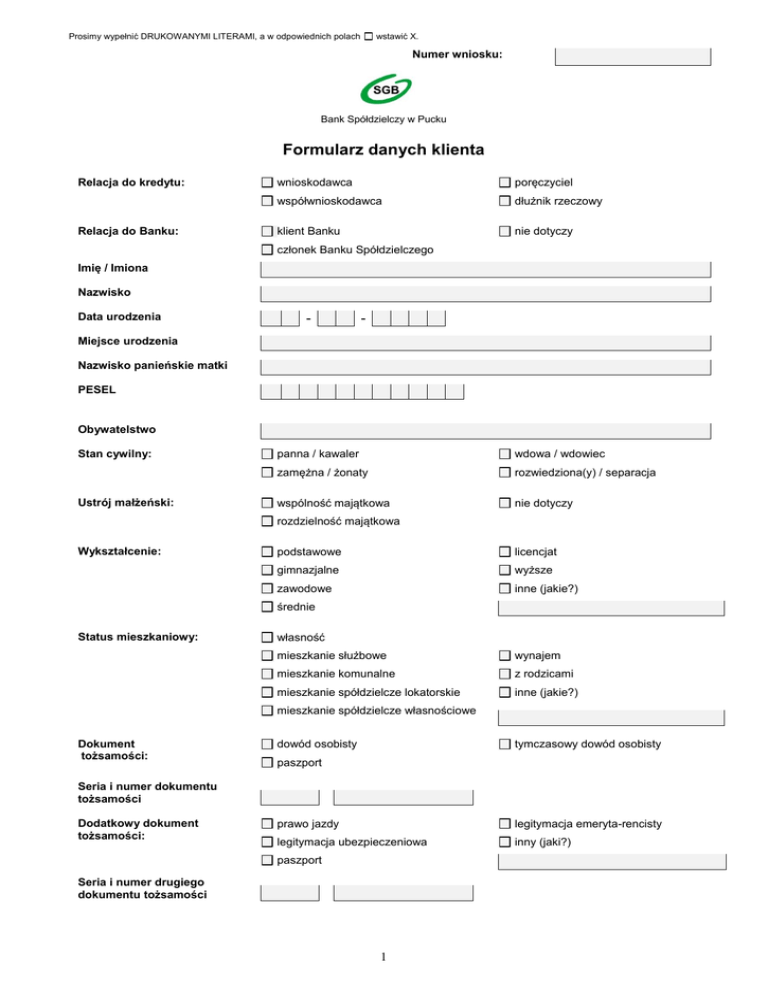 Prosimy wypełnić DRUKOWANYMI LITERAMI, a w odpowiednich polach wstawić X. Numer wniosku: Bank Spółdzielczy w Pucku Formularz danych klienta Relacja do kredytu: Relacja do Banku: wnioskodawca poręczyciel współwnioskodawca dłużnik rzeczowy klient Banku nie dotyczy członek Banku Spółdzielczego Imię / Imiona Nazwisko Data urodzenia - - Miejsce urodzenia Nazwisko panieńskie matki PESEL Obywatelstwo Stan cywilny: Ustrój małżeński: panna / kawaler wdowa / wdowiec zamężna / żonaty rozwiedziona(y) / separacja wspólność majątkowa nie dotyczy rozdzielność majątkowa Wykształcenie: podstawowe licencjat gimnazjalne wyższe zawodowe inne (jakie?) średnie Status mieszkaniowy: własność mieszkanie służbowe wynajem mieszkanie komunalne z rodzicami mieszkanie spółdzielcze lokatorskie inne (jakie?) mieszkanie spółdzielcze własnościowe Dokument tożsamości: dowód osobisty tymczasowy dowód osobisty paszport Seria i numer dokumentu tożsamości Dodatkowy dokument tożsamości: prawo jazdy legitymacja emeryta-rencisty legitymacja ubezpieczeniowa inny (jaki?) paszport Seria i numer drugiego dokumentu tożsamości 1 Numer wniosku: Adres zameldowania Rok zameldowania miejscowość ulica / nr domu / mieszkania kod pocztowy - Adres zamieszkiwania poczta Rok zamieszkiwania miejscowość ulica / nr domu / mieszkania kod pocztowy - poczta - poczta Adres do korespondencji miejscowość ulica / nr domu / mieszkania kod pocztowy Telefon kontaktowy: komórkowy - - domowy / służbowy - - / - - Adres e-mail: domowy / służbowy Miesięczne wydatki z tytułu utrzymania lokalu mieszkalnego PLN Miesięczne wydatki związane z utrzymaniem członków gospodarstwa domowego PLN Liczba osób we wspólnym gospodarstwie domowym Zobowiązania finansowe: Prosimy podać informacje o zobowiązaniach i poręczeniach, które nie finansują działalności gospodarczej / rolniczej, KREDYT: kredyt gotówkowy, samochodowy, studencki, ratalny, leasing, kredyt mieszkaniowy, pożyczka hipoteczna, pożyczka itp., KARTA: karta kredytowa, LIMIT: kredyt odnawialny w ROR, DEBET: karta charge, limit debetowy w ROR. Rodzaj zobowiązania Kredyt Karta Limit Debet Stopa procentowa zobowiązania Stała Zmienna Wartość aktualnego zobowiązania (przyznanego limitu) w PLN *K – główny kredytobiorca, pożyczkobiorca, Zobowiązania inne Oryginalna waluta zobowiązania Miesięczne zobowiązanie w PLN (nie dot. Karta i Limit) Data zawarcia umowy Nazwa banku/instytucji pożyczkowej K* W* P* W – współkredytobiorca, P - poręczyciel Wartość aktualnego zobowiązania w PLN Waluta Miesięczne zobowiązanie w PLN Świadczenia alimentacyjne Zobowiązania podatkowe Inne (np. ubezpieczenia, renty) Rachunek w BS Puck…………………………………………………………………………… Data założenia rachunku w Banku rozpatrującym wniosek: Posiadany majątek Relacja do zobowiązania Wartość w PLN Charakterystyka majątku Nieruchomości Adres nieruchomości, opis, KW Lokaty Termin zapadalności, opis Ruchomości (np.: samochód) Marka, rok produkcji, opis, nr rejestracyjny Inne (akcje, obligacje, udziały) Rodzaj, ilość, opis 2 Numer wniosku: Oświadczenia Klienta: 1) ubiegam się o kredyt / pożyczkę w innym banku: , podać nazwę banku: 2) moja kondycja finansowa jest / nie jest uzależniona pośrednio lub bezpośrednio od powiązania z członkiem organu Banku (Zarządu Banku, Rady Nadzorczej Banku) lub osobą zajmującą stanowisko kierownicze w Banku (pracownik Banku podlegający bezpośrednio członkom Zarządu Banku oraz dyrektorzy oddziałów Banku, ich zastępcy i główni księgowi), rodzaj powiązania: 3) 4) 5) wnioskowany kredyt nie jest przeznaczony na działalność gospodarczą, prowadzę/ nie prowadzę działalności gospodarczej / działalności rolniczej, zostałem poinformowany, że w przypadku przedłożenia fałszywych dokumentów lub informacji, zebrane informacje, Bank może przekazać do Systemu Dokumenty Zastrzeżone, którego administratorem jest Związek Banków Polskich, zostałem poinformowany przez pracownika Banku o ponoszeniu ryzyka zmiany stopy procentowej w związku z zaciągnięciem kredytu o zmiennym oprocentowaniu, o możliwości wzrostu kosztu tego kredytu w przypadku wzrostu stawki bazowej** zostały mi przekazane informacje niezbędne do podjęcia decyzji w zakresie zaciąganego zobowiązania kredytowego i udzielone wyjaśnienia dotyczące: informacji zawartych w przekazanym mi „Formularzu informacyjnym dotyczącym kredytu konsumenckiego”, postanowień zawartych w umowie, otrzymałem/ nie otrzymałem: a. „Regulamin udzielania kredytów konsumenckich”, b. „Regulamin funkcjonowania kart kredytowych i charge dla klientów indywidualnych”. 6) 7) 8) Bank Spółdzielczy w Pucku (dalej Bank) informuje, że: 1) jako administrator Pani/Pana danych przetwarza Pani/Pana dane osobowe w celu podjęcia niezbędnych działań przed zawarciem umowy w celu oceny zdolności kredytowej i analizy ryzyka kredytowego oraz związanych z zawarciem i wykonaniem umowy. Dane te są przeznaczone dla Banku oraz mogą być przekazane podmiotom upoważnionym przez przepisy prawa, w tym wskazanym w art. 105 ustawy z dnia 29 sierpnia 1997 r. Prawo bankowe ( Dz. U. z 2015 r., poz. 128 ze zm.), tj. do innych banków, instytucji kredytowych i finansowych, Biura Informacji Kredytowej S.A., Krajowego Rejestru Długów Biura Informacji Gospodarczej S.A. z siedzibą we Wrocławiu, InfoMonitora Biura Informacji Gospodarczej S.A. z siedzibą w Warszawie oraz Systemu Bankowy Rejestr prowadzonego przez Związek Banków Polskich z siedzibą w Warszawie; 2) podane przez Pana/Panią dane osobowe będą przetwarzane przez Biuro Informacji Kredytowej S.A. z siedzibą w Warszawie przy ul. Zygmunta Modzelewskiego 77A w celu i zakresie określonym w art. 105 i 105a ustawy Prawo bankowe, w tym w celu oceny zdolności kredytowej i analizy ryzyka kredytowego oraz w celu stosowania przez Bank metod sta