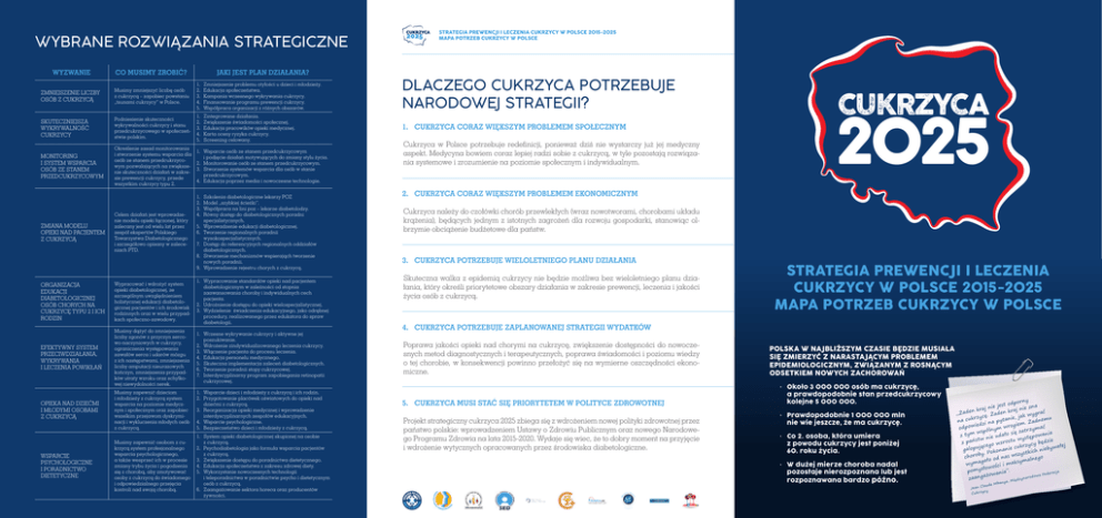 WYBRANE ROZWIĄZANIA STRATEGICZNE WYZWANIE CO MUSIMY ZROBIĆ? ZMNIEJSZENIE LICZBY OSÓB Z CUKRZYCĄ Musimy zmniejszyć liczbę osób z cukrzycą – zapobiec powstaniu „tsunami cukrzycy” w Polsce. 1. 2. 3. 4. 5. Zmniejszenie problemu otyłości u dzieci i młodzieży. Edukacja społeczeństwa. Kampania wczesnego wykrywania cukrzycy. Finansowanie programu prewencji cukrzycy. Współpraca organizacji z różnych obszarów. DLACZEGO CUKRZYCA POTRZEBUJE NARODOWEJ STRATEGII? SKUTECZNIEJSZA WYKRYWALNOŚĆ CUKRZYCY Podniesienie skuteczności wykrywalności cukrzycy i stanu przedcukrzycowego w społeczeństwie polskim. 1. 2. 3. 4. 5. Zintegrowane działania. Zwiększenie świadomości społecznej. Edukacja pracowików opieki medycznej. Karta oceny ryzyka cukrzycy. Screening celowany. 1. CUKRZYCA CORAZ WIĘKSZYM PROBLEMEM SPOŁECZNYM MONITORING I SYSTEM WSPARCIA OSÓB ZE STANEM PRZEDCUKRZYCOWYM Określenie zasad monitorowania i stworzenie systemu wsparcia dla osób ze stanem przedcukrzycowym pozwalających na zwiększenie skuteczności działań w zakresie prewencji cukrzycy, przede wszystkim cukrzycy typu 2. 1. Wsparcie osób ze stanem przedcukrzycowym i podjęcie działań motywujących do zmiany stylu życia. 2. Monitorowanie osób ze stanem przedcukrzycowym. 3. Stworzenie systemów wsparcia dla osób w stanie przedcukrzycowym. 4. Edukacja poprzez media i nowoczesne technologie. ZMIANA MODELU OPIEKI NAD PACJENTEM Z CUKRZYCĄ Celem działań jest wprowadzenie modelu opieki łączonej, który zalecany jest od wielu lat przez zespół ekspertów Polskiego Towarzystwa Diabetologicznego i szczegółowo opisany w zaleceniach PTD. JAKI JEST PLAN DZIAŁANIA? STRATEGIA PREWENCJI I LECZENIA CUKRZYCY W POLSCE 2015-2025 MAPA POTRZEB CUKRZYCY W POLSCE 1. 2. 3. 4. 5. 6. 7. 8. 9. Szkolenia diabetologiczne lekarzy POZ Model „szybkiej ścieżki”. Współpraca na lini poz – lekarze diabetolodzy. Równy dostęp do diabetologicznych poradni specjalistycznych. Wprowadzenie edukacji diabetologicznej. Tworzenie regionalnych poradnii wysokospecjalistycznych. Dostęp do referencyjnych regionalnych oddziałów diabetologicznych. Stworzenie mechanizmów wspierająch tworzenie nowych poradnii. Wprowadzenie rejestru chorych z cukrzycą. ORGANIZACJA EDUKACJI DIABETOLOGICZNEJ OSÓB CHORYCH NA CUKRZYCĘ TYPU 2 I ICH RODZIN Wypracować i wdrożyć system opieki diabetologicznej, ze szczególnym uwzględnieniem holistycznej edukacji diabetologicznej pacjentów i ich środowisk rodzinnych oraz w wielu przypadkach społeczno-zawodowy. 1. Wypracowanie standardów opieki nad pacjentem diabetologicznym w zależności od stopnia zaawansowania choroby i indywidualnych cech pacjenta. 2. Udrożnienie dostępu do opieki wielospecjalistycznej. 3. Wydzielenie świadczenia edukacyjnego, jako odrębnej procedury, realizowanego przez edukatora do spraw diabetologii. EFEKTYWNY SYSTEM PRZECIWDZIAŁANIA, WYKRYWANIA I LECZENIA POWIKŁAŃ Musimy dążyć do zmniejszenia liczby zgonów z przyczyn sercowo-naczyniowych w cukrzycy, ograniczenia występowania zawałów serca i udarów mózgu z ich następstwami, zmniejszenia liczby amputacji nieurazowych kończyn, zmniejszenia przypadków utraty wzroku oraz schyłkowej niewydolności nerek. 1. Wczesne wykrywanie cukrzycy i aktywne jej poszukiwanie. 2. Wdrożenie zindywidualizowanego leczenia cukrzycy. 3. Włączenie pacjenta do procesu leczenia. 4. Edukacja personelu medycznego. 5. Skuteczna implementacja zaleceń diabetologicznych. 6. Tworzenie poradnii stopy cukrzycowej. 7. Interdyscyplinarny program zapobiegania retinopatii cukrzycowej. OPIEKA NAD DZIEĆMI I MŁODYMI OSOBAMI Z CUKRZYCĄ Musimy zapewnić dzieciom i młodzieży z cukrzycą system wsparcia na poziomie medycznym i społecznym oraz zapobiec wszelkim przejawom dyskryminacji i wykluczenia młodych osób z cukrzycą. 1. Wsparcie dzieci i młodzieży z cukrzycą i ich rodzin. 2. Przygotowanie placówek oświatowych do opieki nad dziećmi z cukrzycą. 3. Reorganizacja opieki medycznej i wprowadzenie interdyscyplinarnych zespołów edukacyjnych. 4. Wsparcie psychologiczne. 5. Bezpieczeństwo dzieci i młodzieży z cukrzycą. WSPARCIE PSYCHOLOGICZNE I PORADNICTWO DIETETYCZNE Musimy zapewnić osobom z cukrzycą system profesjonalnego wsparcia psychologicznego, a także wesprzeć ich w procesie zmiany trybu życia i pogodzenia się z chorobą, aby zmotywować osoby z cukrzycą do świadomego i odpowiedzialnego przejęcia kontroli nad swoją chorobą. 1. System opieki diabetologicznej skupionej na osobie z cukrzycą. 2. Psychodiabetologia jako formuła wsparcia pacjentów z cukrzycą. 3. Zwiększenie dostępu do poradnictwa dietetycznego. 4. Edukacja społeczeństwa z zakresu zdrowej diety. 5. Wykorzystanie nowoczesnych technologii i teleporadnictwa w poradnictwie psycho i dietetycznym osób z cukrzycą. 6. Zaangażowanie sektora horeca oraz producentów żywności. Cukrzyca w Polsce potrzebuje redefinicji, ponieważ dziś nie wystarczy już jej medyczny aspekt. Medycyna bowiem coraz lepiej radzi sobie z cukrzycą, w tyle pozostają rozwiązania systemowe i zrozumienie na poziomie społecznym i indywidualnym. 2. CUKRZYCA CORAZ WIĘKSZYM PROBLEMEM EKONOMICZNYM CUKRZYCA 2025 Cukrzyca należy do czołówki chorób przewlekłych (wraz nowotworami, chorobami układu krążenia), będących jednym z istotnych zagrożeń dla rozwoju gospodarki, stanowiąc olbrzymie obciążenie budżetowe dla państw. 3. CUKRZYCA POTRZEBUJE WIELOLETNIEGO PLANU DZIAŁANIA Skuteczna walka z epidemią cukrzycy nie będzie możliwa bez wieloletniego planu działania, który określi priorytetowe obszary działania w zakresie prewencji, leczenia i jakości życia osób z cukrzycą. STRATEGIA PREWENCJI I LECZENIA CUKRZYCY W POLSCE 2015-2025 MAPA POTRZEB CUKRZYCY W POLSCE 4. CUKRZYCA POTRZEBUJE ZAPLANOWANEJ STRATEGII WYDATKÓW Poprawa jakości opieki nad chorymi na cukrzycę, zwiększenie dostępności do nowoczesnych metod diagnostycznych i terapeutycznych, poprawa 