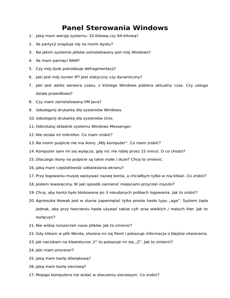 Panel Sterowania Windows 1. Jaką mam wersję systemu: 32-bitową czy 64-bitową? 2. Ile partycji znajduje się na moim dysku? 3. Na jakim systemie plików zainstalowany jest mój Windows? 4. Ile mam pamięci RAM? 5. Czy mój dysk potrzebuje defragmentacji? 6. Jaki jest mój numer IP? Jest statyczny czy dynamiczny? 7. Jaki jest adres serwera czasu, z którego Windows pobiera aktualny czas. Czy usługa działa prawidłowo? 8. Czy mam zainstalowaną VM Java? 9. Udostępnij drukarkę dla systemów Windows. 10. Udostępnij drukarkę dla systemów Unix. 11. Odinstaluj składnik systemu Windows Messenger. 12. Nie działa mi mikrofon. Co mam zrobić? 13. Na moim pulpicie nie ma ikony „Mój komputer”. Co mam zrobić? 14. Komputer sam mi się wyłącza, gdy nic nie robię przez 15 minut. O co chodzi? 15. Dlaczego ikony na pulpicie są takie małe / duże? Chcę to zmienić. 16. Jaką mam częstotliwość odświeżania ekranu? 17. Przy logowaniu muszę wpisywać nazwę konta, a chciałbym tylko w nią klikać. Co zrobić? 18. Jestem leworęczny. W jaki sposób zamienić miejscami przyciski myszki? 19. Chcę, aby konto było blokowane po 3 nieudanych próbach logowania. Jak to zrobić? 20. Agnieszka Nowak jest w stanie zapamiętać tylko proste hasło typu „aga”. System żąda jednak, aby przy tworzeniu hasła używać także cyfr oraz wielkich / małych liter. Jak to wyłączyć? 21. Nie widzę rozszerzeń nazw plików. Jak to zmienić? 22. Gdy klikam w plik Worda, otwiera mi się Paint i pokazuje informacja o błędzie otwierania. 23. Jak naciskam na klawiaturze „Y” to pokazuje mi się „Z”. Jak to zmienić? 24. Jaki mam procesor? 25. Jaką mam kartę dźwiękową? 26. Jaką mam kartę sieciową? 27. Mojego komputera nie widać w otoczeniu sieciowym. Co zrobić?
