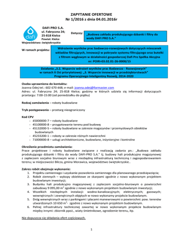 ZAPYTANIE OFERTOWE Nr 1/2016 z dnia 04.01.2016r DAFI PRO S.A. ul. Fabryczna 24; 25-818 Kielce Dotyczy: Powiat: Kielce Województwo: świętokrzyskie W ramach projektu: „Budowa zakładu produkującego dzbanki i filtry do wody DAFI PRO S.A.” Wdrożenie wyników prac badawczo-rozwojowych dotyczących mieszanek wkładów filtrujących, innowacji w pokrywie systemu filtrującego oraz butelki z filtrem węglowym w działalności gospodarczej Dafi Pro Spółka Akcyjna nr: POIR>03.02.01-26-0008/15 Działania „3.2. Wsparcie wdrożeń wyników prac Badawczo - Rozwojowych” w ramach X Osi priorytetowej: „3. Wsparcie innowacji w przedsiębiorstwach” Programu Operacyjnego Inteligentny Rozwój, 2014-2020 Osoba uprawniona do kontaktu: Joanna Odej tel.: 602 670 448; e-mail: [email protected] Adres: ul. Fabryczna 24; 25-818 Kielce; godziny w których udziela się informacji dotyczących przetargu: 7:00-15:00 (od poniedziałku do piątku) Rodzaj zamówienia – roboty budowlane Tryb postępowania – przetarg nieograniczony Kod CPV - 45000000-7 – roboty budowlane - 45100000-8 – przygotowanie terenu pod budowę - 45132000-5 – roboty budowlane w zakresie magazynów i przemysłowych obiektów budowlanych - 45233200-1 – roboty w zakresie różnych nawierzchni - 71000000-8 – usługi architektoniczne, budowlane, inżynieryjne i kontrolne Określenie przedmiotu zamówienia: Prace projektowe i roboty budowlane związane z realizacją zadania pn.: „Budowa zakładu produkującego dzbanki i filtry do wody DAFI-PRO S.A.” tj. budowy hali produkcyjno magazynowej z zapleczem socjalno biurowym wraz z niezbędną infrastrukturą techniczną i zagospodarowaniem terenu; w miejscowości Bilcza, gmina Morawica, województwo świętokrzyskie.. Zakres robót obejmuje wykonanie: 1. Projektu zamiennego i uzyskanie pozwolenia zamiennego dla planowanego przedsięwzięcia; 2. Robót ziemnych – wykopy obiektowe ze skarpami zgodnie z nowo wykonanym projektem budowlanym inwestycji; 3. Budynku hali produkcyjno magazynowej z zapleczem socjalno-biurowym o powierzchni zabudowy 9 095,00 m2 zgodnie z nowo wykonanym projektem budowlanym inwestycji; 4. Wszelkich niezbędnych instalacji: wodno-kanalizacyjnych; elektrycznych; gazowych; wewnętrznych i zewnętrznych objętych w nowo wykonamy projekcie budowlanym. 5. Dróg wewnętrznych wraz z parkingami i placami manewrowymi o powierzchni: pow. terenów utwardzonych 10 650 m2- zgodnie z nowo wykonanym projektem budowlanym. 6. Pełnej infrastruktury technicznej zawartej w nowo wykonanym projekcie budowlanym między innymi: zbiornik ppoż., wiaty śmietnikowe, ogrodzenie terenu, itp. Nie dopuszcza się składania ofert częściowych. 1 Termin realizacji zamówienia: wymagany do 12 miesięcy od daty podpisania umowy Kryteria wyboru oferty i ich znaczenia w (%) – zgodnie z SIWZ: Etap I – 100% cena Etap II – 70% cena; 10% czas realizacji; 10% gwarancja; 10% materiały i rozwiązania techniczne Etap III - indywidualne negocjacje inwestora z oferentem, oraz spełnienie wszystkich wymogów postawionych w SIWZ w punktach: III i IV. Specyfikacja istotnych warunków zamówienia: Specyfikacja istotnych warunków zamówienia wraz z załącznikami dostępna jest pod adresem e-mail: [email protected]; bądź osobiście w siedzibie firmy po uprzednim kontakcie telefonicznym tel.: 602 670 448 Warunki udziału w przetargu W przetargu mogą wziąć udział oferenci niewykluczeni na podstawie art. 24 ust.1 i 2, spełniają n/w warunki zawarte w art. 22 ust.1: Są uprawnieni do występowania w obrocie prawnym zgodnie z wymogami ustawowymi. Posiadają uprawnienia niezbędne do wykonania przedmiotu umowy. Posiadają niezbędną, wiedzę i doświadczenie. Posiadają potencjał ekonomiczny, a także pracowników zdolnych do wykonania zadania. Spełniają warunki określone w specyfikacji istotnych warunków zamówienia. Miejsce i termin składania ofert: drogą elektroniczną na adres e-mail: [email protected] osobiście w siedzibie firmy: Portiernia, ul. Fabryczna 24; 25-818 Kielce; termin składania ofert na poszczególnych etapach: Etap I – 10.03.2016 (czwartek) godz.: 13:00 Etap II – 23.03.2016 (środa) godz.: 13:00 Etap III – 15.04.2016 (poniedziałek) godz.: 13:00 Data ogłoszenia wyników poszczególnych etapów: Etap I: 14.03.2016 (poniedziałek) Etap II: 01.04.2016 (piątek) Etap III: Rozstrzygnięcie przetargu 21.04.2016 (czwartek) Termin związania ofertą: Wykonawca pozostaje związany ofertą przez okres 30 dni licząc od ostatniego dnia wyznaczonego na składanie oferty w poszczególnych etapach rekrutacji. Zamawiający zastrzega sobie kontakt tylko z wybranymi oferentami oraz możliwości negocjacji z więcej niż jednym oferentem. Zamawiający zastrzega sobie możliwość unieważnienia przetargu bez podania przyczyn. Zamawiający zastrzega sobie prawo do udzielenia Wykonawcy zamówień uzupełniających i dodatkowych nieobjętych zamówieniem podstawowym i nieprzekraczających 50% wartości realizowanego zamówienia podstawowego, niezbędnych do jego prawidłowego wykonania zamówienia podstawowego. 2