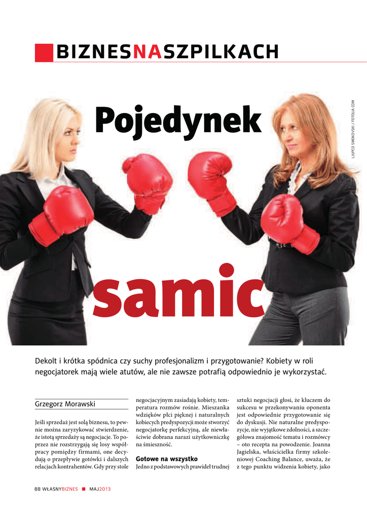 Pojedynek samic Dekolt i krótka spódnica czy suchy profesjonalizm i przygotowanie? Kobiety w roli negocjatorek mają wiele atutów, ale nie zawsze potrafią odpowiednio je wykorzystać. Grzegorz Morawski Jeśli sprzedaż jest solą biznesu, to pewnie można zaryzykować stwierdzenie, że istotą sprzedaży są negocjacje. To poprzez nie rozstrzygają się losy współpracy pomiędzy firmami, one decydują o przepływie gotówki i dalszych relacjach kontrahentów. Gdy przy stole ■ -./0 negocjacyjnym zasiadają kobiety, temperatura rozmów rośnie. Mieszanka wdzięków płci pięknej i naturalnych kobiecych predyspozycji może stworzyć negocjatorkę perfekcyjną, ale niewłaściwie dobrana narazi użytkowniczkę na śmieszność. Gotowe na wszystko Jedno z podstawowych prawideł trudnej sztuki negocjacji głosi, że kluczem do sukcesu w przekonywaniu oponenta jest odpowiednie przygotowanie się do dyskusji. Nie naturalne predyspozycje, nie wyjątkowe zdolności, a szczegółowa znajomość tematu i rozmówcy – oto recepta na powodzenie. Joanna Jagielska, właścicielka firmy szkoleniowej Coaching Balance, uważa, że z tego punktu widzenia kobiety, jako LJUPCO SMOKOVSKI / FOTOLIA.COM TRAINING & CONSULTING, AVENHANSEN LEKCJE ODROBIONE Ewa Kastory prezes Grupy Training & Consulting, twórca Szkoły Negocjacji koreańskich przedsiębiorców, którzy mieli negocjować kontrakt. Przylecieli prywatnym samolotem z drugiej półkuli – opowiada Jagielska. – Tymczasem prezes, sam nieznający języka angielskiego, postanowił zatrudnić w roli tłumacza własną 16-letnią córkę, niezbyt wprawioną w branżowej terminologii. Rozmowy zupełnie się nie kleiły, nikt nic nie rozumiał. Na lunch zabrano Koreańczyków do pierogarni, skąd prezes zadzwonił do mnie zdziwiony, że oni nie za bardzo chcą płacić za siebie. To chyba idealny przykład braku przygotowania do negocjacji w męskim wydaniu. Kobiety w trójkącie Najlepszym negocjatorem, niezależnie od płci, jest po prostu osoba przygotowana. płeć z natury bardziej uporządkowana, stoją na uprzywilejowanej pozycji. Kłania się etos Matki Polki. – Kobiety od małego przyzwyczaja się do radzenia sobie w kilku rolach naraz – od prowadzenia domu po życie zawodowe. Dlatego potrafimy się świetne organizować. W spotkaniach biznesowych skutkuje to tym, że jesteśmy do nich doskonale przygotowane – mówi specjalistka. Podobnego zdania jest Ewa Kastory, prezes Grupy Training & Consulting, twórca i kierownik merytoryczny pierwszej w Polsce rocznej Szkoły Negocjacji opartej na praktyce biznesowej. – Najlepszym negocjatorem, niezależnie od płci, jest po prostu osoba przygotowana. Wydaje mi się, że umiejętność organizacji własnej pracy częściej cechuje kobiety – twierdzi. W odróżnieniu od kobiet mężczyźni często idą na żywioł. To zaś może zaowocować niepożądanymi niespodziankami. – Niedawno pewna firma z branży informatycznej poprosiła mnie, bym ratowała niefortunnie rozpoczęte negocjacje. Do jej siedziby przybyła delegacja Co takiego mają w sobie kobiety, co predestynuje je do bycia dobrymi negocjatorkami? Za ich naturalny atut trzeba uznać umiejętność słuchania. – Zadawanie odpowiednich pytań i wsłuchiwanie się w odpowiedzi to cenna umiejętność, która pozwoli nam dobrze ustawić się w procesie negocjacyjnym. Według mnie kobietom przychodzi to łatwiej niż mężczyznom dzięki wrodzonej empatii – mówi Jagielska. Teoretycy relacji międzyludzkich opracowali tzw. trójkąt satysfakcji w negocjacjach. Jego kształt odzwierciedla zależności pomiędzy trzema aspektami negocjowania: tym, co chcemy osiągnąć (interesy rzeczowe), samopoczuciem rozmówcy (interesy psychologiczne) oraz sposobem prowadzenia rozmowy (interesy proceduralne). Negocjacje skuteczne charakteryzują równomierne proporcje wymienionych sfer. Innymi słowy, im więcej chcemy ugrać, tym bardziej powinniśmy pracować nad komfortem rozmówcy. Według Ewy Kastory, lepszymi strażniczkami owej równomierności są kobiety. – Mężczyźni często gubią się w wyścigu o trofeum, zapominając, że zbyt duży nacisk na interesy rzeczowe może rodzić ograniczenia w długofalowej perspektywie. By osiągnąć zamierzenia, warto widzieć więcej i dalej, nie zawsze koncentracja na szybkim zysku finansowym jest najbardziej opłacalną strategią – podkreśla. Nie oznacza to jednak, że kobiety w negocjacjach odznacza nadmierna uległość. – Wręcz przeciwnie. Na poziomie rzeczowym kobiety potrafią być twarde. Być może nie manifestują pozycji siły tak ekspresyjnie, jak to się zdarza mężczyznom, ale potrafią skutecznie realizować swoje założenia – zaznacza specjalistka. Damskich wdzięków grząski grunt Świadomość własnych wdzięków może wieść do kobiecego przekonania, że najlepszy efekt w negocjacjach można uzyskać, odpowiednio łącząc umiejętności interpersonalne z dyskretną emanacją kobiecymi wdziękami. To NIE TĘDY DROGA Mirosław Plak trener biznesu w firmie Avenhansen Podczas rozmowy kwalifikacyjnej kandydatce zadano pytanie, jak poradzi sobie w konfrontacji z trudnym klientem. Ona w odpowiedzi uśmiechnęła się, pogładziła po włosach i odparła: „Mam swoje sposoby”. Dla rekrutujących był to wystarczający sygnał, że mają do czynienia z osobą niezbyt profesjonalną. -./0 ■ > jednak niezwykle delikatna materia, a nadmierne wykorzystywanie seksapilu może na użytkowniczce surowo się zemścić. – Jeśli kobieta stawia na eksponowanie swojego ciała, zamiast skupić się na rzeczowych argumentach, to zwyczajnie przestaje być profesjonalna. Co za tym idzie, w oczach mężczyzny przestaje być postrzegana jak równorzędny partner do rozmowy, za to staje się zwierzyną łowną – uważa Ewa Kastory. – Pozycję negocjacyjną buduje się poprzez swój wizerunek. Podstawowe narzędzie negocjatora to wiarygodność, a nie kształtne uda. Okazuje się,