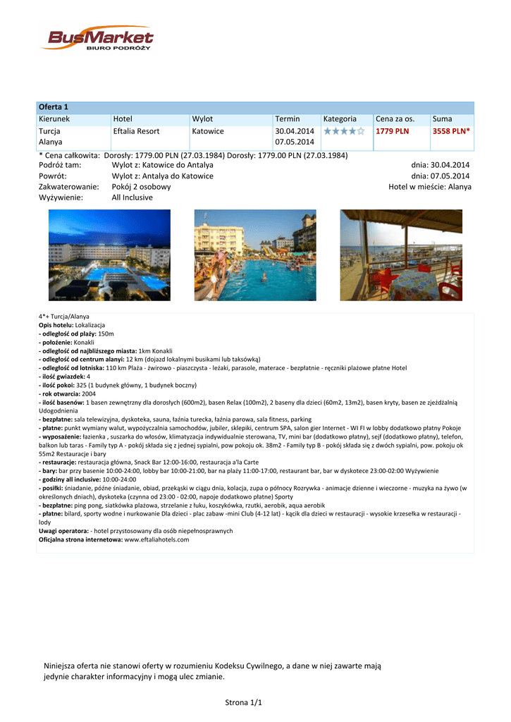 Oferta 1 Kierunek Turcja Alanya Hotel Eftalia Resort Wylot Katowice Termin 30.04.2014 07.05.2014 Kategoria Cena za os. 1779 PLN * Cena całkowita: Dorosły: 1779.00 PLN (27.03.1984) Dorosły: 1779.00 PLN (27.03.1984) Podróż tam: Wylot z: Katowice do Antalya Powrót: Wylot z: Antalya do Katowice Zakwaterowanie: Pokój 2 osobowy Wyżywienie: All Inclusive Suma 3558 PLN* dnia: 30.04.2014 dnia: 07.05.2014 Hotel w mieście: Alanya 4*+ Turcja/Alanya Opis hotelu: Lokalizacja - odległość od plaży: 150m - położenie: Konakli - odległość od najbliższego miasta: 1km Konakli - odległość od centrum alanyi: 12 km (dojazd lokalnymi busikami lub taksówką) - odległość od lotniska: 110 km Plaża - żwirowo - piaszczysta - leżaki, parasole, materace - bezpłatnie - ręczniki plażowe płatne Hotel - ilość gwiazdek: 4 - ilość pokoi: 325 (1 budynek główny, 1 budynek boczny) - rok otwarcia: 2004 - ilość basenów: 1 basen zewnętrzny dla dorosłych (600m2), basen Relax (100m2), 2 baseny dla dzieci (60m2, 13m2), basen kryty, basen ze zjeżdżalnią Udogodnienia - bezpłatne: sala telewizyjna, dyskoteka, sauna, łaźnia turecka, łaźnia parowa, sala fitness, parking - płatne: punkt wymiany walut, wypożyczalnia samochodów, jubiler, sklepiki, centrum SPA, salon gier Internet - WI FI w lobby dodatkowo płatny Pokoje - wyposażenie: łazienka , suszarka do włosów, klimatyzacja indywidualnie sterowana, TV, mini bar (dodatkowo płatny), sejf (dodatkowo płatny), telefon, balkon lub taras - Family typ A - pokój składa się z jednej sypialni, pow pokoju ok. 38m2 - Family typ B - pokój składa się z dwóch sypialni, pow. pokoju ok 55m2 Restauracje i bary - restauracje: restauracja główna, Snack Bar 12:00-16:00, restauracja a'la Carte - bary: bar przy basenie 10:00-24:00, lobby bar 10:00-21:00, bar na plaży 11:00-17:00, restaurant bar, bar w dyskotece 23:00-02:00 Wyżywienie - godziny all inclusive: 10:00-24:00 - posiłki: śniadanie, późne śniadanie, obiad, przekąski w ciągu dnia, kolacja, zupa o północy Rozrywka - animacje dzienne i wieczorne - muzyka na żywo (w określonych dniach), dyskoteka (czynna od 23:00 - 02:00, napoje dodatkowo płatne) Sporty - bezpłatne: ping pong, siatkówka plażowa, strzelanie z łuku, koszykówka, rzutki, aerobik, aqua aerobik - płatne: bilard, sporty wodne i nurkowanie Dla dzieci - plac zabaw -mini Club (4-12 lat) - kącik dla dzieci w restauracji - wysokie krzesełka w restauracji lody Uwagi operatora: - hotel przystosowany dla osób niepełnosprawnych Oficjalna strona internetowa: www.eftaliahotels.com Niniejsza oferta nie stanowi oferty w rozumieniu Kodeksu Cywilnego, a dane w niej zawarte mają jedynie charakter informacyjny i mogą ulec zmianie. Strona 1/1 Powered by TCPDF (www.tcpdf.org)
