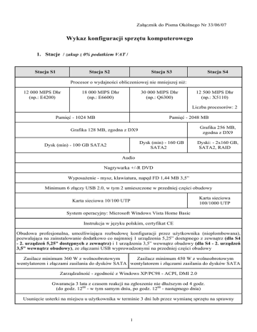 Załącznik do Pisma Okólnego Nr 33/06/07 Wykaz konfiguracji sprzętu komputerowego 1. Stacje / zakup z 0% podatkiem VAT / Stacja S1 Stacja S2 Stacja S3 Stacja S4 Procesor o wydajności obliczeniowej nie mniejszej niż: 12 000 MIPS Dhr (np.: E4200) 18 000 MIPS Dhr (np.: E6600) 30 000 MIPS Dhr (np.: Q6300) 12 500 MIPS Dhr (np.: X5110) Liczba procesorów: 2 Pamięć - 1024 MB Pamięć - 2048 MB Grafika 256 MB, zgodna z DX9 Grafika 128 MB, zgodna z DX9 Dysk (min) - 160 GB SATA2 Dysk (min) - 100 GB SATA2 Dyski: - 2x160 GB, SATA2, RAID Audio Nagrywarka +/-R DVD Wyposażenie - mysz, klawiatura, napęd FD 1,44 MB 3,5” Minimum 6 złączy USB 2.0, w tym 2 umieszczone w przedniej części obudowy Karta sieciowa 100/1000 UTP Karta sieciowa 10/100 UTP System operacyjny: Microsoft Windows Vista Home Basic Instrukcja w języku polskim, certyfikat CE Obudowa profesjonalna, umożliwiająca rozbudowę konfiguracji przez użytkownika (nieplombowana), pozwalająca na zainstalowanie dodatkowo co najmniej 1 urządzenia 5,25” dostępnego z zewnątrz (dla S4 - 2. urządzeń 5,25” dostępnych z zewnątrz) i 1 urządzenia 3,5” wewnątrz obudowy (dla S4 - 2. urządzeń 3,5” wewnątrz obudowy), ze złączami USB wyprowadzonymi na przedniej części obudowy Zasilacz minimum 360 W z wolnoobrotowym Zasilacz minimum 450 W z wolnoobrotowym wentylatorem i złączami zasilania do dysków SATA wentylatorem i złączami zasilania do dysków SATA Zarządzalność - zgodność z Windows XP/PC98 - ACPI, DMI 2.0 Gwarancja 3 lata z czasem reakcji na zgłoszenie nie dłuższym od 4 godz. (do godz. 1200 - w tym samym dniu, po godz. 1200 - następnego dnia) Usunięcie usterki na miejscu u użytkownika w terminie 3 dni lub przez wymianę sprzętu na sprawny 1 2. Serwery / zakup z 0% podatkiem VAT / Serwer V1 Serwer V2 Serwer V4 Procesor dwurdzeniowy o wydajności obliczeniowej nie mniejszej niż 15 000 MIPS Dhr, (np.: X5060), Liczba procesorów = 2 Procesor dwurdzeniowy o wydajności obliczeniowej nie mniejszej niż 30 000 MIPS Dhr, (np.: X5150), Liczba procesorów = 2 Procesor czterordzeniowy o wydajności obliczeniowej nie mniejszej niż 36 000 MIPS Dhr, (np.: XE5345), Liczba procesorów = 2 Pamięć - 2048 MB Obsługa kart interfejsu PCI 64b Grafika - 1024x768, 16b (minimum) Dyski - 2x160 GB SATA2 Dyski - 2x160 GB SATA2 oraz 2x73 GB SAS Nagrywarka +/-R DVD Karta sieciowa: 2x 10/100/1000 UTP Wyposażenie - mysz, klawiatura, napęd FD 1,44 MB 3,5” Serwer dostarczany jest bez systemu operacyjnego Instrukcja w języku polskim, certyfikat CE Zarządzalność - zgodność z Win 2003 Adv. Server (ACPI, DMI 2.0) Obudowa serwerowa, z możliwością instalacji dodatkowo co najmniej 2 urządzeń 5,25” dostępnych z zewnątrz i 3 urządzeń 3,5” wewnątrz obudowy Gwarancja 3 lata z czasem reakcji na zgłoszenie nie dłuższym od 4 godz. (do godz. 1200 - w tym samym dniu, po godz. 1200 - następnego dnia) Usunięcie usterki na miejscu u użytkownika w terminie 3 dni lub przez wymianę sprzętu na sprawny 2 3. Komputery przenośne / zakup z 22% podatkiem VAT / Komputer przenośny N1 Komputer przenośny N2 Komputer przenośny N3 Procesor o wydajności nie mniejszej niż: 10 000 MIPS Dhr (np.: T2300) 18 000 MIPS Dhr (np.: T7200) 8 000 MIPS Dhr, o niskim poborze mocy (np.: L2300) Pamięć - 1024 MB Ekran TFT 15” (proporcje 4:3) 12” Dysk (min) - 40 GB Dysk (min) - 60 GB USB 2.0 (2), VGA, InfraRed, Audio in/out, I/II PC Card slot USB 2.0 (3), 1394, serial, USB 2.0 (2), 1394, VGA, S-video out, VGA, InfraRed, InfraRed, Audio in/out, I/II PC Audio in/out, I/II PC Card slot Card slot Nagrywarka +/-R DVD wewnętrzna Nagrywarka +/-R DVD wewnętrzna Nagrywarka +/-R DVD Karta sieciowa wewnętrzna 10/100TP + modem wewnętrzny + 802.11b/g System operacyjny: Microsoft Windows Vista Home Basic Instrukcja w języku polskim, certyfikat CE Zarządzalność - zgodność z Windows XP (ACPI, DMI 2) Gwarancja 3 lata z czasem reakcji na zgłoszenie nie dłuższym od 4 godz. (do godz. 1200 - w tym samym dniu, po godz. 1200 - następnego dnia) Usunięcie usterki na miejscu u użytkownika w terminie 3 dni lub przez wymianę sprzętu na sprawny W wyżej podanych specyfikacjach „certyfikat CE” oznacza spełnienie warunków: • w zakresie emisji elektromagnetycznej: wymagana klasa B, zgodnie z PN 6100-6-3; • w zakresie odporności na zakłócenia elektromagnetyczne: wymagana (minimum) klasa C, zgodnie z PN 6100-6-1. 3 4. Monitory / zakup z 0% podatkiem VAT / Monitor M19 Monitor M21 Monitor CRT 19”, kolor - płaski ekran Monitor CRT 21”, kolor - płaski ekran Częstotliwość odchylania pionowego w trybie 1280x1024 nie mniejsza od 85 Hz Częstotliwość odchylania pionowego w trybie 1600x1200 nie mniejsza od 85 Hz Spełniający wymagania norm TCO, certyfikat CE 3 lata gwarancji Monitor LCD 17 Monitor LCD 17”, kolor Monitor LCD 19 Monitor LCD 19”, kolor Monitor LCD 21 Monitor LCD 21”, kolor Częstotliwość odchylania Częstotliwość odchylania Częstotliwość odchylania pionowego w trybie 1280x1024 pionowego w trybie 1280x1024 pionowego w trybie 1600x1200 nie mniejsza od 75 Hz nie mniejsza od 75 Hz nie mniejsza od 60 Hz Minimalny kąt widzenia w pionie i poziomie 160o Jasność minimum 300 cd/m2 Kontrast minimum 600:1 Spełniający wymagania norm TCO, certyfikat CE 3 lata gwarancji 5. Drukarki / zakup z 0% podatkiem VAT za wyjątkiem urządzeń wielofunkcyjnych / Należy podać: - rodzaj urządzenia /np. drukarka laserowa, atramentowa, igłowa lub urządzenie wielofunkcyjne/, - wymagane podstawowe parametry techniczne /np. format papieru, szybkość druku, wydajność, rozdzielczość, interfejs/. Można przykładowo podać typ drukarki spełniającej wymagane parametry. U W A G A: Zgodnie z treścią art. 83 ust. 1 pkt. 26 ustawy z dnia 11 marca 2004 r. o podatku od towarów i usług (Dz.U. Nr 54, poz. 535, z późn. zm.) dla placówek oświatowych stosuje się stawkę podatku VAT w wysokości 0% do dostaw sprzętu komputerowego wymi