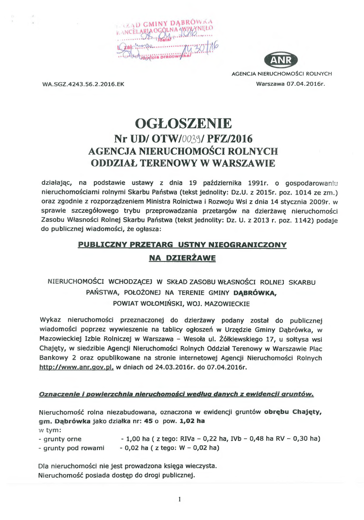 OTW/002A/ PFZ/2016 AGENCJA NIERUCHOMOŚCI ROLNYCH