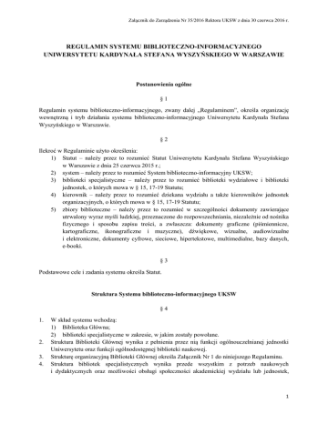 Załącznik do Zarządzenia Nr 35/2016 Rektora UKSW z dnia 30 czerwca 2016 r. REGULAMIN SYSTEMU BIBLIOTECZNO-INFORMACYJNEGO UNIWERSYTETU KARDYNAŁA STEFANA WYSZYŃSKIEGO W WARSZAWIE Postanowienia ogólne §1 Regulamin systemu biblioteczno-informacyjnego, zwany dalej „Regulaminem”, określa organizację wewnętrzną i tryb działania systemu biblioteczno-informacyjnego Uniwersytetu Kardynała Stefana Wyszyńskiego w Warszawie. §2 Ilekroć w Regulaminie użyto określenia: 1) Statut – należy przez to rozumieć Statut Uniwersytetu Kardynała Stefana Wyszyńskiego w Warszawie z dnia 25 czerwca 2015 r.; 2) system – należy przez to rozumieć System biblioteczno-informacyjny UKSW; 3) biblioteki specjalistyczne – należy przez to rozumieć biblioteki wydziałowe i biblioteki jednostek, o których mowa w § 15, 17-19 Statutu; 4) kierownik – należy przez to rozumieć dziekana wydziału a także kierowników jednostek organizacyjnych, o których mowa w § 15, 17-19 Statutu; 5) zbiory biblioteczne – należy przez to rozumieć w szczególności dokumenty zawierające utrwalony wyraz myśli ludzkiej, przeznaczone do rozpowszechniania, niezależnie od nośnika fizycznego i sposobu zapisu treści, a zwłaszcza: dokumenty graficzne (piśmiennicze, kartograficzne, ikonograficzne i muzyczne), dźwiękowe, wizualne, audiowizualne i elektroniczne, dokumenty cyfrowe, sieciowe, hipertekstowe, multimedialne, bazy danych, e-booki. §3 Podstawowe cele i zadania systemu określa Statut. Struktura Systemu biblioteczno-informacyjnego UKSW §4 1. 2. 3. 4. W skład systemu wchodzą: 1) Biblioteka Główna; 2) biblioteki specjalistyczne w zakresie, w jakim zostały powołane. Struktura Biblioteki Głównej wynika z pełnienia przez nią funkcji ogólnouczelnianej jednostki Uniwersytetu oraz funkcji ogólnodostępnej biblioteki naukowej. Strukturę organizacyjną Biblioteki Głównej określa Załącznik Nr 1 do niniejszego Regulaminu. Struktura bibliotek specjalistycznych wynika przede wszystkim z potrzeb naukowych i dydaktycznych oraz możliwości obsługi społeczności akademickiej wydziału lub jednostek, 1 Załącznik do Zarządzenia Nr 35/2016 Rektora UKSW z dnia 30 czerwca 2016 r. o których mowa w § 15, 17-19 Statutu. Strukturę bibliotek specjalistycznych określają ich regulaminy. §5 1. 2. Biblioteka Główna działa na podstawie przepisów prawa powszechnie obowiązującego, Statutu i Regulaminu organizacyjnego Biblioteki Głównej UKSW, stanowiącego Załącznik nr 1 do niniejszego Regulaminu. Biblioteki specjalistyczne działają na podstawie przepisów prawa powszechnie obowiązującego, Statutu i własnych regulaminów, wydanych na podstawie Regulaminu wzorcowego bibliotek specjalistycznych systemu biblioteczno-informacyjnego UKSW, stanowiącego Załącznik Nr 2 do niniejszego Regulaminu. Powoływanie, przekształcanie i likwidowanie jednostek Systemu biblioteczno-informacyjnego UKSW §6 1. 2. 3. 4. Biblioteka wydziałowa jest powoływana, przekształcana i likwidowana w drodze zarządzenia Rektora, na wniosek kierownika, po uprzednim zaopiniowaniu przez radę wydziału oraz dyrektora Biblioteki Głównej i radę biblioteczną, na podstawie uzasadnionych potrzeb dydaktycznych i naukowych wydziału. Biblioteki jednostek, o których mowa w § 15, 17-19 Statutu, są powoływane, przekształcane i likwidowane w drodze zarządzenia Rektora, na wniosek kierownika tej jednostki, po uprzednim zaopiniowaniu przez radę tej jednostki oraz dyrektora Biblioteki Głównej i radę biblioteczną. Warunkiem powstania biblioteki specjalistycznej jest zapewnienie jej odpowiednich warunków lokalowych, wyposażenia i środków na zatrudnienie wykwalifikowanego personelu bibliotecznego. Rektor może powołać bibliotekę wspólną dla dwóch lub więcej wydziałów zgodnie ze Statutem. Zarządzanie i nadzór nad Systemem biblioteczno-informacyjnym UKSW §7 1. 2. 3. Systemem zarządza dyrektor Biblioteki Głównej. Tryb zatrudniania dyrektora Biblioteki Głównej i jego zastępcy oraz zadania dyrektora Biblioteki Głównej określa Statut. Kierownik zarządza bibliotekami specjalistycznymi w zakresie spraw organizacyjnych, finansowych oraz w zakresie spraw pracowniczych określonych w niniejszym Regulaminie. §8 Dyrektor Biblioteki Głównej może powoływać zespoły doradcze i zadaniowe wspomagające proces funkcjonowania systemu spośród wszystkich pracowników tego systemu. 2 Załącznik do Zarządzenia Nr 35/2016 Rektora UKSW z dnia 30 czerwca 2016 r. §9 1. 2. 3. Nadzór nad systemem sprawuje prorektor właściwy ds. biblioteki. Nadzór nad bibliotekami specjalistycznymi w zakresie merytorycznym (bibliotekarskim) sprawuje dyrektor Biblioteki Głównej, a nad sprawami organizacyjnymi i finansowymi sprawuje kierownik. Organem opiniodawczym Rektora w zakresie funkcjonowania systemu jest rada biblioteczna działająca na podstawie Statutu i przepisów wydanych na jego podstawie. § 10 Dokumentację dotyczącą organizacji i funkcjonowania systemu oraz poszczególnych jego jednostek organizacyjnych niepochodzącą od dyrektora Biblioteki Głównej przekazuje się do sekretariatu dyrektora Biblioteki Głównej. Zarządzanie zbiorami bibliotecznymi § 11 Biblioteka Główna oraz biblioteki specjalistyczne gromadzą zbiory biblioteczne uwzględniając i wspierając przede wszystkim potrzeby naukowe, dydaktyczne i kulturalne Uniwersytetu, z uwzględnieniem możliwości finansowych, lokalowych i kadrowych bibliotek. § 12 1. 2. 3. Zakupu zbiorów bibliotecznych prowadzonych w Uniwersytecie dokonuje Biblioteka Główna oraz biblioteki specjalistyczne zgodnie z misją i strategią Uniwersytetu oraz misją i strategią systemu z uwzględnieniem aktów prawa wewnętrznego UKSW oraz przepisów prawa powszechnie obowiązującego dotyczących zamówień publicznych. Dyrektor Biblioteki Głównej podpisuje porozumienia z kierownikami wydziałów nieposiadających własnych bibliotek, dotyczące polityki kształtowa