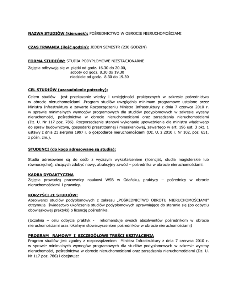 NAZWA STUDIÓW (kierunek): POŚREDNICTWO W OBROCIE NIERUCHOMOŚCIAMI CZAS TRWANIA (ilość godzin): JEDEN SEMESTR (230 GODZIN) FORMA STUDIÓW: STUDIA PODYPLOMOWE NIESTACJONARNE Zajęcia odbywają się w piątki od godz. 16.30 do 20.00, soboty od godz. 8.30 do 19.30 niedziele od godz. 8.30 do 19.30 CEL STUDIÓW (uzasadnienie potrzeby): Celem studiów jest przekazanie wiedzy i umiejętności praktycznych w zakresie pośrednictwa w obrocie nieruchomościami .Program studiów uwzględnia minimum programowe ustalone przez Ministra Infrastruktury a zawarte Rozporządzeniu Ministra Infrastruktury z dnia 7 czerwca 2010 r. w sprawie minimalnych wymogów programowych dla studiów podyplomowych w zakresie wyceny nieruchomości, pośrednictwa w obrocie nieruchomościami oraz zarządzania nieruchomościami (Dz. U. Nr 117 poz. 786). Rozporządzenie stanowi wykonanie upoważnienia dla ministra właściwego do spraw budownictwa, gospodarki przestrzennej i mieszkaniowej, zawartego w art. 196 ust. 3 pkt. 1 ustawy z dnia 21 sierpnia 1997 r. o gospodarce nieruchomościami (Dz. U. z 2010 r. Nr 102, poz. 651, z późn. zm.). STUDENCI (do kogo adresowane są studia): Studia adresowane są do osób z wyższym wykształceniem (licencjat, studia magisterskie lub równorzędne), chcących zdobyć nowy, atrakcyjny zawód – pośrednika w obrocie nieruchomościami. KADRA DYDAKTYCZNA Zajęcia prowadzą pracownicy naukowi WSB w Gdańsku, praktycy – pośrednicy w obrocie nieruchomościami i prawnicy. KORZYŚCI ZE STUDIÓW: Absolwenci studiów podyplomowych z zakresu „POŚREDNICTWO OBROTU NIERUCHOMOŚCIAMI” otrzymują świadectwo ukończenia studiów podyplomowych uprawniające do starania się (po odbyciu obowiązkowej praktyki) o licencję pośrednika. (Uczelnia – celu odbycia praktyk - rekomenduje swoich absolwentów pośrednikom w obrocie nieruchomościami oraz lokalnym stowarzyszeniom pośredników w obrocie nieruchomościami) PROGRAM RAMOWY I SZCZEGÓŁOWE TREŚCI KSZTAŁCENIA Program studiów jest zgodny z rozporządzeniem Ministra Infrastruktury z dnia 7 czerwca 2010 r. w sprawie minimalnych wymogów programowych dla studiów podyplomowych w zakresie wyceny nieruchomości, pośrednictwa w obrocie nieruchomościami oraz zarządzania nieruchomościami (Dz. U. Nr 117 poz. 786) i obejmuje: PROGRAM RAMOWY: Forma Zal. Forma zajęć Sem. Przedmiot (liczba godzin) W G S R Doradztwo na rynku nieruchomości 4 4 Z Ekonomiczne podstawy rynku nieruchomościami 8 8 Z Eksploatacja nieruchomości 6 6 Z Elementy finansów i bankowości 6 6 Z Gospodarka mieszkaniowa i prawo spółdzielcze 10 10 Z Gospodarka nieruchomościami 12 12 Z Gospodarka przestrzenna 6 6 Z Gospodarka rolna, leśna, wodna 4 4 Z Notariusz w obrocie nieruchomościami 6 6 Z Ocena ekonomicznej efektywności inwestycji 4 4 Z Ochrona danych osobowych 2 2 Z Organizacje zawodowe pośredników w obrocie nieruchomościami 2 2 Z Podatki i opłaty związane z nieruchomościami 4 4 Z 10 10 Z Podstawy ekonomii 6 6 Z Podstawy marketingu i psychologii. Sztuka argumentacji 4 4 Z Podstawy prawa cywilnego 8 8 Z Podstawy prawa i postępowania administracyjnego 4 4 Z Podstawy prawa rzeczowego 12 12 Z Podstawy prawa zobowiązań Podstawy budownictwa 1 Ć 8 8 Z Prawne i ekonomiczne podstawy bezpieczeństwa obrotu nieruchomościami 14 14 Z Procedury w obrocie nieruchomościami 20 20 Z Proces inwestycyjny w budownictwie 4 4 Z Przegląd technologii w budownictwie 6 6 Z Rzeczoznawstwo majątkowe 4 4 Z Standardy zawodowe i etyka zawodowa pośrednika w obrocie nieruchomościami 2 2 Z Status prawny pośrednika w obrocie nieruchomościami 4 4 Z Umowy pośrednictwa w obrocie nieruchomościami 6 6 Z Wprowadzenie do problematyki obrotu nieruchomościami 2 2 Z Współpraca pośrednika w obrocie nieruchomościami z instytucjami finansowymi i bankami 6 6 Z Wybrane zagadnienia z zakresu prawa rodzinnego i spadkowego 4 4 Z Zabezpieczenia finansowe i prawne w obrocie nieruchomościami 4 4 Z Zamówienia publiczne 4 4 Z Zarządzanie nieruchomościami - wybrane zagadnienia 4 4 Z Źródła informacji o nieruchomościach 10 10 Z Seminarium dyplomowe 10 10 E RAZEM W SEMESTRZE 1 230 0 0 0 230 RAZEM 230 0 0 0 230 WARUNKI PRZYJĘCIA: 1. ukończone studia wyższe, 2. o przyjęciu decyduje kolejność zgłoszeń (studia zostaną uruchomione przy min. 25 osobach), 3. złożenie kompletu dokumentów, 4. wniesienie stosownych opłat WYSOKOŚĆ OPŁAT: 1. wpisowe – 50 zł; 2. czesne – 2850 zł (możliwość wnoszenia opłat w dwóch ratach); 3. opłata egzaminacyjna – 150 zł; WARUNKI UKOŃCZENIA STUDIÓW: 1. uzyskanie zaliczeń z przedmiotów; 2. uzyskanie pozytywnej ceny z egzaminu końcowego; 3. Uregulowanie opłat za studia, o których mowa w Regulaminie Studiów Podyplomowych § 5, ust. 2 oraz w umowie;