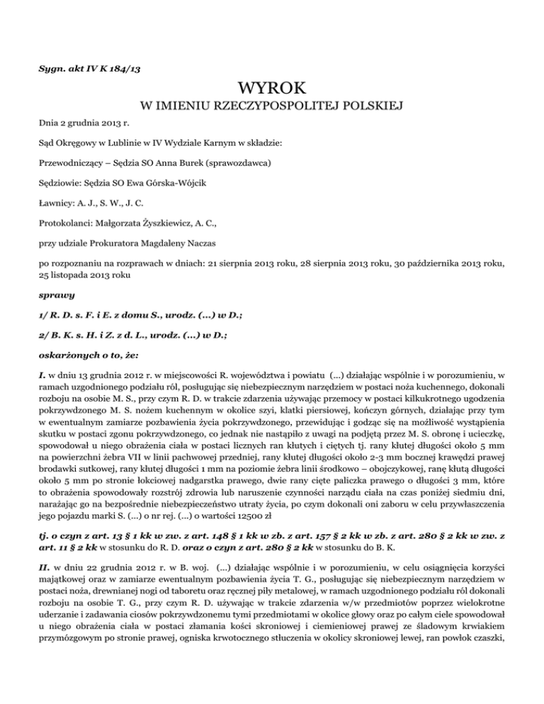 Sygn. akt IV K 184/13 WYROK W IMIENIU RZECZYPOSPOLITEJ POLSKIEJ Dnia 2 grudnia 2013 r. Sąd Okręgowy w Lublinie w IV Wydziale Karnym w składzie: Przewodniczący – Sędzia SO Anna Burek (sprawozdawca) Sędziowie: Sędzia SO Ewa Górska-Wójcik Ławnicy: A. J., S. W., J. C. Protokolanci: Małgorzata Żyszkiewicz, A. C., przy udziale Prokuratora Magdaleny Naczas po rozpoznaniu na rozprawach w dniach: 21 sierpnia 2013 roku, 28 sierpnia 2013 roku, 30 października 2013 roku, 25 listopada 2013 roku sprawy 1/ R. D. s. F. i E. z domu S., urodz. (...) w D.; 2/ B. K. s. H. i Z. z d. L., urodz. (...) w D.; oskarżonych o to, że: I. w dniu 13 grudnia 2012 r. w miejscowości R. województwa i powiatu (...) działając wspólnie i w porozumieniu, w ramach uzgodnionego podziału ról, posługując się niebezpiecznym narzędziem w postaci noża kuchennego, dokonali rozboju na osobie M. S., przy czym R. D. w trakcie zdarzenia używając przemocy w postaci kilkukrotnego ugodzenia pokrzywdzonego M. S. nożem kuchennym w okolice szyi, klatki piersiowej, kończyn górnych, działając przy tym w ewentualnym zamiarze pozbawienia życia pokrzywdzonego, przewidując i godząc się na możliwość wystąpienia skutku w postaci zgonu pokrzywdzonego, co jednak nie nastąpiło z uwagi na podjętą przez M. S. obronę i ucieczkę, spowodował u niego obrażenia ciała w postaci licznych ran kłutych i ciętych tj. rany kłutej długości około 5 mm na powierzchni żebra VII w linii pachwowej przedniej, rany kłutej długości około 2-3 mm bocznej krawędzi prawej brodawki sutkowej, rany kłutej długości 1 mm na poziomie żebra linii środkowo – obojczykowej, ranę kłutą długości około 5 mm po stronie łokciowej nadgarstka prawego, dwie rany cięte paliczka prawego o długości 3 mm, które to obrażenia spowodowały rozstrój zdrowia lub naruszenie czynności narządu ciała na czas poniżej siedmiu dni, narażając go na bezpośrednie niebezpieczeństwo utraty życia, po czym dokonali oni zaboru w celu przywłaszczenia jego pojazdu marki S. (...) o nr rej. (...) o wartości 12500 zł tj. o czyn z art. 13 § 1 kk w zw. z art. 148 § 1 kk w zb. z art. 157 § 2 kk w zb. z art. 280 § 2 kk w zw. z art. 11 § 2 kk w stosunku do R. D. oraz o czyn z art. 280 § 2 kk w stosunku do B. K. II. w dniu 22 grudnia 2012 r. w B. woj. (...) działając wspólnie i w porozumieniu, w celu osiągnięcia korzyści majątkowej oraz w zamiarze ewentualnym pozbawienia życia T. G., posługując się niebezpiecznym narzędziem w postaci noża, drewnianej nogi od taboretu oraz ręcznej piły metalowej, w ramach uzgodnionego podziału ról dokonali rozboju na osobie T. G., przy czym R. D. używając w trakcie zdarzenia w/w przedmiotów poprzez wielokrotne uderzanie i zadawania ciosów pokrzywdzonemu tymi przedmiotami w okolice głowy oraz po całym ciele spowodował u niego obrażenia ciała w postaci złamania kości skroniowej i ciemieniowej prawej ze śladowym krwiakiem przymózgowym po stronie prawej, ogniska krwotocznego stłuczenia w okolicy skroniowej lewej, ran powłok czaszki, stłuczenia tkanek miękkich powłok z krwiakiem podczepcowym po stronie prawej, pojedynczego ogniska stłuczenia w miąższu płucnym, złamania podstaw paliczków palców II, III, IV i V ręki lewej, skutkujących rozstrojem zdrowia i naruszeniem narządów ciała na czas powyżej dni siedmiu, narażając go na bezpośrednie niebezpieczeństwo utraty życia, po czym po uprzednim związaniu kończyn górnych i dolnych elektrycznym przewodem, przeszukali jego odzież i dokonali zaboru w celu przywłaszczenia mienia w postaci telefonu komórkowego marki N. (...) o wartości 200 zł, pieniędzy w łącznej kwocie 570 zł, portfela o wartości 50 zł wraz z zawartością dokumentów w postaci dowodu osobistego, prawa jazdy, legitymacji rencisty i dowodu rejestracyjnego, kluczy do samochodu i kluczy do mieszkania oraz zaboru pojazdu marki F. (...) o nr rej. (...) o wartości 5000 zł, powodując tym samym łączne straty w wysokości 5820 zł, po czym pozostawili pokrzywdzonego związanego i nieprzytomnego w stanie uniemożliwiającym wezwanie pomocy, w niskiej temperaturze otoczenia, przy czym możliwość wystąpienia skutku w postaci zgonu pokrzywdzonego przewidywali i na to się godzili, co jednak nie nastąpiło z uwagi na udzieloną pokrzywdzonemu pomoc tj. o czyn z art. 13 § 1 kk w zw. z art. 148 § 1 kk w zb. z art. 157 § 1 kk w zb. z art. 280 § 2 kk w zb. z art. 275 § 1 kk w zb. z art. 276 kk w zw. z art. 11 § 2 kk w stosunku do R. D. oraz o czyn z art. 13 § 1 kk w zw. z art. 148 § 1 kk w zb. z art. 280 § 2 kk w zb. z art. 275 § 1 kk w zb. z art. 276 kk w zw. z art. 11 § 2 kk w stosunku do B. K.; III. w okresie czasu od dnia 16 grudnia 2012 r. do dnia 22 grudnia 2012 r. w B. woj. (...) działając wspólnie i w porozumieniu, w krótkich odstępach czasu i w wykonaniu z góry powziętego zamiaru po uprzednim wyważeniu okna piwnicznego dostali się do wnętrza domu jednorodzinnego, skąd zabrali w celu przywłaszczenia 10 litrów spirytusu oraz drobnych artykułów spożywczych w postaci herbaty, weków o łącznej wartości 300 zł, stołu kuchennego wartości 150 zł, sedesu wartości 200 zł oraz uszkodzenia mienia w postaci farelki na kwotę 50 zł i okna na kwotę 50 zł, powodując łączne straty w wysokości 1050 zł na szkodę T. G. i R. G. tj. o czyn z art. 279 § 1 kk w zb. z art. 288 § 1 kk w zw. z art. 11 § 2 kk w zw. z art. 12 kk. R. D. i B. K. uznaje za winnych tego, że: I. w dniu 13 grudnia 2012 r. w miejscowości R. woj. (...) działając wspólnie i w porozumieniu w celu osiągnięcia korzyści majątkowej w ramach ustalonego podziału ról, posługując się nożem dokonali rozboju na osobie M. S. w ten sposób, że R. D. użył przemocy wobec pokrzywdzonego przykładając mu ostrze noża w okolice szyi, a następnie ugodził go kilka razy w okolice klatki piersiowej i kończyn górnych powodując obrażenia