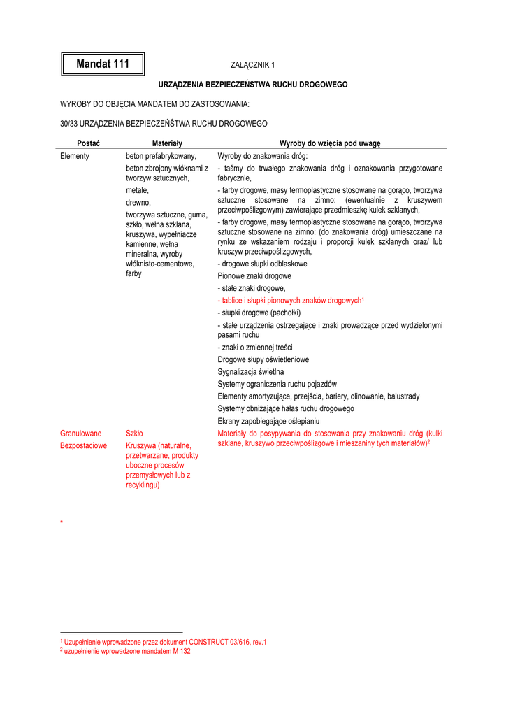 Mandat 111 ZAŁĄCZNIK 1 URZĄDZENIA BEZPIECZEŃSTWA RUCHU DROGOWEGO WYROBY DO OBJĘCIA MANDATEM DO ZASTOSOWANIA: 30/33 URZĄDZENIA BEZPIECZEŃŚTWA RUCHU DROGOWEGO Postać Elementy Materiały beton prefabrykowany, beton zbrojony włóknami z tworzyw sztucznych, metale, drewno, tworzywa sztuczne, guma, szkło, wełna szklana, kruszywa, wypełniacze kamienne, wełna mineralna, wyroby włóknisto-cementowe, farby Granulowane Bezpostaciowe Szkło Kruszywa (naturalne, przetwarzane, produkty uboczne procesów przemysłowych lub z recyklingu) Wyroby do wzięcia pod uwagę Wyroby do znakowania dróg: - taśmy do trwałego znakowania dróg i oznakowania przygotowane fabrycznie, - farby drogowe, masy termoplastyczne stosowane na gorąco, tworzywa sztuczne stosowane na zimno: (ewentualnie z kruszywem przeciwpoślizgowym) zawierające przedmieszkę kulek szklanych, - farby drogowe, masy termoplastyczne stosowane na gorąco, tworzywa sztuczne stosowane na zimno: (do znakowania dróg) umieszczane na rynku ze wskazaniem rodzaju i proporcji kulek szklanych oraz/ lub kruszyw przeciwpoślizgowych, - drogowe słupki odblaskowe Pionowe znaki drogowe - stałe znaki drogowe, - tablice i słupki pionowych znaków drogowych1 - słupki drogowe (pachołki) - stałe urządzenia ostrzegające i znaki prowadzące przed wydzielonymi pasami ruchu - znaki o zmiennej treści Drogowe słupy oświetleniowe Sygnalizacja świetlna Systemy ograniczenia ruchu pojazdów Elementy amortyzujące, przejścia, bariery, olinowanie, balustrady Systemy obniŜające hałas ruchu drogowego Ekrany zapobiegające oślepianiu Materiały do posypywania do stosowania przy znakowaniu dróg (kulki szklane, kruszywo przeciwpoślizgowe i mieszaniny tych materiałów)2 * 1 2 Uzupełnienie wprowadzone przez dokument CONSTRUCT 03/616, rev.1 uzupełnienie wprowadzone mandatem M 132 ZAŁĄCZNIK 2 TECHNICZNE WARUNKI ODNIESIENIA URZĄDZENIA BEZPIECZEŃSTWA RUCHU DROGOWEGO DO ZASTOSOWANIA: 30/33: URZĄDZENIA BEZPIECZEŃSTWA RUCHU DROGOWEGO Grupa i podgrupy URZĄDZENIA BEZPIECZEŃSTWA RUCHU DROGOWEGO: WYPOSAśENIE DRÓG Wyroby do znakowania dróg: - taśmy do trwałego znakowania dróg i oznakowania przygotowane fabrycznie, - farby drogowe, masy termoplastyczne stosowane na gorąco, tworzywa sztuczne stosowane na zimno: (ewentualnie z kruszywem przeciwpoślizgowym) zawierające przedmieszkę kulek szklanych, - farby drogowe, masy termoplastyczne stosowane na gorąco, tworzywa sztuczne stosowane na zimno: (do znakowania dróg) umieszczane na rynku ze wskazaniem rodzaju i proporcji kulek szklanych oraz/ lub kruszyw przeciwpoślizgowych, - drogowe słupki odblaskowe. Pionowe znaki drogowe - stałe znaki drogowe, - słupki drogowe (pachołki) - stałe urządzenia ostrzegające i znaki prowadzące przed wydzielonymi pasami ruchu - znaki o zmiennej treści Drogowe słupy oświetleniowe Sygnalizacja świetlna Systemy ograniczenia ruchu pojazdów Elementy amortyzujące, przejścia, bariery, olinowanie, balustrady Systemy obniŜające hałas ruchu drogowego Ekrany zapobiegające oślepianiu A – WYROBY DO ZNAKOWANIA DRÓG Wyroby do znakowania dróg: - taśmy do trwałego znakowania dróg i oznakowania przygotowane fabrycznie, - farby drogowe, masy termoplastyczne stosowane na gorąco, tworzywa sztuczne stosowane na zimno: (ewentualnie z kruszywem przeciwpoślizgowym) zawierające przedmieszkę kulek szklanych, - farby drogowe, masy termoplastyczne stosowane na gorąco, tworzywa sztuczne stosowane na zimno: (do znakowania dróg) umieszczane na rynku ze wskazaniem rodzaju i proporcji kulek szklanych oraz/ lub kruszyw przeciwpoślizgowych, - drogowe słupki odblaskowe. WP 1 2 3 4 5 CECHY - własności przeciwpoślizgowe - cechy dotyczące widzialności: Luminancja Odblaskowość Współrzędne trójchromatyczne TRWAŁOŚĆ TAK 6 Grupa i podgrupy Materiały do posypywania do stosowania przy znakowaniu dróg (kulki szklane, kruszywo przeciwpoślizgowe i mieszaniny tych materiałów)3 Materiały do posypywania farb, tworzyw termoplastycznych, tworzyw sztucznych utwardzanych na zimno i do posypywania wszelkich innych wyrobów do znakowania dróg stosowanych w stanie płynnym, zaraz po ich naniesieniu na powierzchnię drogi. Cechy do objęcia normą zharmonizowaną WP 1 2 3 4 CECHY TRWAŁOŚĆ Widzialność (np. odpowiednio współczynnik załamania, współczynnik luminancji, współrzędne barw, okrągłość i przezroczystość i in.) Granulometria Odporność na rozdrabnianie (kruchość) TAK (odpowiednio na działanie wody, chemikaliów chemikaliów inne) 5 6 B – PIONOWE ZNAKI DROGOWE i URZĄDZENIA KONTROLI RUCHU Stałe znaki drogowe, słupki krawędziowe, słupki prowadzące, sygnalizacja świetlna i lampy stałe, stałe urządzenia ostrzegające i znaki prowadzące przed wydzielonymi pasami ruchu, stałe znaki drogowe dla ruchu kołowego i pieszego o zmiennej treści B1 Okładziny tablic stałych znaków drogowych z zastosowaniem kulek szklanych4 WP 1 2 3 4 CECHY - właściwości przy uderzeniu - cechy dotyczące widzialności: Luminancja Odblaskowość Współrzędne trójchromatyczne TRWAŁOŚĆ TAK 5 6 B2. Słupki stałych znaków drogowych. WP 1 2 3 4 CECHY - odporność na obciąŜenia poziome 5 6 3 4 Uzupełnienia wprowadzone przez mandat M 132 Uzupełnienia wprowadzone przez dokument CONSTRUCT 03/616 Rev.1 TRWAŁOŚĆ TAK B3 – ZłoŜone znaki drogowe (zawierające [podłoŜe plus okładzinę tablicy5] lub [podłoŜe plus okładzinę tablicy* plus słupki do pionowych znaków plus zamocowania]), słupki krawędziowe, słupki prowadzące, sygnalizacja świetlna i lampy stałe, stałe urządzenia ostrzegające i znaki prowadzące przed wydzielonymi pasami ruchu, stałe znaki drogowe dla ruchu kołowego i pieszego o zmiennej treści WP CECHY TRWAŁOŚĆ 1 2 3 4 - odporność na obciąŜenia poziome - właściwości przy uderzeniu TAK - cechy dotyczące widzialności: Luminancja Odblaskowość (jeŜeli jest wymagana) Współrzędne trójchromatyczne 5 6 C 