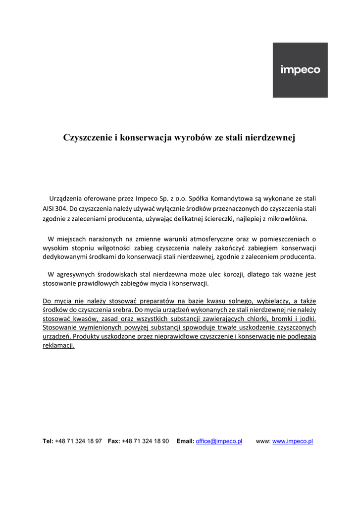Czyszczenie i konserwacja wyrobów ze stali nierdzewnej Urządzenia oferowane przez Impeco Sp. z o.o. Spółka Komandytowa są wykonane ze stali AISI 304. Do czyszczenia należy używać wyłącznie środków przeznaczonych do czyszczenia stali zgodnie z zaleceniami producenta, używając delikatnej ściereczki, najlepiej z mikrowłókna. W miejscach narażonych na zmienne warunki atmosferyczne oraz w pomieszczeniach o wysokim stopniu wilgotności zabieg czyszczenia należy zakończyć zabiegiem konserwacji dedykowanymi środkami do konserwacji stali nierdzewnej, zgodnie z zaleceniem producenta. W agresywnych środowiskach stal nierdzewna może ulec korozji, dlatego tak ważne jest stosowanie prawidłowych zabiegów mycia i konserwacji. Do mycia nie należy stosować preparatów na bazie kwasu solnego, wybielaczy, a także środków do czyszczenia srebra. Do mycia urządzeń wykonanych ze stali nierdzewnej nie należy stosować kwasów, zasad oraz wszystkich substancji zawierających chlorki, bromki i jodki. Stosowanie wymienionych powyżej substancji spowoduje trwałe uszkodzenie czyszczonych urządzeń. Produkty uszkodzone przez nieprawidłowe czyszczenie i konserwację nie podlegają reklamacji. Tel: +48 71 324 18 97 Fax: +48 71 324 18 90 Email: [email protected] www: www.impeco.pl