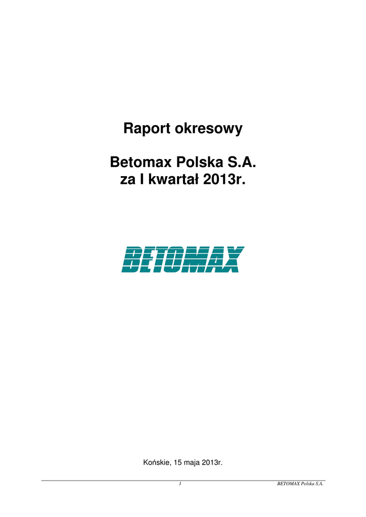 Raport okresowy Betomax Polska S.A. za I kwartał 2013r. Końskie, 15 maja 2013r. 1 BETOMAX Polska S.A. 1. PODSTAWOWE DANE O SPÓŁCE Nazwa (firma): Nazwa skrócona: Adres siedziby: Telefon: Faks: Adres strony internetowej: Adres poczty elektronicznej: NIP REGON KRS Organ prowadzący rejestr Podstawowy przedmiot działalności Czas trwania działalności jednostki Okres objęty raportem Zarządu Spółki Rada Nadzorcza BETOMAX POLSKA SPÓŁKA AKCYJNA BETOMAX Polska S.A. ul. Górna 2a, 26-200 Końskie (41) 375 13 47 (41) 375 13 48 www.betomax.pl [email protected] 658-17-00-296 290997907 0000342237 Sąd Rejonowy w Kielcach, X Wydział Gospodarczy Krajowego Rejestru Sądowego PKD 46.73.Z - Sprzedaż hurtowa drewna, materiałów budowlanych i wyposażenia sanitarnego, PKD 42.13.Z - Roboty związane z budową mostów i tuneli, PKD 42.99.Z - Roboty związane z budową pozostałych obiektów inżynierii lądowej i wodnej, gdzie indziej niesklasyfikowane, PKD 42.11.Z - Roboty związane z budową dróg i autostrad, PKD 42.91.Z - Roboty związane z budową obiektów inżynierii wodnej, PKD 77.32.Z - Wynajem i dzierżawa maszyn i urządzeń budowlanych, PKD 77.39.Z - Wynajem i dzierżawa pozostałych maszyn, urządzeń oraz dóbr materialnych, gdzie indziej niesklasyfikowane, PKD 71.12.Z - Działalność w zakresie inżynierii i związane z nią doradztwo techniczne, nieograniczony 01 stycznia 2013r. do 31 marca 2013r. - Grzegorz Muszyński - Prezes Zarządu - Paweł Kamiński - Członek Zarządu - Piotr Kurczyński - Członek Zarządu - Lech Pasturczak - Przewodniczący - Stanisław Juliusz Pargieła - Wiceprzewodniczący - Artur Mączyński - Wiceprzewodniczący - Andrzej Piotr Pargieła - Sekretarz - Wolfgang Scheurer - Członek - Konrad Kosierkiewicz - Członek - Sławomir Kamiński - Członek 2. CHARAKTERYSTYKA DZIAŁALNOŚCI SPÓŁKI BETOMAX POLSKA S.A. Betomax Polska S.A. to średniej wielkości przedsiębiorstwo (zatrudnia ok. 100 pracowników). Spółka koncentruje się na nowoczesnych technologiach dla budownictwa. 2 BETOMAX Polska S.A. Głównym przedmiotem działalności jest obecnie działalność handlowa. Drugim obszarem jest działalność usługowa w zakresie robót budowlano-montażowych oraz wynajmu sprzętu budowlanego, a także produkcja własna, która ma być rozwijana poprzez zakup przedsiębiorstwa produkcyjnego, który sfinansowany zostanie ze środków pozyskanych z oferty publicznej akcji serii C. Betomax koncentruje się na dostarczaniu produktów o większym zaawansowaniu technologicznym, stosowanych w szeroko pojętym budownictwie (m.in. energetyka, ochrona środowiska, budownictwo kubaturowe, infrastruktura), poprawiających bezpieczeństwo pracowników oraz mających za zadanie przyspieszyć realizację inwestycji. Spółka oferuje dodatkowo doradztwo technologiczne, wsparcie projektowe i obsługę serwisową. W celu zapewnienia kompleksowości oferty, znajdują się w niej również podstawowe produkty, znajdujące zastosowanie niemal na każdej budowie, tak aby móc oferować szeroki asortyment wyrobów. Jest to ważne w przypadku klientów, którzy na swoich budowach chcą korzystać z ograniczonej liczby dostawców. Spółka stara się elastycznie zmieniać ofertę w zależności od sytuacji na rynku. Produkty Na chwilę obecną oferta produktów jest niewielka i obejmuje: Systemy zbrojenia skręcanego BARTEC, używany do wykonywania bezpośrednio na budowie połączeń i zakotwień prętów zbrojeniowych w elementach żelbetowych i ma na celu zapewnienie pełnej nośności łączonych prętów. W systemie wykorzystuje się metodę spęczania końcówek prętów, co ma na celu zachowanie nominalnej średnicy prętów zbrojeniowych w miejscu łączenia. System zabezpieczeń na krawędzi SECUMAX przeznaczony do wykonywania czasowych zabezpieczeń na krawędziach budowli, chroniących ludzi przed upadkiem z wysokości. Łączniki balkonowe EBEA KP, służące do izolacji styków pomiędzy zewnętrznymi elementami żelbetowymi a stropem lub ścianami wewnętrznymi. Łączniki eliminują powstanie mostków cieplnych (miejsca o dużym przewodnictwie ciepła, co przekłada się na obniżenie temperatury wewnątrz budynku oraz powstawanie zawilgoceń i zagrzybień), dzięki czemu obniżają zużycie kosztów ogrzewania. Dystrybucja W zakresie dostarczania technologii i materiałów budowlanych Betomax oferuje m.in: Systemy zbrojenia odginanego COMAX stosowane do wykonywania uciąglenia zbrojenia w miejscach gdzie powstają przerwy robocze i różnego rodzaju dobetonowania. Materiały do uszczelnień konstrukcji betonowych narażonych na działanie wód powierzchniowych, gruntowych, a także pod ciśnieniem hydrostatycznym. Systemy dylatacyjne, które po zabudowie w złączu budowlanym stanowią zabezpieczenie szczelin dylatacyjnych w podłogach, ścianach, stropach oraz na dachach. Umożliwiają one ruchy konstrukcji pod wpływem zmian temperatur, skurczu elementów betonowych czy różnic osiadań pomiędzy poszczególnymi elementami budowlanymi. Łożyska mostowe mające na celu przenoszenie obciążeń pionowych oraz obrotów i przesuwów konstrukcji nośnych. Podkładki i łożyska elastomerowe, wykorzystywane odpowiednio do realizacji połączeń i ograniczenia rozchodzenia się drgań i dźwięków w budynkach oraz jako ogniwo przeciwwibracyjne pochłaniające obciążenia i przemieszczenia pomiędzy elementami konstrukcji. Akcesoria i sprzęt szalunkowy. Akcesoria i produkty do prefabrykacji. 3 BETOMAX Polska S.A. Sprzęt budowlany do transportu wewnętrznego, w tym pojemniki na beton, gruz, ziemię i materiały sypkie, pojemniki na beton z pomostem roboczym, kosze do transportu osobowego oraz podesty rozładunkowe. Usługi Dzierżawa sprzętu BHP tj. systemu zabezpieczeń na krawędzi SECUMAX, SECUMAX Individual i systemu antyupadkowego. Dzierżawa sprzętu budowlanego w tym wózków montażowych wykorzystywanych przy pracach mostowych, podestów rozładunkowych