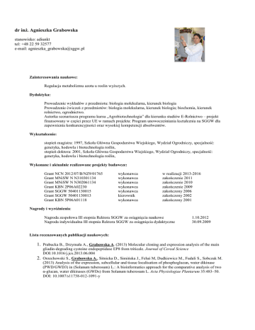 dr inż. Agnieszka Grabowska stanowisko: adiunkt tel: +48 22 59 32577 e-mail: [email protected] Zainteresowania naukowe: Regulacja metabolizmu azotu u roslin wyższych. Dydaktyka: Prowadzenie wykładów z przedmiotu: biologia molekularna, kierunek biologia Prowadzenie ćwiczeń z przedmiotów: biologia molekularna, kierunek biologia; biochemia, kierunek rolnictwo, ogrodnictwo. Autorka scenariusza programu kursu „Agrobiotechnologia” dla kierunku studiów E-Rolnictwo – projekt finansowany w części przez UE w ramach projektu: Program unowocześniania kształcenia na SGGW dla zapewnienia konkurencyjności oraz wysokiej kompetencji absolwentów. Wykształcenie: stopień magistra: 1997, Szkoła Główna Gospodarstwa Wiejskiego, Wydział Ogrodniczy, specjalność: genetyka, hodowla i biotechnologia roślin, stopień doktora: 2001, Szkoła Główna Gospodarstwa Wiejskiego, Wydział Ogrodniczy, specjalność: genetyka, hodowla i biotechnologia roślin, Wykonane i aktualnie realizowane projekty badawcze: Grant NCN 2012/07/B/NZ9/01765 Grant MNiSW N N310301134 Grant MNiSW N N302061134 Grant KBN 2P06A02230 Grant SGGW 50401130015 Grant SGGW 50401130013 Grant KBN 5P06A01118 wykonawca wykonawca wykonawca wykonawca wykonawca kierownik wykonawca w realizacji 2013-2016 zakończenie 2011 zakończenie 2010 zakończenie 2009 zakończony 2006 zakończony 2002 zakończony 2001 Nagrody i wyróżnienia: Nagroda zespołowa III stopnia Rektora SGGW za osiągnięcia naukowe Nagroda indywidualna III stopnia Rektora SGGW za osiągnięcia dydaktyczne 1.10.2012 30.09.2009 Lista recenzowanych publikacji naukowych: 1. Prabucka B., Drzymała A., Grabowska A. (2013) Molecular cloning and expression analysis of the main 2. gliadin-degrading cysteine endopeptidase EP8 from triticale. Journal of Cereal Science DOI:10.1016/j.jcs.2013.06.004 Orzechowski S., Grabowska A., Sitnicka D., Simińska J., Feluś M, Dudkiewicz M., Fudali S., Sobczak M. (2013) Analysis of the expression, subcellular and tissue localisation of phosphoglucan, water dikinase (PWD/GWD3) in (Solanum tuberosum) L.: A bioinformatics approach for the comparative analysis of two α-glucan, water dikinases (GWDs) from Solanum tuberosum L. Acta Physiologiae Plantarum 35:483–50. DOI: 10.1007/s11738-012-1091-y 3. Grabowska A, Kwinta J, Bielawski W. (2012) Glutamine synthetase and glutamate dehydrogenase in triticale seeds: molecular cloning and genes expression. Acta Physiologiae Plantarum 34: 2393-2406. DOI: 10.1007/s11738-012-1085-9 4. Szawłowska U,. Grabowska A, Zdunek-Zastocka E., Bielawski W. (2012) TsPAP1 encodes a novel plant prolyl aminopeptidase whose expression is induced in response to suboptimal growth conditions. Biochemical and Biophysical Research Communications 419: 104-109. DOI: 10.1016/j.bbrc.2012.01.140 5. Wiśniewska A, Grabowska A, Pietraszewska-Bogiel A, Tagashira N, Zuzga S, Wóycicki R, Przybecki Z, Malepszy S, Filipecki M. (2012) Identification of genes up-regulated during somatic embryogenesis of cucumber. Plant Physiology et Biochemistry 50:54-64. doi:10.1016/j.plaphy.2011.09.017 6. Grabowska A, Nowicki M, Kwinta J. (2011) Glutamate dehydrogenase of the germinating triticale seeds: gene expression, activity distribution and kinetic characteristics. Acta Physiologiae Plantarum 33:19811990. doi:10.1007/s11738-011-0801-1 7. Grabowska A, Wisniewska A, Tagashira N, Malepszy S, Filipecki M. (2009) Characterization of CsSEF1 gene encoding putative CCCH-type zinc finger protein expressed during cucumber somatic embryogenesis. Journal of Plant Physiology 166; 310-323. DOI:10.1016/j.jplph.2008.06.005 8. Linkiewicz A., Filipecki M., Tomczak A., Grabowska A., Malepszy S. (2004). The cloning of sequences differentially transcribed during the induction of somatic embryogenesis in cucumber (Cucumis sativus L.). Cellular and Molecular Biology Letters 9B, 795-804. 9. Grabowska A., Filipecki M. (2004). The infiltration with Agrobacterium – the method for stable transformation avoiding tissue culture. Acta Physiologiae Plantarum 26, 451-458. 10. Grabowska A., Filipecki M., Linkiewicz A. (2001) Genetyczna regulacja embriogenezy u roślin. Postępy Biologii Komórki; Tom 28; Nr 4; 509-527 11. Rakoczy-Trojanowska M., Kwaśniak A., Malepszy. (1997) Czynniki wpływające na żywotność, nabrzmiewanie oraz pierwsze podziały mikrospor żyta ozimego (Secale cereale L.). Zeszyty Naukowe Akademii Rolniczej im. H. Kołłątaja w Krakowie nr 31: 317-320 12. Rakoczy-Trojanowska M., Kwaśniak A., Malepszy S. (1996) Factors influening viability and sporophytic development in vitro of rye (Secale cereale L.) microspores. Vortraege fuer Pflanzenzuechtung 35: 256-257 Lista doniesień konferencyjnych: 1. Grabowska A., Kwinta J. Cloning, molecular characterization and expression analysis of glutamine 2. 3. 4. 5. 6. 7. synthetase type I gene from triticale. Acta Biocheimica Polonica vol. 59 suppl. 3, P6.7, Konferencja Polskiego Towarzystwa Biochemicznego (PTB), Poznań, 11-14 wrzesień 2012; Grabowska A., Kwinta J. Physiological and molecular analysis of glutamate dehydrogenase in germinating triticale kernels. Acta Biologica Cracoviensia vol. 51 suppl. 2, 1.31, Konferencja Polskiego Towarzystwa Biologii Eksperymentalnej Roślin (PTBER), Kraków, 21-25 wrzesień 2009; Prabucka B., Drzymała A., Grabowska A. Molecular cloning and expression analysis of main gliadindegradation cysteine endopeptidase EP8 fram triticale (x Triticosecale Wittm.) Acta Biologica Cracoviensia vol. 51 suppl. 2, 1.11 Konferencja Polskiego Towarzystwa Biologii Eksperymentalnej Roślin (PTBER), Kraków, 21-25 wrzesień 2009; Orzechowski S, Simińska J, Grabowska A, Sobczak M. Analysis of expression and tissue localisation of phosphoglucan:water dikinase (PWD) in Solanum tuberosum L.. Acta Bioch Pol Suppl, 2008, 55/3: 213, XLIII Zjazd Polskiego Towarzystwa Biochemicznego, Olsztyn 7-11 wrzesień 2008; Grabowska A, Samojedny D, Simińska J, Dudkiewicz M, Orzechowski S. Cloning and sequence analysi
