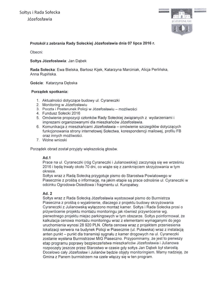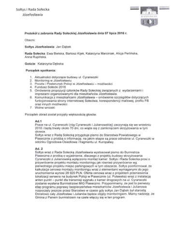 Protokół z zebrania Rady Sołeckiej Józefosławia dnia 07 lipca 2016 r.