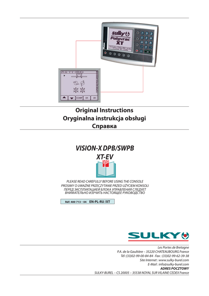 Original Instructions Oryginalna instrukcja obsługi Справка VISION-X DPB/SWPB XT-EV PLEASE READ CAREFULLY BEFORE USING THE CONSOLE PROSIMY O UWAŻNE PRZECZYTANIE PRZED UŻYCIEM KONSOLI ПЕРЕД ЭКСПЛУАТАЦИЕЙ БЛОКА УПРАВЛЕНИЯ СЛЕДУЕТ ВНИМАТЕЛЬНО ИЗУЧИТЬ НАСТОЯЩЕЕ РУКОВОДСТВО Réf: 400 713 - 04 EN-PL-RU /XT Les Portes de Bretagne P.A. de la Gaultière – 35220 CHATEAUBOURG France Tél :(33)02-99-00-84-84 · Fax : (33)02-99-62-39-38 Site Internet : www.sulky-burel.com E-Mail : [email protected] ADRES POCZTOWY SULKY-BUREL – CS 20005 – 35538 NOYAL SUR VILAINE CEDEX France Safety instructions Zalecenia dotyczące bezpieczeństwa Требования техники безопасности EN • Follow the instructions contained in this manual. • Follow the Spreader User Manual recommendations. • Never leave the driver’s position whilst the tractor is running. • Carry out Spreader adjustments with the tractor stopped. • Make sure no one is near the machine before calibrating the VISION. Risk of accident Risk of damage to the machine Operating tip Do not throw the unit away - These symbols are used in these instructions every time recommendations are provided concerning your safety, the safety of others or the correct operation of the machine. - These recommendations must be given to all users of the machine. PL • Przestrzegać zaleceń zawartych w niniejszej instrukcji obsługi. • Przestrzegać zaleceń zawartych w instrukcji obsługi rozsiewacza nawozów. • Nigdy nie opuszczać siedzenia w kabinie ciągnika podczas gdy ciągnik jest uruchomiony. • Ustawienia rozsiewacza nawozów należy przeprowadzać, gdy ciągnik znajduje się w pozycji postojowej. • Upewnić się, czy w pobliżu nie ma żadnej osoby przed rozpoczęciem ustawienia i kalibracji konsoli VISION. Ryzyko wypadku Ryzyko uszkodzenia maszyny Ułatwienie pracy. Nie wyrzucać urządzenia do śmieci. - W niniejszej instrukcji obsługi użyto powyższych symboli za każdym razem, gdy opisane zalecenia dotyczą Państwa bezpieczeństwa jak i osoby postronnej lub działania samej maszyny - Wszelkie zalecenia należy przekazać każdemu użytkownikowi maszyny. RU • Соблюдайте требования настоящего руководства. • Соблюдайте требования соответствующего руководства пользователя разбрасывателя. • Не покидайте кабину управления во время движения трактора. • Все регулировки разбрасывателя следует выполнять при остановленном тракторе. • При выполнении калибровок консоли VISION убедитесь, что окружающие не создают машине помех. Риск несчастного случая Риск повреждения машины Рекомендации по эксплуатации Не выбрасывать блок - Эти символы в данном описании используются каждый раз, когда даются соответствующие рекомендации по вашей технике безопасности, технике безопасности других лиц или нормальной работе машины. - Эти рекомендации должны быть также доведены до другого персонала, использующего эту машину. 2 English Pages 6-9 10-11 12-13 14-15 16-17 PRESENTATION • A Description of the 18-23 • F Description of functions for the machine with AUGER BOOMS VISION DPB/SWPB system • B Tractor interface connections 24-29 • G Description of functions for the • C Installation of the speed sensor machine with GRANULE DISCS 30-35 • H Description of functions for the • D VISION console control unit • E Selecting the spreading system machine with WET BULK DISCS Pages PROGRAMMING 36-47 • A Drive rate calibration 48-65 • B SWPB static weighing calibration 66-77 • C Setting the flow rate 78-83 • D Selecting the fertilizer and using the application rate reducer 84-87 • E Selecting the working width Pages 122-123 124-125 126-127 Pages 128-143 144-147 148-149 150-151 153 CONTENTS 88-89 90-91 92-95 96-113 114-119 •F •G •H •I •J Tribord 3D function Rate adjustment function Filling the hopper ECONOV function “RTS” FERTITEST import functions 120-121 • K Additional functions QUICK START-UP • English • Polish • Russian INFORMATION • A Saving data • B Automatic “GPS” adjustment • C Diagnosis • D Maintenance • E Problems/Solutions 1 2 3 4 Read the operator’s manual carefully before use. Understanding your electronic unitwill help you make better use of it. For English instructions, follow this symbol : EN 3 Polski Strony OPIS 6-9 • A Opis systemu VISION DPB/ SWPB 10-11 • B Podłączenie do ciągnika 12-13 • C Instalacja czujnika prędkości 14-15 • D Konsola obsługowa VISION 16-17 • E Wybór układu rozsiewającego Strony PROGRAMOWANIE 36-47 • A Kalibracja prędkości jazdy 48-65 • B SWPB - statyczna kalibracja dawki (próba kręcona) 66-77 • C Ustawienie dawki rozsiewu 78-83 • D Wybór nawozu i obsługa reduktora wydatku 84-87 • E Ustawienie szerokości pracy Strony 122-123 124-125 126-127 Strony 128-143 144-147 148-149 150-151 153 SPIS TREŚCI 18-23 • F Opis funkcji dla maszyny z belką do środków pylistych 24-29 • G Opis funkcji dla maszyny z zestawem do granulatów 30-35 • H Opis funkcji dla maszyny z zestawem do rozsiewu nawozów luzem, wilgotnych 88-89 90-91 92-95 96-113 114-119 •F •G •H •I •J Siew graniczny Tribord 3D Zmienne dawkowanie Napełnianie zbiornika Funkcja ECONOV Importowanie danych “RTS” FERTITEST 120-121 • K Dodatkow