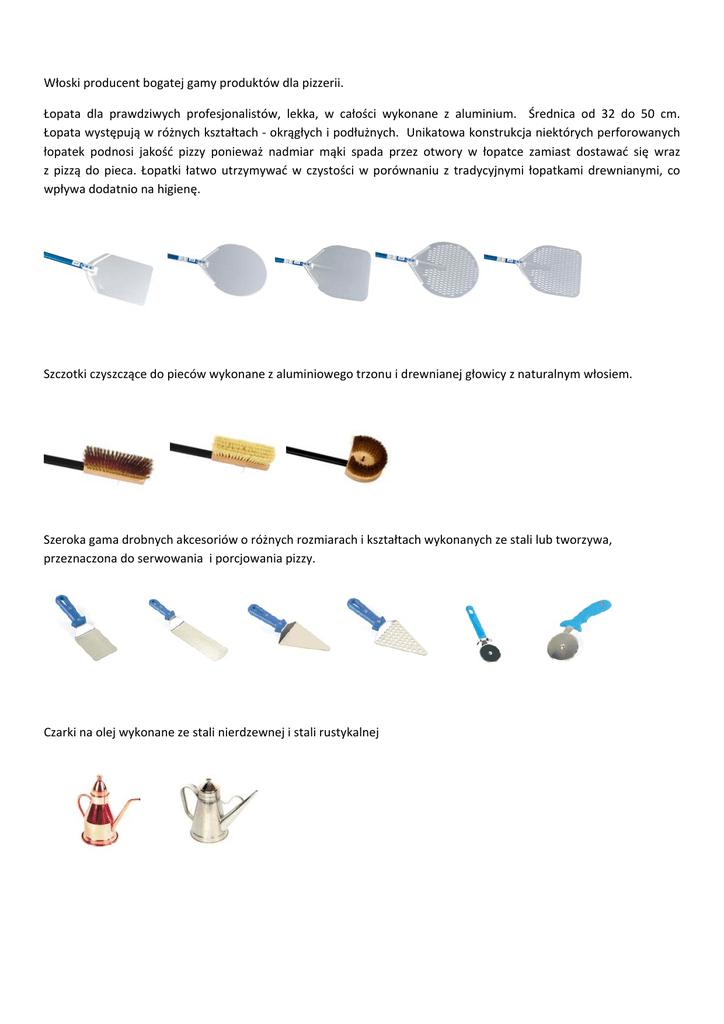 Włoski producent bogatej gamy produktów dla pizzerii. Łopata dla prawdziwych profesjonalistów, lekka, w całości wykonane z aluminium. Średnica od 32 do 50 cm. Łopata występują w różnych kształtach ‐ okrągłych i podłużnych. Unikatowa konstrukcja niektórych perforowanych łopatek podnosi jakość pizzy ponieważ nadmiar mąki spada przez otwory w łopatce zamiast dostawać się wraz z pizzą do pieca. Łopatki łatwo utrzymywać w czystości w porównaniu z tradycyjnymi łopatkami drewnianymi, co wpływa dodatnio na higienę. Szczotki czyszczące do pieców wykonane z aluminiowego trzonu i drewnianej głowicy z naturalnym włosiem. Szeroka gama drobnych akcesoriów o różnych rozmiarach i kształtach wykonanych ze stali lub tworzywa, przeznaczona do serwowania i porcjowania pizzy. Czarki na olej wykonane ze stali nierdzewnej i stali rustykalnej Gotowe zestawy Torby termoizolacyjne przeznaczone do transportowania pizzy‐ szeroka gama rozwiązań przystosowanych do różnych rozmiarów pizzy. Torby łatwe w utrzymaniu czystości wypełnione tworzywem pochłaniającym wibrację.