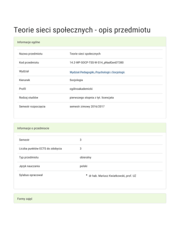 Teorie sieci społecznych - opis przedmiotu Informacje ogólne Nazwa przedmiotu Teorie sieci społecznych Kod przedmiotu 14.2-WP-SOCP-TSS-W-S14_pNadGenDT380 Wydział Wydział Pedagogiki, Psychologii i Socjologii Kierunek Socjologia Profil ogólnoakademicki Rodzaj studiów pierwszego stopnia z tyt. licencjata Semestr rozpoczęcia semestr zimowy 2016/2017 Informacje o przedmiocie Semestr 3 Liczba punktów ECTS do zdobycia 3 Typ przedmiotu obieralny Język nauczania polski Sylabus opracował Formy zajęć dr hab. Mariusz Kwiatkowski, prof. UZ Forma Liczba godzin w Liczba godzin w Liczba godzin w Liczba godzin w Forma zajęć semestrze tygodniu semestrze tygodniu zaliczenia (stacjonarne) (stacjonarne) (niestacjonarne) (niestacjonarne) 30 2 - - Wykład Egzamin Cel przedmiotu Zapoznanie uczestników z teoriami i pojęciami ułatwiającymi rozumienie współczesnego społeczeństwa jako społeczeństwa sieci. Głównym założeniem zajęć jest przekonanie, że współcześnie najważniejsze czynności we wszystkich sektorach życia społecznego opierają się na technologiach informacyjnych, są one zorganizowane w globalne sieci informacyjne i skupione wokół przetwarzania informacji (symboli). Celem zajęć jest poznanie zarówno koncepcji odnoszących się do sieci istniejących w przestrzeni wirtualnej jak i realnej, a także specyfiki zjawisk powstających na przecięciu wyróżnionych typów sieci (sieci hybrydowe). Zajęcia mają przygotować uczestników do podjęcia bardziej szczegółowych zagadnień związanych z metodami analizy sieciowej, technologiami informacyjnymi oraz animacją sieci społecznych. Wymagania wstępne Podstawowa wiedza z zakresu socjologii Zakres tematyczny 1. Rola sieci społecznych w życiu codziennym. Analiza i porównanie osobistych doświadczeń. 2. Współczesne społeczeństwo jako społeczeństwo sieci. Przegląd koncepcji i analiza danych. 3. Teorie sieci społecznych. Analiza podobieństw i różnic. 4. Sieciowe ujęcie kapitału społecznego. Teoria i zastosowanie. 5. Rola technologii w społeczeństwie sieci. Analiza stanu i dynamiki rozwoju w wybranych krajach. 6. Usieciowienie życia gospodarczego. Przejawy i konsekwencje. 7. Usieciowienie polityki. Przejawy i konsekwencje. 8. Usieciowienie ruchów społecznych. Przejawy i konsekwencje. 9. Fiński model społeczeństwa sieci. Charakterystyka i porównanie z innymi modelami. 10. Sieci terroru. Charakterystyka i wyjaśnienie trwałości zjawiska. 11. Sieci inkluzji. Sieci społeczne a problem wykluczenia społecznego. Metody kształcenia Podstawową metodą jest wykład konwersatoryjny składający się trzech części. W pierwszej części wykładowca przedstawia określoną koncepcję, w drugiej części uczestnicy interpretują wybrane zjawiska w świetle przedstawionej koncepcji, natomiast w trzeciej części prowadzona jest dyskusja dotycząca możliwości jej zastosowania w wyjaśnianiu określonych zjawisk i procesów. Efekty kształcenia i metody weryfikacji osiągania efektów kształcenia Opis efektu Posiada wiedzę na temat teorii dotyczących Symbole efektów K_W04 sieci społecznych. Metody weryfikacji egzamin - ustny, Forma zajęć Wykład opisowy, testowy i inne Posiada wiedzę na temat relacji społecznych K_W10 egzamin - ustny, łączących jednostki, grupy i instytucje oraz na opisowy, testowy i temat powiązań pomiędzy nimi na zasadach inne Wykład sieciowych. Posiada wiedzę na temat transmisji norm i K_W21 reguł społecznych w sieciach społecznych. egzamin - ustny, Wykład opisowy, testowy i inne Posiada podstawową wiedzę na temat K_W23 egzamin - ustny, funkcjonowania sieci społecznych i przepływu opisowy, testowy i informacji w ich obrębie. inne Wykład Opis efektu Symbole efektów Potrafi formułować sądy w języku polskim i w K_U16 Metody weryfikacji aktywność w języku obcym na temat motywów ludzkiego trakcie zajęć działania w zakresie tworzenia inicjatyw egzamin - ustny, bazujących na sieciach społecznych. opisowy, testowy i Forma zajęć Wykład inne Potrafi argumentować stawiane tezy podczas K_K04 dyskusji prowadzonych w ramach zajęć. aktywność w Wykład trakcie zajęć Warunki zaliczenia Zaliczenie wykładu Forma zaliczenia wykładu Uwagi Zaliczenie na ocenę. Tak W formie pytań problemowych, otwartych. Egzamin pisemny. Minimalny próg wymagań uzyskanie 50% punktów z pracy pisemnej. Zakres materiału dotyczący egzaminu. Aktywność podczas zajęć. Zgodnie z przedstawionym na pierwszych zajęciach Sylabusem (wykład). Umiejętność argumentowania tez, podawania przykładów. Zasady uzyskania oceny Ocena z wykładu to średnia ważona z oceny z egzaminu pisemnego (90%) i ocena za końcowej z wykładu. aktywność podczas zajęć (10%). Ocena końcowa z przedmiotu* = ocena końcowa z wykładu. Obciążenie pracą Obciążenie pracą Studiastacjonarne Studia niestacjonarne (w godz.) (w godz.) Godziny kontaktowe (udział w zajęciach; konsultacjach; egzaminie, itp.) 50 - Samodzielna praca studenta (przygotowanie do: zajęć, kolokwium, 25 - Łącznie 75 - Punkty ECTS Studia Studia niestacjonarne egzaminu; studiowanie literatury przygotowanie: pracy pisemnej, projektu, prezentacji, raportu, wystąpienia; itp.) stacjonarne Zajęcia z udziałem nauczyciela akademickiego 2 - Zajęcia bez udziału nauczyciela akademickiego 1 - Łącznie 3 - Literatura podstawowa 1. Barney D., Społeczeństwo sieci, przeł. Marcin Fronia, Wydawnictwo Sic!, Warszawa 2008. 2. Castells M., Sieci oburzenia i nadziei. Ruchy społeczne w erze Internetu, Wydawnictwo Naukowe PWN, Warszawa 2013. 3. Castells M., Himanen P., Społeczeństwo informacyjne i państwo dobrobytu. Model fiński, przeł. Michał Penkala i Michał Sutowski, Wydawnictwo Krytyki Politycznej, Warszawa 2009.. 4. Christakis N., A., Fowler J., W sieci. Jak sieci społeczne kształtują nasze życie, Wydawnictwo „Smak Słowa”, Sopot 2011.. 5. Turner J. H., Struktura teorii socjologicznej. Wydanie nowe, Wyda