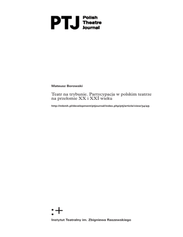 Mateusz Borowski Teatr na trybunie. Partycypacja w polskim teatrze na przełomie XX i XXI wieku http://mbmh.pl/development/ptjournal/index.php/ptj/article/view/34/49 Instytut Teatralny im. Zbigniewa Raszewskiego POLISH THEATRE JOURNAL 01/2015 01 Mateusz Borowski Teatr na trybunie. Partycypacja w polskim teatrze na przełomie XX i XXI wieku Z dzisiejszej perspektywy przełom XX i XXI wieku na polskich scenach instytucjonalnych uznać można za okres intensywnych transformacji i wprowadzanych z lepszym lub gorszym skutkiem reform na rozmaitych poziomach życia teatralnego. Jak mi się wydaje, część tych przemian pojawiła się w efekcie przejścia do nowego systemu ekonomiczno-politycznego na początku lat 90. XX wieku, które przyniosło ze sobą szereg nieznanych dotąd problemów i zjawisk typowych dla społeczeństw kapitalistycznych. Teatr nie wahał się ich podejmować, żeby zyskać aktualność i siłę społecznego oddziaływania. Wymagało to w pierwszej kolejności wprowadzenia nowych konwencji dramatycznych i scenicznych, wypróbowanych już wcześniej w teatrach europejskich. Oczekiwanych rozwiązań dramaturgicznych i teatralnych dostarczyły w drugiej połowie lat 90. przede wszystkim teksty brytyjskich i niemieckich brutalistów. Nie tylko były one wystawiane na polskich scenach, lecz młodym polskim dramatopisarzom i reżyserom posłużyły także jako wzorzec dla tworzenia rodzimych spektakli, podejmujących najbardziej palące problemy społeczne i kulturowe. Ta pierwsza fala przemian objęła głównie poziom rozwiązań estetycznych i strategii budowania świata przedstawionego, choć już wtedy twórcy teatralni mieli pełną świadomość, że gruntowna przemiana roli teatru nie jest możliwa bez głębokich modyfikacji samej instytucji teatralnej i zakresu jej zadań społecznych. W oczekiwaniu na te modyfikacje misja reformatorska w polskich teatrach ograniczała się do tworzenia okoliczności sprzyjających rozwojowi środowiska młodych twórców, którym oddawano do dyspozycji małe sceny w miejskich teatrach. Już wkrótce jednak okazało się, że same przemiany estetyki nie wystarczą, żeby scena stała się forum wymiany poglądów i obszarem istotnych interwencji obywatelskich w tkankę życia społecznego. Zmiana na lepsze oznaczała bowiem większą skuteczność w angażowaniu widzów w dialog na temat kwestii podstawowych dla narodowej czy lokalnej wspólnoty, a także przywrócenie wiary w teatr jako instytucję życia obywatelskiego. To zaś nie mogło się obyć bez wcześniejszego wykształcenia u widzów nowych nawyków odbiorczych. I nie chodziło tylko o osiągnięcie pożądanego efektu emocjonalnego zaangażowania, który wywoływały dramaty brutalistów i ich rodzime wersje, w typowo naturalistycznym stylu konfrontując widzów z tymi problemami, których nie chcieli dostrzegać w codziennym życiu. Nic zatem dziwnego, że w pierwszej dekadzie XXI wieku polski teatr zaczął usilnie poszukiwać takich sposobów angażowania widzów, które dawały im możliwość ingerencji w przebiegu POLISH THEATRE JOURNAL 01/2015 02 Mateusz Borowski / Teatr na trybunie... spektaklu, gdyż z artefaktu stać się on miał w założeniu wydarzeniem o społecznym i politycznym charakterze. Ostatnia dekada w polskim teatrze to – jak mi się wydaje – czas wprowadzania na rozmaite sposoby takich rozwiązań, które zostały wypróbowane wcześniej albo w teatrach offowych, albo w coraz bardziej popularnych formach perfomansu. Cel wszakże pozostał ten sam: skuteczne wezwanie widzów do współudziału w wydarzeniu teatralnym i skłonienie ich do tego, żeby jawnie okazywali swoje reakcje, albo przynajmniej pozwolili uczynić z nich integralną część przedstawienia. Aby to potwierdzić, dość przywołać spektakl H. (2004) Jana Klaty, rozgrywany w Stoczni Gdańskiej jako przedstawienie site-specific, z publicznością oprowadzaną w jego trakcie po terenie tego miejsca pamięci o najnowszej polskiej historii. Inną z kolei strategię wybrali twórcy Szybkiego Teatru Miejskiego, którzy pod auspicjami gdańskiego Teatru Wybrzeże przygotowywali w sezonie 2003/2004 dokumentalne przedstawienia w prywatnych mieszkaniach. Scenariusze do nich powstawały bowiem na podstawie rzeczywistych historii, które zbierali dziennikarze we współpracy z dramaturgami. Nawoływaniom do angażowania widzów uległy nawet tak tradycyjne instytucje artystyczne jak choćby Capella Cracoviensis, która zaczęła produkować reżyserowane przez Cezarego Tomaszewskiego koncerty muzyki poważnej w barze mlecznym (Bar. okowa uczta, 2012) czy w czasie spaceru po krakowskim Lasku Wolskim (Naturzyści, 2013). Wszystkie te przykłady świadczą o tym, że przez ostatnie dziesięć lat twórcy teatralni poszukiwali Świętego Graala partycypacji, przede wszystkim wychodząc z tradycyjnych sal teatralnych w przestrzeń publiczną, jakby na przekór doświadczeniom kontrkultury po raz kolejny uwierzyli w to, że sama zmiana relacji przestrzennych zachęci widzów do współdziałania i współtworzenia wydarzenia teatralnego. Rozpowszechnienie się strategii teatru offowego i parateatru na scenach instytucjonalnych wynikało, jak sądzę, z coraz bardziej powszechnego mniemania, że aktywizacja widzów stanowi nie tylko wartość samą w sobie, lecz także probierz skuteczności oddziaływania twórców teatralnych. Niezłomna wiara w wartość partycypacji stała się już wkrótce akceptowanym przez wszystkich założeniem, swoistym aksjomatem współczesnego teatru polskiego, który aspiruje bodaj do miana jednej z tych instytucji społecznych, które krzewią ideały demokratycznego społeczeństwa obywatelskiego. Zresztą, jeśli odpowiednio rozszerzy się perspektywę spojrzenia na współczesne procesy społeczne, to można zobaczyć wyraźnie, że nie tylko polski teatr uległ ostatnio nieodpartemu urokowi partycypacji. Temu urokowi nie potrafiły się również oprzeć inn