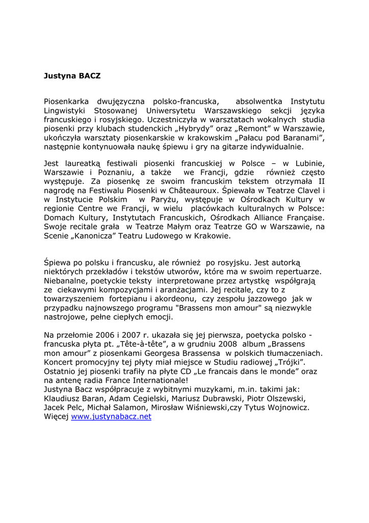 Justyna BACZ Piosenkarka dwujęzyczna polsko-francuska, absolwentka Instytutu Lingwistyki Stosowanej Uniwersytetu Warszawskiego sekcji języka francuskiego i rosyjskiego. Uczestniczyła w warsztatach wokalnych studia piosenki przy klubach studenckich „Hybrydy” oraz „Remont” w Warszawie, ukończyła warsztaty piosenkarskie w krakowskim „Pałacu pod Baranami”, następnie kontynuowała naukę śpiewu i gry na gitarze indywidualnie. Jest laureatką festiwali piosenki francuskiej w Polsce – w Lubinie, Warszawie i Poznaniu, a także we Francji, gdzie również często występuje. Za piosenkę ze swoim francuskim tekstem otrzymała II nagrodę na Festiwalu Piosenki w Châteauroux. Śpiewała w Teatrze Clavel i w Instytucie Polskim w Paryżu, występuje w Ośrodkach Kultury w regionie Centre we Francji, w wielu placówkach kulturalnych w Polsce: Domach Kultury, Instytutach Francuskich, Ośrodkach Alliance Française. Swoje recitale grała w Teatrze Małym oraz Teatrze GO w Warszawie, na Scenie „Kanonicza” Teatru Ludowego w Krakowie. Śpiewa po polsku i francusku, ale również po rosyjsku. Jest autorką niektórych przekładów i tekstów utworów, które ma w swoim repertuarze. Niebanalne, poetyckie teksty interpretowane przez artystkę współgrają ze ciekawymi kompozycjami i aranżacjami. Jej recitale, czy to z towarzyszeniem fortepianu i akordeonu, czy zespołu jazzowego jak w przypadku najnowszego programu "Brassens mon amour" są niezwykle nastrojowe, pełne ciepłych emocji. Na przełomie 2006 i 2007 r. ukazała się jej pierwsza, poetycka polsko francuska płyta pt. „Tête-à-tête”, a w grudniu 2008 album „Brassens mon amour” z piosenkami Georgesa Brassensa w polskich tłumaczeniach. Koncert promocyjny tej płyty miał miejsce w Studiu radiowej „Trójki”. Ostatnio jej piosenki trafiły na płyte CD „Le francais dans le monde” oraz na antenę radia France Internationale! Justyna Bacz współpracuje z wybitnymi muzykami, m.in. takimi jak: Klaudiusz Baran, Adam Cegielski, Mariusz Dubrawski, Piotr Olszewski, Jacek Pelc, Michał Salamon, Mirosław Wiśniewski,czy Tytus Wojnowicz. Więcej www.justynabacz.net