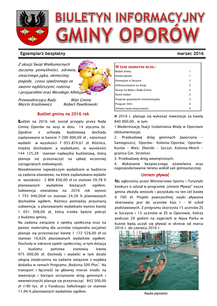 Egzemplarz bezpłatny marzec 2016 Z okazji Świąt Wielkanocnych życzymy pomyślności, zdrowia, smacznego jajka, słonecznej pogody, czasu spędzonego ze swoimi najbliższymi, rodziną i przyjaciółmi oraz Wesołego Alleluja Przewodniczący Rady Marcin Kraśkiewicz W tym numerze m.in.: Wójt Gminy Robert Pawlikowski Budżet gminy na 2016 rok Budżet Gminy 1 Umiem pływać 1 Gimnazjum w Szczycie 2 Dofinansowanie na drogi 2 Skargi na Wójta i Radę Gminy 2 Dzień kobiet 2 Program gospodarki niskoemisyjnej 3 Program 500+ 4 Zmiana nazw miejscowości 4 W 2016 r. planuje się wykonać inwestycje za kwotę Budżet na 2016 rok został przyjęty przez Radę 840 000,00 , w tym: Gminy Oporów na sesji w dniu 1.Modernizację Stacji Uzdatniania Wody w Oporowie Zgodnie z uchwałą 14 stycznia br. budżetową dochody (dokumentacja). zaplanowano w kwocie 7 200 000,00 zł , natomiast 2. wydatki Przebudowę dróg gminnych Jaworzyna – w wysokości 7 055.874,61 zł. Różnica, Samogoszcz; Oporów- Kolonia-Oporów; Oporów- między dochodami a wydatkami, w wysokości Kurów – Wieś; Złotniki – Szczyt; Kolonia–Mnich – 144 125,39 stanowi nadwyżkę budżetową, którą granica Gm. Strzelce). planuje przeznaczyć 3. Przebudowę dróg wewnętrznych. się na spłatę wcześniej zaciągniętych zobowiązań. Nieodmiennie największym wydatkiem w budżecie są zadania oświatowe, na które zaplanowano wydatki w wysokości 2 806 836,00 zł co stanowi 39,78 % planowanych Subwencja wydatków oświatowa na bieżących 2016 rok ogółem. wynosi 1 755 946,00zł co stanowi 24,39 % planowanych dochodów ogółem. Różnica pomiędzy przyznaną subwencją a planowanymi wydatkami wynosi kwotę 1 051 308,00 zł, którą trzeba będzie pokryć z budżetu gminy. Na zadania związane z opieką społeczną oraz na pomoc materialną dla uczniów (stypendia socjalne) 4. Wykonanie bezpiecznego oświetlenia oraz zagospodarowanie terenu wokół sali gimnastycznej Umiem pływać Na ogłoszony przez Ministerstwo Sportu i Turystyki konkurs o udział w programie „Umiem Pływać” nasza gmina złożyła wniosek i pozyskała na ten cel kwotę 6 700 zł. Projekt powszechnej nauki pływania skierowany jest do uczniów klas I – III szkół podstawowych. Z programu skorzysta 15 uczniów ZS w Szczycie i 15 uczniów w ZS w Oporowie, którzy podczas 20 godzin na zajęciach w Aqua Parku w Kutnie będą uczyli się pływać w okresie od marca 2016 r. do czerwca 2016 r. planuje się przeznaczyć kwotę 1 172 528,00 zł co stanowi 16,62% planowanych wydatków ogółem. Dochody w zakresie opieki społecznej, w tym dotacja z budżetu państwa stanowią kwotę 975 000,00 zł. Dochody i wydatki w tym dziale ulegną zwiększeniu na zadanie związane z wypłatą dodatku w ramach Programu „Rodzina 500 Plus”. Na transport i łączność (w głównej mierze środki na inwestycje i bieżące utrzymanie dróg gminnych i wewnętrznych) planuje się przeznaczyć 842 500,00 zł (190 tys. zł z Funduszu Sołeckiego) co stanowi 11,94 % planowanych wydatków ogółem. Nauka pływania Biuletyn Informacyjny Gminy Oporów Strona 2 Czy gmina otrzyma środki na drogę? Gimnazjum w Szczycie W dniu 14 stycznia 2016 r. Rada Gminy Oporów, Do Urzędu Marszałkowskiego w Łodzi został większością głosów, podjęła uchwałę o rozwiązaniu złożony wniosek o dofinansowanie zadania pn: Zespołu Szkół w Szczycie z dniem 31 sierpnia 2016 „Przebudowa oraz likwidacji Publicznego Gimnazjum w Szczycie z Skarżynek”. Do wykonania zaplanowano prace na dniem 31 sierpnia 2016 r. długości Rozstrzygnięciem nadzorczym z dnia 5 lutego 2016 Efektywność r. Wojewoda Łódzki stwierdził nieważność ww. uchwały ze względu na nie zachowanie procedur przy jej podejmowaniu (brak poinformowania wszystkich reprezentatywnych związków zawodowych tj. Forum Związków Zawodowych, nie nadanie uchwale rangi aktu miejscowego). Ze stanowiskiem Wojewody nie zgodziła się Rada Gminy i zaskarżyła ww. rozstrzygnięcie do Wojewódzkiego Sądu Administracyjnego w Łodzi. Teraz losy gimnazjum są w rękach sądu. Nie wiadomo jednak, kiedy sąd wyda wyrok i jaki on będzie. Na dzień dzisiejszy, do czasu prawomocnego wyroku, Gimnazjum będzie funkcjonowało. Oznacza to, że gmina nadal będzie musiała dokładać z budżetu gminy do zadań oświatowych ok. 1 000 000,00 zł (1 milion złotych) rocznie. a może jeszcze i więcej, jeżeli od 1 września 2016 r. do klas I szkół podstawowych przyjdzie tylko po 2 dzieci 7-letnich, a nie przyjdą dzieci 6-letnie. Były życzenia i kwiaty drogi gminnej 1,466km i zadania: Jaworzyna- szerokości 3,00m. przebudowywany ciąg komunikacyjny (odcinki dróg), który stanowi dojazd do: 46 działek ewidencyjnych, 93,44ha użytków rolnych i 13 siedlisk. Wartość robót przewidzianych do wykonania: 277 884,28 zł, w tym kwota wnioskowanych środków budżetu województwa: 166 730,56 zł Skargi na Wójta i Radę Gminy Do Wojewody Łódzkiego wpłynęły 2 skargi od przedstawicieli rodziców i mieszkańców obwodu Zespołu Szkół w Szczycie na Radę Gminy Oporów i Wójta Gminy zarzucające naruszenie prawa przy podejmowaniu uchwał dotyczących likwidacji Gimnazjum. Zgodnie z obowiązującymi przepisami skargę na radę gminy rozpatruje wojewoda, natomiast na wójta rada gminy. W dniu 24 lutego na komisjach radni rozpatrywali zarzuty zawarte w skargach pod adresem Wójta, a na sesji w dniu 26 lutego br. Rada Gminy jednogłośnie podjęła uchwałę stwierdzającą, że skargi na Wójta są nieuzasadnione. W uzasadnieniu W dniu 8 marca w Gminnej Publicznej Bibliotece w do uchwały odniesiono się do poszczególnych Oporowie tradycyjnie odbyło się spotkanie z okazji zarzutów. Skarżący zarzucali m.in. cyt. „Pisma Dnia Kobiet, którego uczestnikami byli członkowie z gminy dostarczane były przeważnie przez osoby tutejszego Koła Emerytów i Rencistów. Wszystkie zatrudnione w gminie w ramach robot publicznych”; Panie przybyłe 