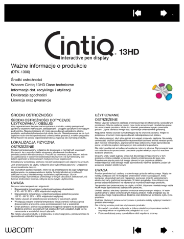 1 Ważne informacje o produkcie (DTK-1300) Środki ostrożności Wacom Cintiq 13HD Dane techniczne Informacje dot. recyklingu i utylizacji Deklaracje zgodności Licencja oraz gwarancje ŚRODKI OSTROŻNOŚCI ŚRODKI OSTROŻNOŚCI DOTYCZĄCE UŻYTKOWANIA I OBSŁUGI Aby zagwarantować bezpieczne korzystanie z produktu, należy postępować zgodnie z wszelkimi instrukcjami, ostrzeżeniami i uwagami zawartymi w niniejszym podręczniku. Nieprzestrzeganie ich może spowodować uszkodzenie ekranu produktu, uszkodzenie komputera lub utratę danych. Niezastosowanie się do tych zapisów może również spowodować unieważnienie gwarancji; w takim przypadku firma Wacom nie ponosi odpowiedzialności za naprawę lub wymianę produktu. LOKALIZACJA FIZYCZNA OSTRZEŻENIE Produkt jest przeznaczony wyłącznie do stosowania w normalnych warunkach biurowych, lecz może być także stosowany jako konsole środkowe w pomieszczeniach klimatyzowanych. Produkt był testowany przez Wacom jedynie do użytkowania w typowych środowiskach biurowych i nie był testowany pod kątem zgodności w środowiskach medycznych ani wojskowych. Interaktywny wyświetlacz piórkowy nie jest wodoodporny ani odporny na wybuch. Jest przeznaczony do użytku wyłącznie jako wyświetlacz pasywny i urządzenie do wprowadzania danych. We wszystkich zastosowaniach, które nie są przeznaczone do jego wyłącznego zastosowania, nie przeprowadzono testów funkcjonalności ani możliwych zakłóceń w pracy interaktywnego wyświetlacza piórkowego. Użycie interaktywnego wyświetlacza piórkowego w innych obszarach zastosowań, niż typowe środowisko biurowe, odbywa się na ryzyko użytkownika. UWAGA Dopuszczalna temperatura i wilgotność • Dopuszczalna temperatura i wilgotność podczas eksploatacji: 5 °C – 40 °C, 30% – 80% wilgotności względnej • Dopuszczalna temperatura i wilgotność podczas przechowywania: -20 °C – 60 °C, 30% – 90% wilgotności względnej Nie należy używać ani przechowywać produktu w warunkach, gdzie: • Występują znaczne wahania temperatury lub jej wartość wykracza poza dopuszczalne granice (np. poza pomieszczeniami lub w pojeździe). • Ekran piórkowy, piórko oraz podstawa mogą być narażone na bezpośrednie działanie promieni słonecznych lub ciepła od innych urządzeń, bądź też na zamoczenie w wodzie lub innych płynach. Nie należy używać produktu w środowisku o silnym zapyleniu, ponieważ może to spowodować uszkodzenie produktu. UŻYTKOWANIE OSTRZEŻENIE Należy używać wyłącznie zasilacza przeznaczonego do stosowania z posiadanym produktem. Użycie zasilacza innego typu może spowodować niewłaściwą pracę lub uszkodzenie produktu. Może ono również powodować ryzyko powstania pożaru. Użycie zasilacza innego typu spowoduje unieważnienie gwarancji. Regularnie należy usuwać kurz zbierający się na wtyczce zasilania. Wilgoć w połączeniu z kurzem może spowodować niebezpieczeństwo pożaru. Nie należy niszczyć, zbyt silnie zginać ani wiązać przewodu zasilania. Nie należy umieszczać ciężkich przedmiotów na przewodzie zasilania ani też narażać go na zbyt wysokie temperatury. Zignorowanie tego ostrzeżenia może spowodować pożar, porażenie prądem elektrycznym lub uszkodzenie produktu. Nie należy podłączać ani odłączać zasilacza mokrymi rękoma. Zignorowanie tego ostrzeżenia może spowodować porażenie prądem elektrycznym lub wadliwe działanie produktu. Do portu USB, wejść sygnału wideo lub dowolnego innego otworu w tym produkcie można wkładać wyłącznie obiekty przeznaczone do tego celu. Przedostanie się do portu lub innego otworu w tym produkcie obiektu metalowego lub ciała obcego może spowodować wadliwe działanie, pożar lub porażenie prądem elektrycznym. UWAGA Produkt powinien być zasilany z uziemionego gniazda elektrycznego. Nigdy nie należy podłączać ani nie rozłączać przewodów wideo i zasilających, kiedy komputer lub produkt jest pod napięciem, ponieważ grozi to uszkodzeniem ekranu lub karty graficznej komputera. W takim przypadku firma Wacom nie ponosi odpowiedzialności na naprawę lub wymianę wadliwego produktu. Ten produkt jest przeznaczony do użytku z HDMI. Używanie niewłaściwego kabla HDMI może spowodować uszkodzenie produktu. Umieść zasilacz sieciowy i produkt w dobrze wentylowanym miejscu. W razie użytkowania w słabo wentylowanym miejscu produkt może przegrzać się, co spowoduje niego nieprawidłowe działanie oraz dodatkowo skrócenie cyklu życia produktu. Podczas dłuższych przerw w korzystaniu z produktu należy wyłączyć zasilacz z gniazda sieciowego. Dla ochrony wzroku podczas użytkowania produktu: • Korzystać z produktu wyłącznie w dobrze oświetlonych pomieszczeniach, trzymając ekran w odpowiedniej odległości od oczu. • Podczas dłuższej pracy z produktem robić regularne przerwy. 1 2 Należy dbać o wyświetlacz LCD. Nie należy dociskać piórka do ekranu LCD z nadmierną siłą. Dociskanie piórka do ekranu z nadmierną siłą może spowodować czasowe pojawienie się na ekranie wzoru pasków (paski znikną po ustaniu nacisku piórka na ekran). Następujące warunki są charakterystyczne dla ekranów LCD i nie oznaczają uszkodzenia ani zakłóceń w działaniu produktu. • Zależnie od wyświetlanych treści, może występować nierównomierna jasność. • Zależnie od rodzaju wyświetlanych treści, może być widoczna niewielka liczba podświetlonych i niepodświetlonych czerwonych lub niebieskich punktów. • Przy wyświetlaniu obiektów o delikatnych wzorach obraz może migotać lub mogą być widoczne paski. • Po wyświetlaniu przez dłuższy czas tego samego nieruchomego obrazu mogą być widoczne pozostałości tego obrazu („duchy”). (te pozostałości obrazu znikną po pewnym czasie) • Stopniowe zużycie podświetlenia ekranu wraz z upływem czasu użytkowania będzie mieć wpływ na sposób wyświetlania obrazu. • Zależnie od