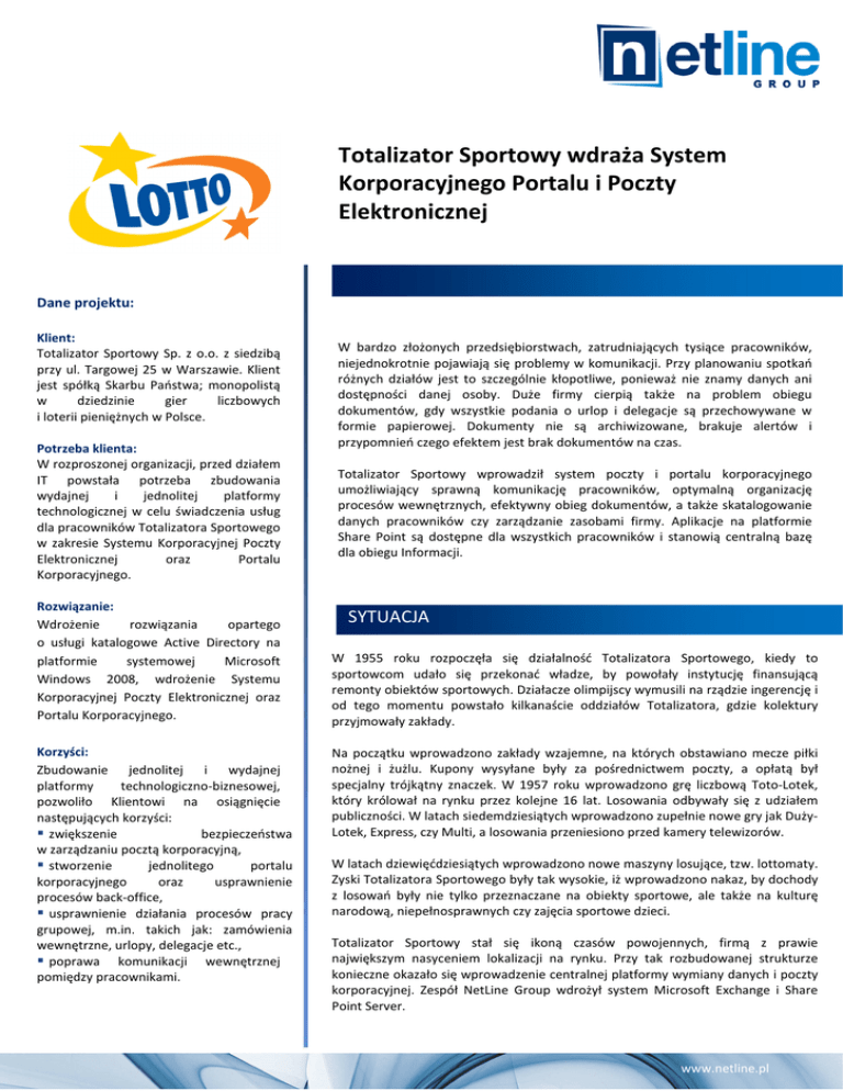 Totalizator Sportowy wdraża System Korporacyjnego Portalu i Poczty Elektronicznej Dane projektu: Klient: Totalizator Sportowy Sp. z o.o. z siedzibą przy ul. Targowej 25 w Warszawie. Klient jest spółką Skarbu Państwa; monopolistą w dziedzinie gier liczbowych i loterii pieniężnych w Polsce. Potrzeba klienta: W rozproszonej organizacji, przed działem IT powstała potrzeba zbudowania wydajnej i jednolitej platformy technologicznej w celu świadczenia usług dla pracowników Totalizatora Sportowego w zakresie Systemu Korporacyjnej Poczty Elektronicznej oraz Portalu Korporacyjnego. Rozwiązanie: Wdrożenie rozwiązania opartego o usługi katalogowe Active Directory na platformie systemowej Microsoft Windows 2008, wdrożenie Systemu Korporacyjnej Poczty Elektronicznej oraz Portalu Korporacyjnego. Korzyści: Zbudowanie jednolitej i wydajnej platformy technologiczno-biznesowej, pozwoliło Klientowi na osiągnięcie następujących korzyści: zwiększenie bezpieczeństwa w zarządzaniu pocztą korporacyjną, stworzenie jednolitego portalu korporacyjnego oraz usprawnienie procesów back-office, usprawnienie działania procesów pracy grupowej, m.in. takich jak: zamówienia wewnętrzne, urlopy, delegacje etc., poprawa komunikacji wewnętrznej pomiędzy pracownikami. W bardzo złożonych przedsiębiorstwach, zatrudniających tysiące pracowników, niejednokrotnie pojawiają się problemy w komunikacji. Przy planowaniu spotkań różnych działów jest to szczególnie kłopotliwe, ponieważ nie znamy danych ani dostępności danej osoby. Duże firmy cierpią także na problem obiegu dokumentów, gdy wszystkie podania o urlop i delegacje są przechowywane w formie papierowej. Dokumenty nie są archiwizowane, brakuje alertów i przypomnień czego efektem jest brak dokumentów na czas. Totalizator Sportowy wprowadził system poczty i portalu korporacyjnego umożliwiający sprawną komunikację pracowników, optymalną organizację procesów wewnętrznych, efektywny obieg dokumentów, a także skatalogowanie danych pracowników czy zarządzanie zasobami firmy. Aplikacje na platformie Share Point są dostępne dla wszystkich pracowników i stanowią centralną bazę dla obiegu Informacji. SYTUACJA W 1955 roku rozpoczęła się działalność Totalizatora Sportowego, kiedy to sportowcom udało się przekonać władze, by powołały instytucję finansującą remonty obiektów sportowych. Działacze olimpijscy wymusili na rządzie ingerencję i od tego momentu powstało kilkanaście oddziałów Totalizatora, gdzie kolektury przyjmowały zakłady. Na początku wprowadzono zakłady wzajemne, na których obstawiano mecze piłki nożnej i żużlu. Kupony wysyłane były za pośrednictwem poczty, a opłatą był specjalny trójkątny znaczek. W 1957 roku wprowadzono grę liczbową Toto-Lotek, który królował na rynku przez kolejne 16 lat. Losowania odbywały się z udziałem publiczności. W latach siedemdziesiątych wprowadzono zupełnie nowe gry jak DużyLotek, Express, czy Multi, a losowania przeniesiono przed kamery telewizorów. W latach dziewięćdziesiątych wprowadzono nowe maszyny losujące, tzw. lottomaty. Zyski Totalizatora Sportowego były tak wysokie, iż wprowadzono nakaz, by dochody z losowań były nie tylko przeznaczane na obiekty sportowe, ale także na kulturę narodową, niepełnosprawnych czy zajęcia sportowe dzieci. Totalizator Sportowy stał się ikoną czasów powojennych, firmą z prawie największym nasyceniem lokalizacji na rynku. Przy tak rozbudowanej strukturze konieczne okazało się wprowadzenie centralnej platformy wymiany danych i poczty korporacyjnej. Zespół NetLine Group wdrożył system Microsoft Exchange i Share Point Server. www.netline.pl ROZWIĄZANIE Zakres prac wykonanych w ramach wdrożenia platformy intranetowej w Totalizatorze Sportowym był szeroki i obejmował zadania począwszy od dostawy sprzętu do Centrali i wszystkich oddziałów, instalację całego środowiska, wdrożenie Active Directory dla całego przedsiębiorstwa na platformie systemowej Microsoft Windows 2008, uruchomienie poczty elektronicznej MS Exchange 2007 w całej organizacji skończywszy na wdrożeniu platformy Microsoft Office SharePoint Server 2007. W zakresie wdrożenia portalu intranetowego wykonany został projekt obejmujący szatę graficzną portalu oraz zawartość merytoryczna intranetu. Budowa portalu ogólnofirmowego w oparciu o MOSS 2007 obejmowała przygotowanie struktury portalu, szaty graficznej, bibliotek dokumentów oraz szeregu dedykowanych aplikacji (modułów): Kalendarz zespołu (integracja z MS Exchange) – zintegrowany z pocztą elektroniczną kalendarz umożliwiający szybkie sprawdzanie dostępności współpracowników, wspierający organizację spotkań. Rejestracja korespondencji – moduł służący do ewidencji poczty przychodzącej drogą tradycyjną, a także e-maili. Urlopy – system pozwalający na elektroniczny obieg dokumentacji urlopowej, urlopowej wraz z automatycznym pojawieniem się zaakceptowanego urlopu w kalendarzu. Delegacje – aplikacja pozwalająca na rozliczenie delegacji w formie elektronicznej. Rezerwacja Zasobów – aplikacja pozwalająca na rezerwację sal konferencyjnych, środków trwałych typu projektor, itp. Zamówienia wewnętrzne – moduł pozwalający na obsługę potrzeb wewnętrznych, jak materiały biurowe itp. Obsługa przetargów – system archiwizujący zamówienia publiczne. Struktura organizacyjna – moduł pozwalający na sprawdzenie danych pracowników, ułatwienie kontaktu. Książka telefoniczna – połączona baza kontaktów wewnątrz firmy, a także najważniejszych kontrahentów w całość. Facebook – lista kontaktów i zdjęć pracowników. Galerie zdjęć – możliwość umieszczania własnych zdjęć na portalu. CZAS I ZESPÓŁ REALIZUJĄCY PROJEKT Czas trwania projektu obejmował okres: 24.12.2008r.- 30.04.2009r. Zespół realizujący projekt składał się z wyspecjalizowanych inżynierów posi
