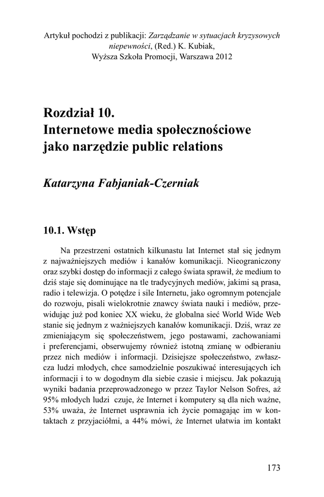 Artykuł pochodzi z publikacji: Zarządzanie w sytuacjach kryzysowych niepewności, (Red.) K. Kubiak, Wyższa Szkoła Promocji, Warszawa 2012 Rozdział 10. Internetowe media społecznościowe jako narzędzie public relations Katarzyna Fabjaniak-Czerniak 10.1. Wstęp Na przestrzeni ostatnich kilkunastu lat Internet stał się jednym z najważniejszych mediów i kanałów komunikacji. Nieograniczony oraz szybki dostęp do informacji z całego świata sprawił, że medium to dziś staje się dominujące na tle tradycyjnych mediów, jakimi są prasa, radio i telewizja. O potędze i sile Internetu, jako ogromnym potencjale do rozwoju, pisali wielokrotnie znawcy świata nauki i mediów, przewidując już pod koniec XX wieku, że globalna sieć World Wide Web stanie się jednym z ważniejszych kanałów komunikacji. Dziś, wraz ze zmieniającym się społeczeństwem, jego postawami, zachowaniami i preferencjami, obserwujemy również istotną zmianę w odbieraniu przez nich mediów i informacji. Dzisiejsze społeczeństwo, zwłaszcza ludzi młodych, chce samodzielnie poszukiwać interesujących ich informacji i to w dogodnym dla siebie czasie i miejscu. Jak pokazują wyniki badania przeprowadzonego w przez Taylor Nelson Sofres, aż 95% młodych ludzi czuje, że Internet i komputery są dla nich ważne, 53% uważa, że Internet usprawnia ich życie pomagając im w kontaktach z przyjaciółmi, a 44% mówi, że Internet ułatwia im kontakt 173 z przyjaciółmi1. Takie postrzeganie Internetu zwłaszcza przez bardzo młodych ludzi, jest bez wątpienia wyraźnym sygnałem, że preferencje dzisiejszych i przyszłych konsumentów ulegają diametralnej zmianie. Za tą zmianą powinni podążać także przedstawiciele świata marketingu, reklamy i public relations. Tylko bowiem wychodząc na przeciw postawom i oczekiwaniom konsumenckim mają szansę na efektywne prowadzenie komunikacji oraz dotarcie z przekazem do określonej grupy docelowej. Jednak komunikacja za pomocą Internetu nie ogranicza się dziś wyłącznie do mediów internetowych, jak serwisy online gazet, telewizji czy portale informacyjne. Wzrastającą siłą stają się bowiem internetowe portale społecznościowe (eng. social media), które gromadzą w jednym miejscu tysiące, a wręcz miliony osób o podobnych zainteresowaniach, preferencjach i oczekiwaniach. Społeczności te nie tylko stanowią bardzo liczną grupę, ale przede wszystkim grupę o ogromnej sile sprawczej, która zaledwie poprzez działanie jednostki, może przyczynić się do rozwoju i nagłośnienia dowolnej sytuacji czy wydarzenia. Wszystko to w bardzo szybki i często niekontrolowany sposób. Z tego samego powodu jest to też kanał komunikacji szczególnie podatny na powstawanie sytuacji kryzysowych, które w niezwykle krótkim czasie są w stanie rozprzestrzenić się z poziomu lokalnego, na globalny. Social media to zatem nie tylko wielki potencjał do wykorzystania przez marketerów, ale i nowe narzędzie i kanał komunikacji dla specjalistów public relations, które należy umiejętnie wykorzystywać, zwłaszcza w obliczu sytuacji kryzysowej. Celem niniejszego artykuł jest wskazanie szans oraz możliwości, jakie daje wykorzystanie internetowych mediów społecznościowych w public relations oraz przybliżenie funkcjonowania i zasad, jakimi należy kierować się będąc obecnym w social media, ze szczególnym uwzględnieniem sytuacji kryzysowej. Metodą wykorzystaną w przygotowaniu niniejszej była analiza raportów sektorowych dotyczących wykorzystania social media w komunikacji, danych statystycznych i raportów nt. liczby użytkowników Internetu oraz poszczególnych portali społecznościowych. Ponadto w niniejszej pracy przybliżone zostały poglądy i idee najważniejszych myślicieli komunikowania masowego oraz specjalistów ds. marketingu i public relations. Analizie poddano ich liczne publikacje, artykuły Por. Taylor Nelsons Sofres, Pokolenie XD, raport przeprowadzony na zlecenie The Walt Disney Company na grupie dzieci w wieku 8-14 lat w sześciu krajach Europy: Wielka Brytania, Niemcy, Francja, Hiszpania, Włochy i Polska, 2009 r. 1 174 i wypowiedzi. Oceniono ponadto słuszność i zasadność wykorzystywania w komunikacji internetowych mediów społecznościowych jako narzędzia public relations. 10.2. Internet – medium XXI wieku 10.2.1. Rozwój Internetu a kultura społeczna komunikowania „Techniczna zdolność błyskawicznego przesyłania znaków i symboli w skali całego globu, a tym samym dostarczania tych samych treści i emocji milionom czy miliardom ludzi, stała się dzisiaj powszechna i codzienna. Każdy z nas korzysta z wielu urządzeń telekomunikacyjnych i informacyjnych, i tak już do nich przywykliśmy, że przestaliśmy się im dziwić i je podziwiać. Nie zmienia to jednak faktu, że wszechobecność środowiska komunikacyjnego i powszechna dostępność rozmaitych mediów komunikowania, pokonujących czas i przestrzeń, jest świeżej daty i bezspornie ma rewolucyjną doniosłość w historii ludzkości”2. Słowa Tomasza Goban-Klasa z 1999 roku zdają się być bardzo aktualne i adekwatne do sytuacji, w jakiej dziś znajduje się rynek mediów i komunikacji społecznej. W swojej książce Media i komunikowanie masowe: Teorie i analizy prasy, radia, telewizji i Internetu, autor bardzo wyraźnie podkreślał rosnącą rolę mediów telekomunikacyjnych w nowoczesnych społeczeństwie. W swojej książce autor wyróżniał erę komunikowania za pomocą Internetu jako ostatnią i wynikową kilku poprzedzających er komunikowania masowego począwszy od ery znaków i sygnałów, mowy i języka, pisma, druku i komunikowania masowego, przez erę telekomunikacji i informatyzacji, a kończąc na erze komputera3. „Era komputera – tak można, bez przesady, nazwać koniec dwudziestego wieku, a w świetle rozwoju Internetu, erą telekomputera. Nie jest jeszcze pewne, co ona kulturowo oznacza, ale społeczeństwa i gospodarka pozos