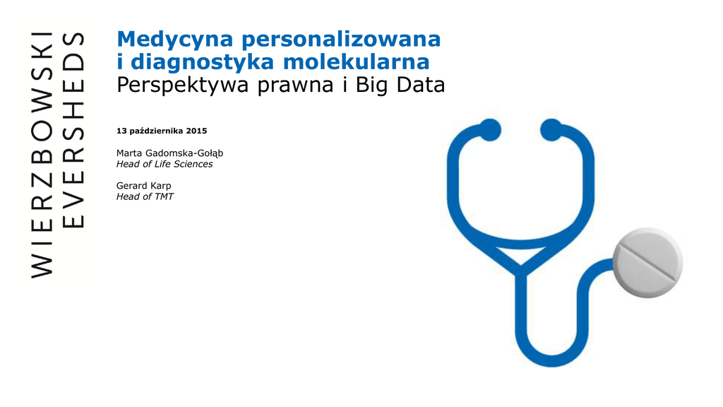 Medycyna personalizowana i diagnostyka molekularna Perspektywa prawna i Big Data 13 października 2015 Marta Gadomska-Gołąb Head of Life Sciences Gerard Karp Head of TMT European Alliance for Personalised Medicine STEPs campaign (Specialised Treatment for Europe’s Patients) for 2014-2019 − STEP 1: Ensuring a regulatory environment which allows early patient access to novel and efficacious personalised medicine − STEP 2: Increasing research and development for PM, while recognising its value − STEP 3: Improving the education and training of healthcare professionals − STEP 4: Supporting new approaches to reimbursement and HTA assessment, required for patient access to PM − STEP 5: Increasing awareness and understanding of PM Wierzbowski Eversheds | 13/10/2015 | Medycyna personalizowana i diagnostyka molekularna Obszary do regulacji Edukacja pacjenta HCP System opieki zdrowotnej • refundacja • standardy terapii • HTA Diagnostyka molekularna • standaryzacja diagnostyki • kontrola jakości • stworzenie placówek akredytowanych Korzyści: • profilaktyka • skuteczność terapii • minimalizacja efektów ubocznych Wierzbowski Eversheds | 13/10/2015 | Medycyna personalizowana i diagnostyka molekularna Dane osobowe Odpowiedzialność Badania kliniczne Big Data Dane osobowe Big Data Big Data w medycynie ‒ 2009 - kazus GOOGLE – grypa H1M1 (1 dzień/3 miliony zapytań, wszystkie są archiwizowane) • Centrum Zwalczania i Zapobiegania Chorobom ‒ 2009 – badanie zbieżności zachorowań na raka z używaniem telefonów komórkowych • Dane operatorów + rejestr osób chorujących na raka + rejestr zawierający dane dot. wykształcenia i dochodów) ‒ Uniwersytet w Ontario dr Carolin McGregor – opieka nad wcześniakami (współpraca z IBM) • różne strumienie danych (1260 przesłanych informacji/sekundę) • wykrywa zmiany na 24 h przed infekcją; niezmieniające się parametry wskazują na poważną infekcję Wierzbowski Eversheds | 13/10/2015 | Medycyna personalizowana i diagnostyka molekularna Big Data w medycynie – legalność zbierania danych ‒ DANE GENETYCZNE (nie tylko analiza DNA ale informacje o genach, charakterystyka dziedziczenia, historia rodziny, pochodzenie) • prawo własności do danych genetycznych ‒ IDEA „PODPISZ SIĘ I WYRAŹ ZGODĘ” • problem z określeniem przyszłych celów – odwoływalność zgody • problem z tzw. „re-use” • udostępnione innym podmiotom • moja zgoda a rodzina ‒ ANONIMIZACJA A DENONIMIZACJA • Kazus NetFlix Wierzbowski Eversheds | 13/10/2015 | Medycyna personalizowana i diagnostyka molekularna Ciemna strona Big Data ‒ Wykorzystanie danych medycznych w celach innych niż badawcze i lecznicze (ubezpieczenia/banki) ‒ Możliwość karania za skłonność, nie za działanie ‒ „Obsesja danych”: bezgraniczne poleganie na danych (kazus kwarantanny) Wierzbowski Eversheds | 13/10/2015 | Medycyna personalizowana i diagnostyka molekularna Marta Gadomska-Gołąb Radca prawny tel. +48 22 50 50 732 [email protected] Gerard Karp Adwokat tel. +48 22 50 50 749 [email protected] Wierzbowski Eversheds ul. Jasna 14/16a 00-041 Warszawa eversheds.pl ©2015 Wierzbowski Eversheds Sp. k. Wierzbowski Eversheds jest członkiem Eversheds International Limited