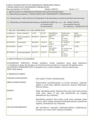 KARTA CHARAKTERYSTYKI PREPARATU NIEBEZPIECZNEGO LAKIER AKRYLOWY BEZBARWNY PREMIUM HS Data sporządzenia: 01.03.2013 Numer: LB03/13 Strona: 1 z 7 1. IDENTYFIKACJA PREPARATU/PRODUCENTA/DYSTRYBUTORA 1.1 Identyfikacja preparatu: LAKIER AKRYLOWY BEZBARWNY PREMIUM HS 1.2. Zastosowanie: Lakier akrylowy (komponent A) do nanoszenia za pomocą pistoletu natryskowego. 1.3. Identyfikacja Producenta/Dystrybutora: MATMARCHEM Sp. z o.o. Tel. +48 602 284 943 ul. Dworna 46A www.matmarchem.pl 30244 Kraków Tel. alarmowy: +48 668 476 570 2. SKŁAD I INFORMACJA O SKŁADNIKACH nr WE nr CAS nr indeksowy Nazwa substancji 607195007 Octan 1metoksy2 2036039 propylu 108656 607025001 Octan butylu 2046581 123864 R10 R6667 601022009 Ksylen 2155357 1330207 R10 Xn, R20/21 Xi, R38 607038002 Octan butyloglikolu 2039333 112072 Klasyfikacja substancji R10 Xi; R36 Xn; R20/21 Znakowanie substancji Xi R: 1036 S: (2)25 R: 106667 S: (2)25 Xn R: 1020/2138 S: (2)25 Xn R: 20/21 S: (2)24 Skład procentowy 1015% 1530% 510% 15% 3. IDENTYFIKACJA ZAGROŻEŃ ZAGROŻENIE ZDROWIA: Produkt szkodliwy. Działa szkodliwie przez drogi oddechowe i w kontakcie ze skórą. Powtarzające się narażenie może powodować wysuszanie lub pękanie skóry. WŁASNOŚCI NIEBEZPIECZNE: Łatwopalna ciecz; unikać kontaktu z silnymi utleniaczami. INNE: Brak danych 4. PIERWSZA POMOC OGÓLNE WSKAZÓWKI: Patrz punkt 11 Karty Charakterystyki. DROGI ODDECHOWE: Wyprowadzić poszkodowanego na świeże powietrze, zapewnić spokój, w razie braku oddechu zastosować sztuczne oddychanie. Wezwać lekarza. SKÓRA: Zdjąć zabrudzoną odzież. Skażoną skórę zmyć dużą ilością letniej wody przez około 15 min. gdy podrażnienie nie ustępuje skonsultować się z lekarzem. OCZY: Natychmiast przemyć dużą ilością wody przez minimum około 15 min, unikać silnego strumienianiebezpieczeństwo uszkodzenia rogówki, skonsultować się z lekarzem. UKŁAD POKARMOWY: Nie powodować wymiotów (niebezpieczeństwo zachłyśnięcia). Przemyć usta wodą. Pomoc lekarska niezbędna. KARTA CHARAKTERYSTYKI PREPARATU NIEBEZPIECZNEGO LAKIER AKRYLOWY BEZBARWNY PREMIUM HS Data sporządzenia: 01.03.2013 Numer: LB03/13 Strona: 2 z 7 5. POSTĘPOWANIE W PRZYPADKU POŻARU SUBSTANCJE GAŚNICZE: Proszek, piana odporna na działanie alkoholi, dwutlenek węgla, mgła wodna. SZCZEGÓLNE ZAGROŻENIA: W przypadku pożaru może powstawać tlenek węgla. WYPOSAŻENIE OCHRONNE: Zespoły gaśnicze wyposażyć w niezależną od powietrza z otoczenia ochronę dróg oddechowych i lekką odzież ochronną. INNE INFORMACJE: Chłodzić sąsiednie pojemniki rozpylając na nie wodę z bezpiecznej odległości. 6. POSTĘPOWANIE W PRZYPADKU NIEZAMIERZONEGO UWOLNIENIA DO ŚRODOWISKA ŚRODKI OSTROŻNOŚCI ODNIESIONE DO OSÓB: Usunąć źródła zapłonu. Zapewnić dostateczną wentylację pomieszczenia. Unikać bezpośredniego kontaktu z uwalniającą się substancją. Unikać kontaktu ze skórą i oczami. Środki ochrony osobistejpunkt 8 Karty. ŚRODKI OCHRONY ŚRODOWISKA: Zapobiegać przedostaniu się do kanalizacji, powierzchniowych, gruntowych oraz gleby. Przy dużych wyciekach teren obwałować. wód METODY ZBIERANIA: Zlikwidować wyciek (zamknąć dopływ cieczy, uszczelnić), uszkodzone opakowania umieścić w opakowaniu awaryjnym, zebrać mechanicznie ciecz do opakowania awaryjnego. Przy małych ilościach zebrać uniwersalnym środkiem wiążącym (np. łyszczyk, ziemia okrzemkowa, piasek). Postępowanie z odpadami patrz punkt 13 Karty. 7. OBCHODZENIE SIĘ Z SUBSTANCJĄ I MAGAZYNOWANIE ZASADY POSŁUGIWANIA SIĘ: Trzymać z dala od ciepła i źródeł ognia. Nie palić papierosów. Nie wdychać par. Unikać kontaktu ze skórą i oczami. Przedsięwziąć środki bezpieczeństwa przeciw wyładowaniom elektrostatycznym. Stosować w dobrze wentylowanych pomieszczeniach. Stosować środki ochrony osobistej – punkt 8 Karty. MAGAZYNOWANIE: Przechowywać w szczelnie zamkniętych pojemnikach, w chłodnych, dobrze wentylowanych pomieszczeniach. Zakaz składowania w pobliżu dużej ilości nadtlenków organicznych oraz innych silnych utleniaczy. SPECYFICZNE ZASTOSOWANIE: Patrz: Karta Techniczna wyrobu. 8. KONTROLA NARAŻENIA/ŚRODKI OCHRONY INDYWIDUALNEJ Stosowane środki ochrony osobistej powinny spełniać wymogi Rozporządzenia Ministra Gospodarki 21 grudnia 2005 r. w sprawie zasadniczych wymagań dla środków ochrony indywidualnej Dz. U. 2005 Nr 259, poz. 2173 OCHRONA DRÓG ODDECHOWYCH: Maska przeciwgazowa z pochłaniaczem typu A. OCHRONA RĄK: Rękawice ochronne (np. z vitonu, kauczuku nitrylowego, polialkoholu winylowego). OCHRONA OCZU: Okulary ochronne OCHRONA SKÓRY: Odpowiednia odzież ochronna (tkaniny powleczone, impregnowane) STANOWISKO PRACY: Odciągi miejscowe i wentylacja ogólna. KARTA CHARAKTERYSTYKI PREPARATU NIEBEZPIECZNEGO LAKIER AKRYLOWY BEZBARWNY PREMIUM HS Data sporządzenia: 01.03.2013 Numer: LB03/13 Strona: 3 z 7 Rozporządzenie Ministra Pracy i Polityki Socjalnej z dnia 26 września 1997r. w sprawie ogólnych przepisów bezpieczeństwa i higieny pracy Dz. U. Nr 129, poz.844 z późniejszymi zmianami Dz. U. Nr 91, poz.811 z 2002r; tekst jednolity Dz. U. Nr 169, poz.1650 z 2003 r. z późniejszymi zmianami Dz. U. 2007 Nr 49, poz. 330 Rozporządzenie Ministra Zdrowia z dnia 30 grudnia 2004 roku w sprawie bezpieczeństwa i higieny pracy związanej z występowaniem w miejscu pracy czynników chemicznych Dz. U z 2005 roku Nr 11, poz. 86 Badania lekarskie pracowników zgodnie z Kodeksem Pracy i wg. Rozporządzenia Ministra Zdrowia i Opieki Społecznej z dnia 30 maja 1996 r. w sprawie przeprowadzenia badań lekarskich pracowników, zakresu profilaktycznej opieki zdrowotnej nad pracownikami oraz orzeczeń lekarskich wydawanych do celów przewidzianych w Kodeksie pracy Dz. U. Nr 69, poz. 332 z 1996 r. z późniejszymi zmianami Dz. U. Nr 159, poz.1057 z 1998r oraz Dz. U. Nr 37, poz. 451 z 2001r. Wartości najwyższych dopuszczalnych stężeń wg Rozporządzenia Ministra Pracy I Polityki Społ