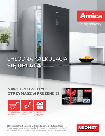CHŁODNA KALKULACJA SIĘ OPŁACA NAWET 200 ZŁOTYCH OTRZYMASZ W PREZENCIE! 1. KUP WYBRANĄ LODÓWKĘ 2. ZAREJESTRUJ ZAKUP 3. KARTĘ OTRZYMASZ DO DOMU Oferta specjalna obowiązuje w okresie 15 czerwca – 31 lipca 2015 r. lub do wyczerpania zapasu nagród. Oferta dotyczy urządzeń wymienionych wewnątrz ulotki i obowiązuje tylko w sklepach sieci Neonet i www.neonet.pl LODÓWKI objęte ofertą specjalną Chłodziarko-zamrażarka wolnostojąca FK338.6GBF z funkcją No Frost w zamrażarce 200 ZŁOTYCH OTRZYMASZ W PREZENCIE! 200 zł Chłodziarko-zamrażarka wolnostojąca FK338.6GBAA z funkcją automatycznego odszraniania 200 ZŁOTYCH OTRZYMASZ W PREZENCIE! 200 zł Chłodziarko-zamrażarka wolnostojąca FK328.4X Standard Plus z funkcją automatycznego odszraniania 150 ZŁOTYCH OTRZYMASZ W PREZENCIE! 150 zł Chłodziarko-zamrażarka wolnostojąca FK238.4FX z funkcją No Frost w chłodziarce i zamrażarce 150 ZŁOTYCH OTRZYMASZ W PREZENCIE! 150 zł Chłodziarko-zamrażarka wolnostojąca FK318.4 z funkcją automatycznego odszraniania 100 ZŁOTYCH OTRZYMASZ W PREZENCIE! 100 zł ZASADY OFERTY SPECJALNEJ 1. Kup wybraną lodówkę Amica 2. Zarejestruj zakup na stronie www.amica.pl/chlodnakalkulacja lub mailowo na adres [email protected] lub pocztą tradycyjną 3. Nagrodę – przedpłaconą kartę otrzymasz prosto do domu INFOLINIA: 609 609 704 Koszt połączenia w/g taryfy operatora Szczegóły oraz Regulamin Oferty specjalnej dostępne na: www.amica.pl/chlodnakalkulacja