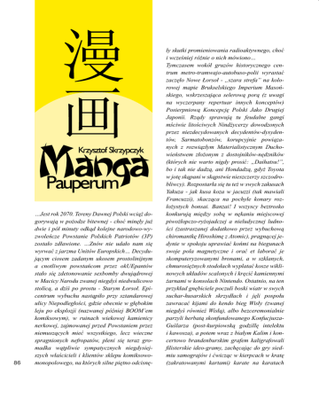 86 …Jest rok 2070. Tereny Dawnej Polski wciąż dogorywają w pożodze bitewnej - choć minęły już dwie i pół minuty odkąd kolejne narodowo-wyzwoleńcze Powstanie Polskich Patriotów (3P) zostało zdławione. …Znów nie udało nam się wyrwać z jarzma Unitów Europskich… Decydującym ciosem zadanym ukosem prostolinijnym a cnotliwym powstańcom przez okUEpantów stało się zdetonowanie sexbomby dwujądrowej w Macicy Narodu zwanej niegdyś niedwulicowo stolicą, a dziś po prostu - Starym Łorsoł. Epicentrum wybuchu nastąpiło przy sztandarowej ulicy Niepodległości, gdzie obecnie w głębokim leju po eksplozji (nazwanej później BOOM’em komiksowym), w ruinach wiekowej kamienicy nerkowej, zajmowanej przed Powstaniem przez niemuszących mieć wszystkiego, lecz wieczne spragnionych nefropatów, pleni się teraz gromadka wątpliwie sympatycznych niegdysiejszych właścicieli i klientów sklepu komiksowomonopolowego, na których silne piętno odcisnę- ły skutki promieniowania radioaktywnego, choć i wcześniej różnie o nich mówiono… Tymczasem wokół gruzów historycznego centrum metro-tramwajo-autobuso-polii wyrastać zaczęło Nowe Łorsoł - „szara strefa” na kolorowej mapie Brukselskiego Imperium Masońskiego, wskrzeszająca selerową porą (z uwagi na wyczerpany repertuar innych konceptów) Posierpniową Koncepcję Polski Jako Drugiej Japonii. Rządy sprawują tu feudalne gangi mściwie litościwych Nindżycerzy dowodzonych przez niezdecydowanych decydentów-dysydentów, Sarmatobonzów, korupcyjnie powiązanych z rozwiązłym Materialistycznym Duchowieństwem złożonym z dostojników-nędzników (których nie warto nigdy prosić: „Daihatsu!”, bo i tak nie dadzą, ani Hondadzą, gdyż Toyota w jotę skąpani w skąpstwie nieszczerzy szczodrobliwcy). Rozpostarła się tu też w swych zakusach Yakuza - jak kusa koza w jacuzzi (tak mawiali Francuzzi), skacząca na pochyłe konary rozłożystych bonsai. Banzai! I wszyscy beztrosko konkurują między sobą w nękaniu miejscowej piwożłopczo-ryżojadczej a nieludycznej ludności (zastraszanej dodatkowo przez wybuchową chiromantkę Hiroshimę z Atomic), pragnącej jedynie w spokoju uprawiać końmi na biegunach swoje pola magnetyczne i orać et laborać je skomputeryzowanymi bronami, a w szklanych, chmurosiężnych stodołach wyplatać kosze wiklinowych układów scalonych i kręcić kamiennymi żarnami w konsolach Nintendo. Ostatnio, na ten przykład gnębiciele poczuli boski wiatr w swych suchar-husarskich skrzydłach i jęli pospołu zawracać kijami do kendo bieg Wisły (zwanej niegdyś również Wisłą), albo bezceremonialnie parzyli herbatą skonfundowanego KonfucjuszaGuślarza (post-kurpiowską godzillę intelektu i kawosza), a potem wraz z białym Kalim i koncertowo brandenburskim grafem kaligrafowali filisterskie ideo-gramy, zachęcając do gry siedmiu samograjów i ćwicząc w kierpcach w kratę (zakratowanymi kartami) karate na karatach diamentów z popiołu norwidowskiego wywiedzionych (którym i niejedna gruszka na wierzbie zasypana była…). Jednakże czynili to wszystko po pokazie judo doktora Judyma (co wargi nadyma, gdy nosem puszcza dyma, lecz chorego „nie wydyma”) i po przedstawieniu jasełki w teatrze kabuki, gdzie ich zawsze w gardłach sushi, więc nabuzowani dźwiękami buzuki spożyli w garncach przetopionych z bazooki żytnioziemniaczaną sake, serwowaną ping-pongowo wraz z bambusowymi sufletami suflera-mima przez na wpół nagie i całkiem pro-oralnie a kurtuazyjnie nęcące zza kurtyny syreny-kurtyzany, zwane Naga-ssaki z Ossaki (sporo ich w Sapporo jak ostrzy scyzoro w szpadach, szpadlach i szpachlach Zorro. A w Kyoto? Kto to? MyszoMałysz to czy Koto-? Bo chyba nie Dużysz?). I dopiero później orient-expressowo zorientowali się sumorycznie, że w sumie ich zapasowe działania pozostają bez (jakże przez nich pożądanego!) negatywnego związku ze wznoszoną opodal na jasnej górze popromiennych odpadów Świątynią Narodową (bo nie dla tych szui takie feng shui). Tam to w specjalnej pagodzie (wybudowanej w stylu kaszubskim i ozdobionej ikebanami z oscypków) umieszczony zostanie przy budzie z buddyjskimi posągo-świątkami patronów miasta (StarWarsa i KuroSawy) Cudem Ocalały z Wybuchu, wraz z kolekcją łowickich origami, kadr z wizerunkiem Czarodziejki-Dziewicy z Księżyca-Swarożyca, czczonej teraz jako Niepokalana Niegejogejsza-Matka Narodu Wypranego (z Pomysłów). ...Słone słonko roztęczyło się słodko nad horrendalnie chorym wertykalnością horyzontem, gdy stojący o jeden most na rzece Kwai za blisko i nie obserwujący tych wydarzeń ronin-lajkonik, zaabsorbowany zrywaniem pionowych poziomek i nad wyraz spokojnego agrestu oraz dokarmianiem prosem swego stadka trzpiotliwych tamagoczi, mrugnął, mruknął i zakaraokował do siebie słowa dufne: „Toshiby okienne są Mi ufne - jak u Mifune Toshiry zdobyczne szklane Yokohama pospolitego”. (Lecz mija mu to jak Miyamoto Musashi wymijał swych moto-przeciwników.) A potem zalany potem ten Nipponnicpoń seppuknął w czoło i nie rzekł ani be, Anime - jeno jeny w kieszeniach jego jedwabnych portek zabrzęczały (jak jęk lokalnego znachora testującego na swych jelitach lecznicze właściwości harakiri) i kaleSony mu się sPhilipsiły (ale nie sMitsubishiły, bo Sie mens zMazdaił i Kawa(ł)saki wySharpał), a z klawego, choć siermiężnego klawikordu marki (talary?) „Yamaha, yamasoul” modernistyczny tokio-toking w rytm mazurka jął się dobywać: „Japonio! Synczyzno moja, ty jesteś jak akupunktura (choć bałtyckie tsunami między nami)…” Wesolutko, oj, wesolutko, że hej! dziś w remizie; Akira żałobnego mimo to, Chińczyki, pełne azjacko-tuhajbejowej żółci, wciąż trzymają się mocno... W tym to nihilistycznym świecie chaosu, inercji, dekadencji, bezprawia i bez jednolitego canonu (nie mylić z Panem Sonikiem!) pojawił się znienacka, niczym kamikaze na lotnisku po spełnionym 