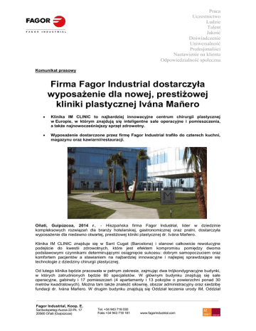 Praca Uczestnictwo Ludzie Talent Jakość Doświadczenie Uniwersalność Profesjonaliści Nastawienie na klienta Odpowiedzialność społeczna Komunikat prasowy Firma Fagor Industrial dostarczyła wyposażenie dla nowej, prestiżowej kliniki plastycznej Ivána Mañero Klinika IM CLINIC to najbardziej innowacyjne centrum chirurgii plastycznej w Europie, w którym znajdują się inteligentne sale operacyjne i pomieszczenia, a także najnowocześniejszy sprzęt zdrowotny. Wyposażenie dostarczone przez firmę Fagor Industrial trafiło do czterech kuchni, magazynu oraz kawiarni/restauracji. Oñati, Guipúzcoa, 2014 r.. - Hiszpańska firma Fagor Industrial, lider w dziedzinie kompleksowych rozwiązań dla branży hotelarskiej, gastronomicznej oraz pralni, dostarczyła wyposażenie dla niedawno otwartej, prestiżowej kliniki plastycznej dr. Ivána Mañero. Klinika IM CLINIC znajduje się w Sant Cugat (Barcelona) i stanowi całkowicie rewolucyjne podejście do kwestii zdrowotnych, które jest efektem kompromisu pomiędzy dwoma podstawowymi czynnikami determinującymi osiągnięcie sukcesu: dobrym samopoczuciem oraz komfortem pacjentów a stawianiem na najbardziej innowacyjne i najlepiej sprawdzające się technologie z dziedziny chirurgii plastycznej. Od lutego klinika będzie pracowała w pełnym zakresie, zajmując dwa trójkondygnacyjne budynki, w których zatrudnionych będzie 80 specjalistów. W głównym budynku znajdują się sale operacyjne, gabinety i 17 pomieszczeń (4 apartamenty i 13 pokojów o powierzchni ponad 30 metrów kwadratowych). Można tam także znaleźć siłownię, obszar administracyjny oraz siedzibę fundacji dr. Ivána Mañero. W drugim budynku znajdują się Oddział leczenia urody IM, Oddział Fagor Industrial, Koop. E. Santxolopetegi Auzoa 22-Pk. 17 20560 Oñati (Guipúzcoa) Tel. +34 943 718 030 Faks +34 943 718 181 www.fagorindustrial.com Praca Uczestnictwo Ludzie Talent Jakość Doświadczenie Uniwersalność Profesjonaliści Nastawienie na klienta Odpowiedzialność społeczna stomatologii estetycznej, Oddział leczenia włosów oraz Oddział aktywnej długowieczności, który istnieje wspólnie z Oddziałem przeciwstarzeniowym. Kuchnia, która została wyposażona przez firmę Fagor Industrial, składa się z czterech różnych obszarów zajmujących tę samą przestrzeń. Tworzą one funkcjonalną kuchnię o wysokiej jakości, która jest dobrze dopasowana do innowacyjnej, pozostałej części centrum. W obszarze przygotowywania gorących posiłków znajdują się blok do gotowania z gamy 900, najnowocześniejszy piec ADVANCE, chromowana blacha do pieczenia, bemar oraz okap, a także wykonana jest w nim instalacja przeciwpożarowa. Obszar przygotowywania zimnych posiłków jest wyposażony w stoły chłodnicze z gamy CONCEPT, które są zamontowane pod blatami, a w obszarze zmywania znajdują się zmywarka przelotowa oraz zamykana szafa na naczynia stołowe, która chroni je przed zabrudzeniem. Wreszcie w kuchni jest także wyznaczony obszar roboczy, w którym znajdują się jednolite stoły, zlewy, listwy przypodłogowe zapobiegające gromadzeniu się brudu oraz półki do przechowywania zapasów, które pozwalają optymalnie wykorzystać dostępną przestrzeń. Oprócz kuchni firma Fagor Industrial wyposażyła także magazyn oraz chłodnię, dostarczając odpowiedni zespół chłodniczy marki Kide, a także kawiarnię i restaurację, które znajdują się na tym samym otwartym i uniwersalnym obszarze, który jest dostosowany do potrzeb klientów. W tym przypadku wyposażenie dostarczone przez tę firmę objęło stojaki na butelki montowane pod białym blatem Silestone. Klinika IM CLINIC dąży do osiągnięcia doskonałości odpowiadającej obiektowi oznaczonemu 5 gwiazdkami i w związku z tym, korzystając z pomocy firmy Fagor Industrial wyposażyła ona całą restaurację, w której pacjenci, ich krewni oraz pracownicy mogą zasmakować specjalności haute cuisine, które zarazem mają dobroczynny wpływ na ich zdrowie. Wynikiem tych działań jest klinika oparta na nowej koncepcji, w której jednocześnie może być leczonych 17 pacjentów hospitalizowanych oraz 200 pacjentów odwiedzających klinikę każdego dnia w celu poddania się różnym zabiegom. Klinika zapewnia im największy możliwy komfort. „Współpraca firmy Fagor Industrial z kliniką IM CLINIC ma zasadnicze znaczenie, ponieważ nasza profesjonalna kuchnia musiała zostać wyposażona w najlepsze urządzenia i najnowsze technologie, aby nie odstawała od reszty centrum”, mówi dr Mañero. „Z przyjemnością staliśmy się częścią inwestycji dr. Mañero' i dzięki uczestnictwu w procesie tworzenia pionierskiej i międzynarodowej kliniki zyskaliśmy możliwość podejmowania się Fagor Industrial, Koop. E. Santxolopetegi Auzoa 22-Pk. 17 20560 Oñati (Guipúzcoa) Tel. +34 943 718 030 Faks +34 943 718 181 www.fagorindustrial.com Praca Uczestnictwo Ludzie Talent Jakość Doświadczenie Uniwersalność Profesjonaliści Nastawienie na klienta Odpowiedzialność społeczna realizacji kompleksowych projektów dla branży zdrowotnej”, oświadcza Mario López, Krajowy Dyrektor Komercyjny firmy Fagor Industrial Informacje o firmie Fagor Industrial Firma Fagor Industrial to spółdzielnia należąca do Mondragón. Firma specjalizuje się w dostawach i montażu kompleksowych rozwiązań przeznaczonych dla branży hotelarskiej, gastronomicznej oraz pralniczej. Jej oferta obejmuje rozbudowaną gamę innowacyjnych produktów, wytwarzanych samodzielnie przez firmę. Firma ta wchodzi w skład międzynarodowej grupy biznesowej o nazwie Grupa ONNERA, która posiada 10 zakładów produkcyjnych rozlokowanych na całym świecie i zatrudnia 1700 pracowników. Ponad 450 specjalistów pracujących w firmie Fagor Industrial sprawia, że firma ta dzięki swej rzetelności, jakości swoich produktów, najlepszym technologiom wykorzystywanym przy ich produkcji, a także efektywnej obsłudze przed- i posprz