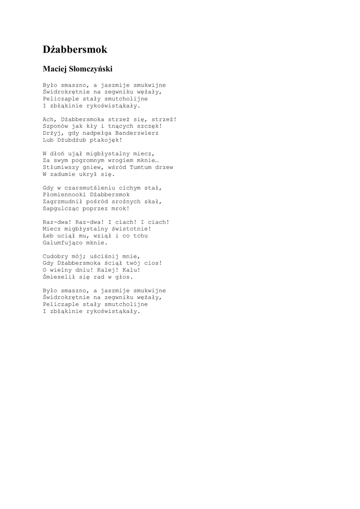 Dżabbersmok Maciej Słomczyński Było smaszno, a jaszmije smukwijne Świdrokrętnie na zegwniku węŜały, Peliczaple stały smutcholijne I zbłąkinie rykoświstąkały. Ach, DŜabbersmoka strzeŜ się, strzeŜ! Szponów jak kły i tnących szczęk! DrŜyj, gdy nadpełga Banderzwierz Lub DŜubdŜub ptakojęk! W dłoń ujął migbłystalny miecz, Za swym pogromnym wrogiem mknie… Stłumiwszy gniew, wśród Tumtum drzew W zadumie ukrył się. Gdy w czarsmutśleniu cichym stał, Płomiennooki DŜabbersmok Zagrzmudnił pośród sroŜnych skał, Sapgulcząc poprzez mrok! Raz-dwa! Raz-dwa! I ciach! I ciach! Miecz migbłystalny świstotnie! Łeb uciął mu, wziął i co tchu Galumfująco mknie. Cudobry mój; uściśnij mnie, Gdy DŜabbersmoka ściął twój cios! O wielny dniu! Kalej! Kalu! Śmieselił się rad w głos. Było smaszno, a jaszmije smukwijne Świdrokrętnie na zegwniku węŜały, Peliczaple stały smutcholijne I zbłąkinie rykoświstąkały. Dziaberliada Stanisław Barańczak Brzdęśniało juŜ; ślimonne prztowie Wyrło i warło się w gulbieŜy; Zmimszałe ćwiły borogowie I rcie grdypały z mrzerzy. O strzeŜ się, synu, Dziaberłaka! Łap pazurzastych, zębnej paszczy! Omiń Dziupdziupa, złego ptaka, Z którym się Brutwiel piastrzy! A on jął w garść worpalny miecz: Nim wroga wdepcze w grzębrną krumać, Chce tu, gdzie szum, wśród drzew Tumtum stać parę chwil i dumać. Lecz gdy tak tonie w dumań gląpie, Dziaberłak płomienistooki Z dala przez gąszcze tulŜyc tąpie, Brdli, bierze się pod boki! Ba-bach! Ba-bach! I rach, i ciach Worpalny brzeszczot cielsko ciachnął! A on wziął łeb i poprzez step W powrotny szlak się szlachnął. TyŜeś więc ubił Dziaberłaka? Pójdź, chłopcze, chlubo jazd i piechot, Objąć się daj! Ho-hej! Ha-haj!, RŜał rupertyczny rechot. Brzdęśniało juŜ; ślimonne prztowie Wyrło i warło się w gulbieŜy; Zmimszałe ćwiły borogovie I rcie grdypały z mrzerzy. Dżabrokłap Bogumiła Kaniewska W dzionek błyskliwy ślniły grzaski, Co się wśród grętów wygregrały, Praary fumnie darły kraski, A śliskie szmyki się drąskały. Synu, ty strzeŜ się DŜabrokłapa! Co paszczą grzązi, pazur strzyga, I ptaka śuŜu omiń, z dala Krzepnego witaj Jadośmiga! On w dłoń waleczną sieczek chycił Długo wśród grogów czechędował, W nieniu tumgrzewa, co go sycił. Odpoczął, grafną myśl przychował. Gdy stał w tumgrzewnym myśli nieniu, DŜabrokłap źryście łysnął w mroku, Flapiąc i grzędząc Ŝłapał k niemu, A grząźba mu łuniała w oku! Raz, dwaz! Dwaz, raz! I w tek, i w osiek Sieczkowe istrze oskry krzeszy, Srogiego zwierza na zmór posiekł I z łbemy uciętym do dom cieszy. śeś zgłebał, chłopcze, DŜabrokłapa, Ach! jakŜe dzień chwaliwy!. Wdzięczliwy chachot się rozlata, Triumfatora głos śmiechliwy. W dzionek błyskliwy ślniły grzaski, Co się wśród grętów wygregrały, Praary fumnie darły kraski, A śliskie szmyki się drąskały. Żabrołak Janusz Korwin-Mikke Błyszniało – szlisgich hopuch świr Tęczując w kałdach świtrzem wre, Mizgłupny był borolągw hyr, Chrząszczury wlizły młe. śabrołak kąsa chwytem szczęk – mój synu – szponów cięć się strzeŜ! Dziabdziaba bój się! Budzi lęk Bandaper, skroźny zwierz! śarłacny miecz wziął w dłoń i wciąŜ Człowroga tropem dąŜył wraz AŜ skrywszy się, gdzie Tumtumu pnie, Zadumał jakiś czas. Wtem jak w uffnieniu myśli wstał: śabrołak z płogniem w oku wŜdy Przez tłuszczy gwiszcząc drze się zwał, Burklotem idąc grzmi! Raz-dwa! Raz-dwa! Na wskroś! Na wskroś! śarłacny miecz tnie ściachu-ciach! Gdy ścierwem legł, wziął jego łeb W dom galopyszniąc gna! Tyś Ŝabrołaka zrąbł! Pójdź zaś W ramiona me promieńcze cny! O chwielbny dniu! Hej-ho! Hej-lu! Chichrypiał rad przez łzy. Błyszniało – szlisgich hopuch świr Tęczując w kałdach świtrzem wre, Mizgłupny był borolągw hyr, Chrząszczury wlizły młe. Dziaberlak Jolanta Kozak BzdręŜyło. Szłapy maślizgajne Bujowierciły w gargazonach Tubylerczykom spełły fajle, Humpel wyświchnął ponad. Dziaberlak tuŜ, więc trwóŜ się, trwóŜ! I szykuj, synu, długi nóŜ! Z nim ptak Dzióbdziób i słychać tup Pazurnych Kociłapów stóp! On ujał w dłoń zadzierŜny miecz. Chłystnego wroga ścigał precz, AŜ utrudzony zdysznie siadł Pod wielkim drzewem Dziaodziad. A gdy w przcupie zmyślnym trwał, Od chąszczwy lasu pędzi w cwał, Garumfifując, smocząc skry, Dziaberlak arcydzicznie zły! I raz! I dwa! I cup! I łup! ZadzierŜny miecz – bezłebski trup! Lecz furda trup, gdy trupem łeb! Więc łaps za łeb! I galump w step! Dziaberlak zgłowion? Strupion? Padł? Pójdź w me ramiona, boś ty chwat! O, świętny dzień! Hurra! Hip hip! Tralala bum cyk cyk! BzdręŜyło. Szłapy maślizgajne Bujowierciły w gargazonach Tubylerczykom spełły fajle, Humpel wyświchnął ponad. Żabrołaki Robert Stiller Był czas mrusztławy, ślibkie skrątwy Na wałzach wiercząc świrypły, A mizgłe do cna boroglątwy I zdomne świszczury zgrzypły. Mój synu, śabrołaka się strzeŜ Co szponem drze, w paszcz chapa! I dziubdziuba się bój! Zgroźliwego teŜ Unikaj Bandrochłapa! Swój miecz Ŝarłacki jąwszy w dłoń, Na wraŜych śmiardłków Ŝarty Szedł w noc, trwał w dzień o pampamu pień W ychliwych myślach wsparty. A w myślach onych trwiąc, czuj duch! śabrołak z płogniem w oku Świszłap! I brnie przez tołszczy pnie I grzbyka nań w pokroku. Raz, dwa! Raz, dwa! Rąb klingo zła, śarłacka, opak zbrodom! Na śmierć go w ziem! I zrąbł, i z łbem Pogalopysznił do dom. Tyś Ŝabrołaka zrąbł? Pójdź, pójdź, Promieńcze, w me objęcia! O, świękny dniu! Wycz hej! Wycz hu! Krztuchotał do dziecięcia. Był czas mrusztławy, ślibkie skrątwy Na wałzach wiercząc świrypły, A mizgłe do cna boroglątwy I zdomne świszczury zgrzypły. Żubrowołk Juliusz Wiktor Gomulicki Podpiekało. Śliskawe towony Kołob