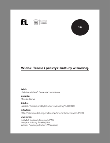 14 Widok. Teorie i praktyki kultury wizualnej. tytuł: „Sztuka wiejska”. Poza styl narodowy autorka: Monika Borys źródło: „Widok. Teorie i praktyki kultury wizualnej” 14 (2016) odsyłacz: http://pismowidok.org/index.php/one/article/view/414/816 wydawca: Instytut Badań Literackich PAN Instytut Kultury Polskiej UW Widok. Fundacja Kultury Wizualnej Monika Borys „Sztuka wiejska”. Poza styl narodowy „Polska – kraj folkloru?”, kuratorka: Joanna Kordjak, Zachęta – Narodowa Galeria Sztuki, 15 października 2016 – 15 stycznia 2017 Czarno-biała fotografia z wyjazdu Zespołu Pieśni i Tańca „Kamionka” na Międzynarodowy Festiwal Folklorystyczny w Kairze w 1964 roku przyciąga uwagę surrealistyczną aurą. Zdjęcie wypełniają elementy imaginarium (polskich) „inności” – przedstawia ono grupę osób w krakowskich strojach ludowych pozujących na tle piramidy i sfinksa. Fantazyjne pawie pióropusze przyczepione do męskich Zespół pieśni i tańca, założony przy rogatywek zaskakująco dobrze wtapiają się w egzotyczny spółdzielni Kamionka w Łysej Górze, krajobraz. Wśród uśmiechniętych tancerzy i tancerek są podczas tournée, Egipt, lata 60. też dwie osoby ubrane zwyczajnie – to być może założyciele zespołu, który powstał przy Spółdzielni Wyrobów Ceramicznych „Kamionka” w Łysej Górze, utworzony w 1947 roku przez ludowego działacza Franciszka Mleczkę. Fotografia jest bardzo mała, nieproporcjonalna względem swojej nadmiarowej symboliki i przerysowania. Dlatego zapewne zdjęcie w powiększonym formacie znalazło się na plakacie promującym wystawę „Polska – kraj folkloru?” kuratorowanej przez Joannę Kordjak w Zachęcie. Symbole odległych sobie światów łączy podobny sposób funkcjonowania w kulturze wizualnej. Piramidy, sfinks i strój ludowy to figury przesiąknięte mitem odwieczności i autentyczności, to obrazy-mity, które odsyłają jednak do konkretnej rzeczywistości. W społecznej wyobraźni funkcjonują jak synekdochy, powielane masowo i mocno osadzone w wyobrażeniach społecznych na temat Egiptu i Polski (albo szerzej Afryki Północnej i Europy Wschodniej). Polski folklor nabiera przy piramidach egzotycznego charakteru, z kolei piramidy przy „polskim chłopie” wydają się bardziej swojskie. Napięciem rozgrywającym się w fotografii rządzi dynamika pragnienia swojego/obcego, charakterystycznego dla kolonialnej wyobraźni esencjalizującej „Widok” 14 (2016) 1 / 11 Monika Borys "Sztuka wiejska" Poza styl narodowy różnice kulturowe i społeczne. Wystawa „Polska – kraj folkloru?” jest kolejną po „Zaraz po wojnie” wystawą historyczną prezentowaną w Zachęcie, skupioną na relacji polskiej sztuki i przemian społeczno-politycznych w czasach powojennych. Ważnym punktem odniesienia dla Joanny Kordjak są także ekspozycje, które miały miejsce w Centralnym Biurze Wystaw Artystycznych „Zachęta” w latach 1949–1970, poświęcone sztuce ludowej i tak zwanej sztuce prymitywnej. Wystawa skupia się szczególnie na pierwszych dekadach powojnia, kiedy radykalnej zmianie ulega struktura polskiego społeczeństwa – masy wiejskie migrują do miast, a opowieść o ludowości PRL płynąca od władzy jest wszechobecna i najsilniejsza. Jej przedmiotem nie jest po prostu wieś i jej mieszkańcy, ale raczej Polacy jako chłopi i chłopi jako Polacy. Zaczęłam od przywołania dynamiki kolonialnego pragnienia, ponieważ ludowość na wystawie „Polska – kraj folkloru?” postrzegana jest podobnie jak Orient opisywany przez Edwarda Saida w książce Orientalizm z 1978 roku, założycielskiej między innymi dla krytyki wizualnej w perspektywie postkolonializmu. Lud jest na wystawie ujmowany jako konstrukt – reprezentacja wsi tworzona przez elity w PRL; jest „wsią” widzianą oczami miasta. Folklor i sztuka ludowa to tworzony przez artystów, etnografów i instytucje obraz wsi wspierający wizję ludu lansowaną przez władzę. W takim rozumieniu folklor jest narzędziem wspomagającym mechanizm wewnętrznej kolonizacji, która miała na celu podporządkowanie mieszkańców wsi jako źródła tradycji i „zaplecza” narodu. Folklor to polityczno-estetyczny kompleks, to „wieś” wypreparowana w taki sposób, by mieściła się w peerelowskiej wizji polityki kulturalnej i hierarchii społecznej. „Wieś” w sztuce współczesnej Wystawa Joanny Kordjak wpisuje się w ogólniejszą tendencję zainteresowania wsią i jej mieszkańcami, jaką obserwujemy w ostatnich latach w humanistyce i sztuce współczesnej. Trudno tu oczywiście mówić o „powrocie do wsi” – temat ten nigdy bowiem nie zniknął z horyzontu; jest on raczej stałym punktem odniesienia w kulturze napędzanej dynamiką chłopomanii/chłopofobii. Dzisiejsza jego odsłona jest natomiast w wielu przypadkach inspirowana rozwijanymi w polskiej akademii badaniami postzależnościowymi – w tym studiami postkolonialnymi oraz filozofią feministyczną i badaniami nad pamięcią. „Widok” 14 (2016) 2 / 11 Monika Borys "Sztuka wiejska" Poza styl narodowy Drugi numer „Czasu Kultury” z 2009 roku zatytułowany Na ludowo mógłby stanowić pierwszy przykład takiego ujęcia tematyki wiejskiej. W tomie znalazły się teksty poświęcone feminizmowi na wsi oraz wiejskim inspiracjom w sztuce współczesnej (między innymi artykuły Studium błota Romana Dziadkiewicza oraz Lucim żyje! Moniki Weychert Waluszko). Okładkę numeru można by uznać za obraz, zapowiadający niejako problematykę i sposób jej ujmowania w późniejszych rozpoznaniach dotyczących wiejskich wątków. Znalazła się na niej grafika przedstawiająca twarz mężczyzny o ciemnym kolorze skóry. Ma on na sobie białą koszulę i czerwoną czapkę rogatywkę z pękiem kolorowych Okładka „Czasu Kultury” 2009, nr 2, wstążek oraz pawim piórem. Element stroju ludowego projekt Marianny Sztymy. ma konotować „chłopskość” mężczyzny, a cie